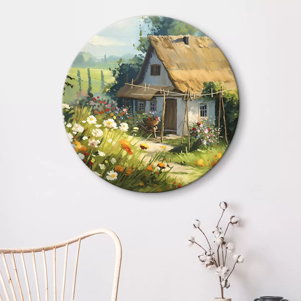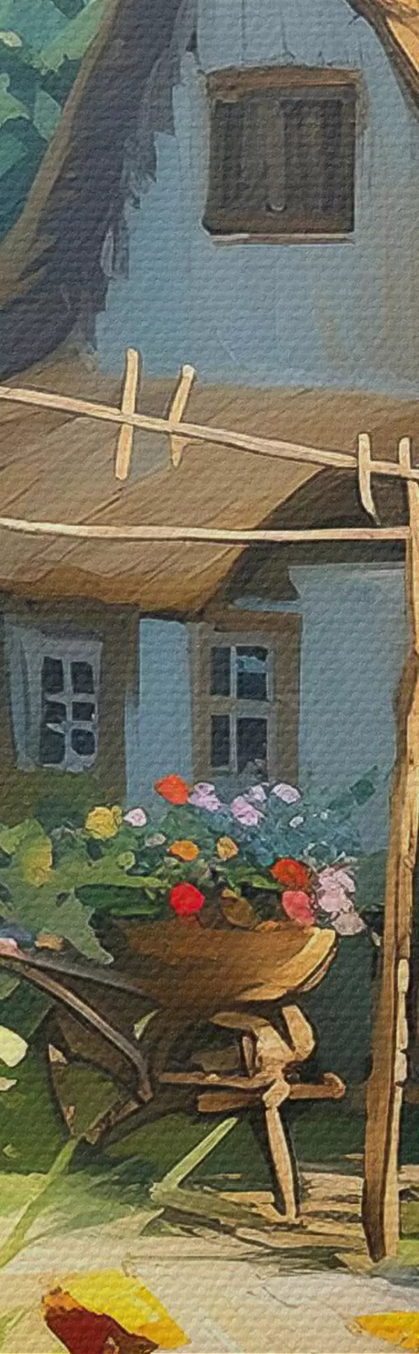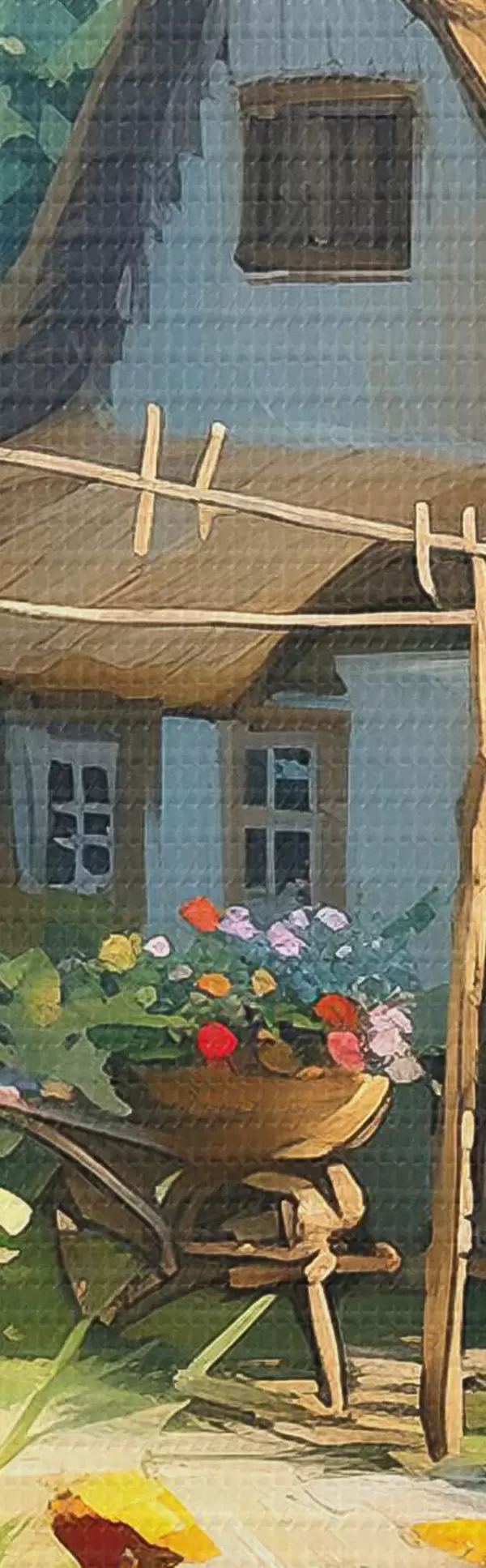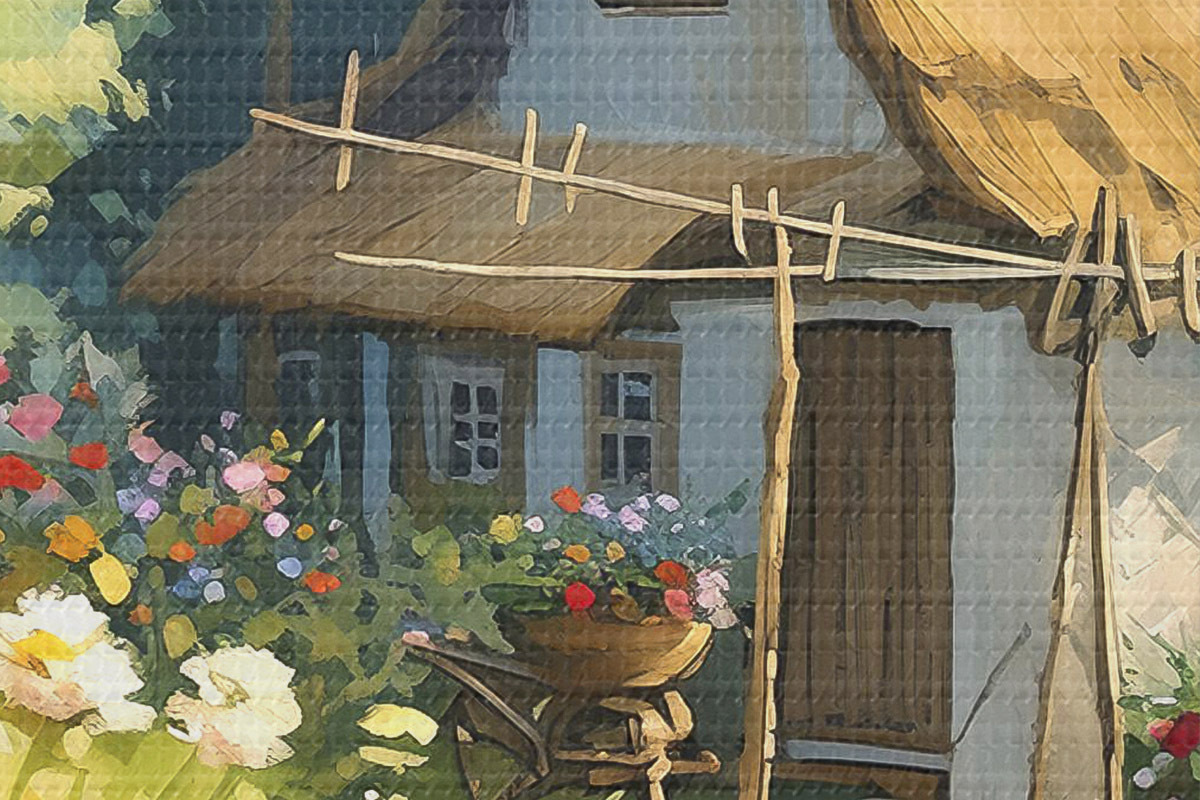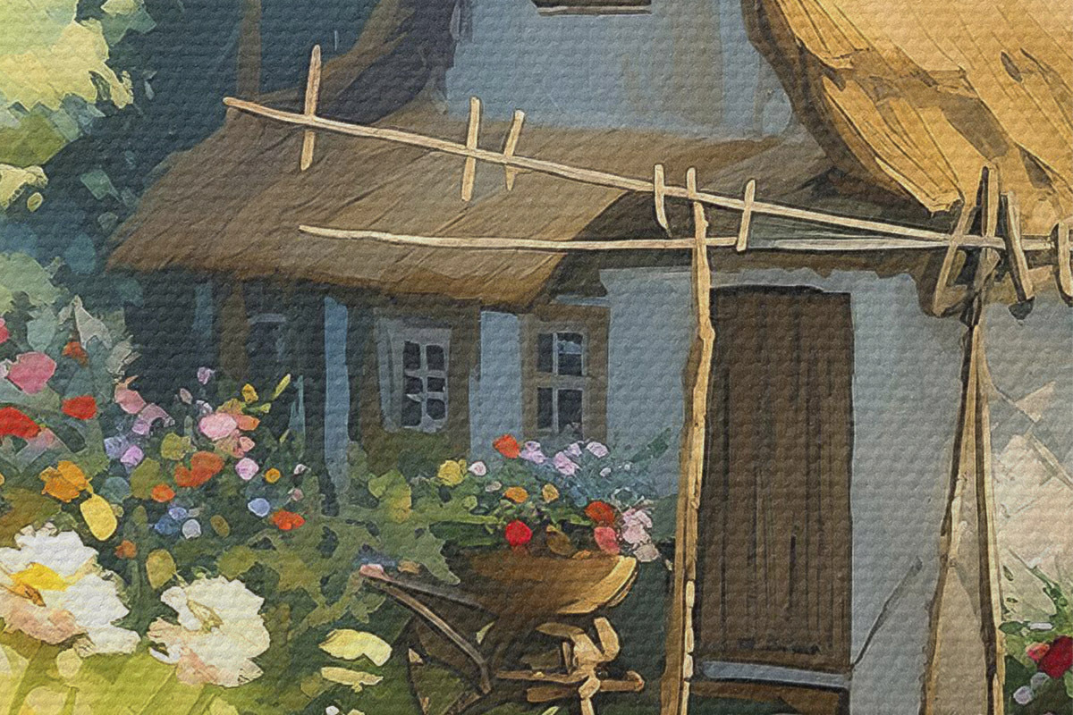Obrázek Vesnický dům se zahradou, letní květiny, olejová barva, tahy štětcem, pole, rustikální styl Nr r38491