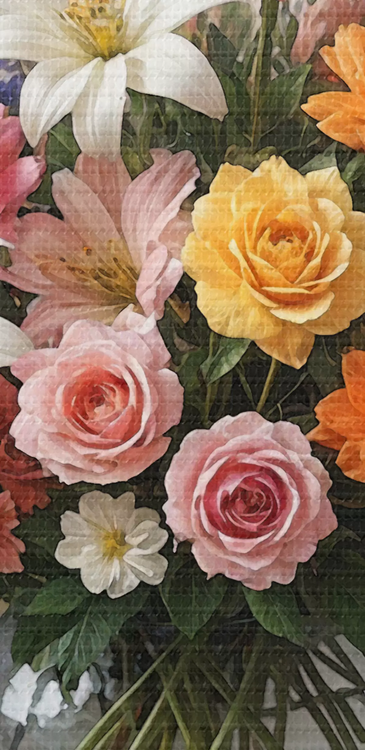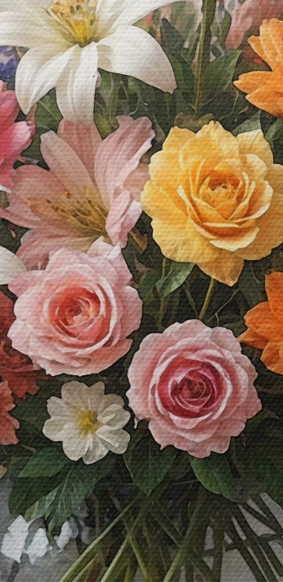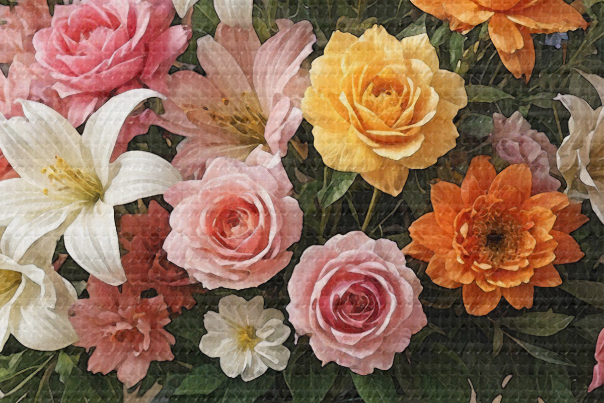 Obrázek Živá kytice různých barevných květin ve skleněné váze na bílém ubrusu umělecká malba vintage Nr r38825