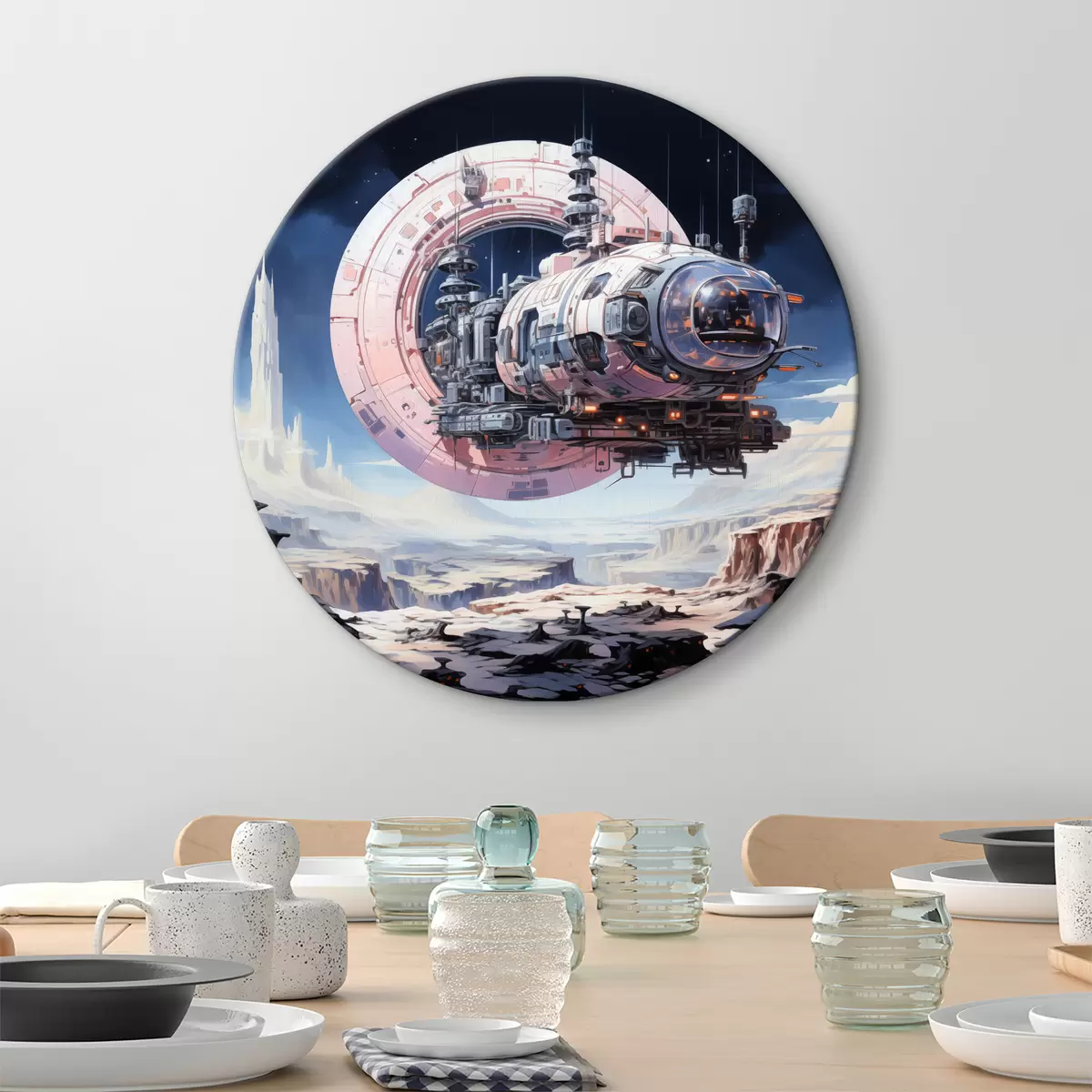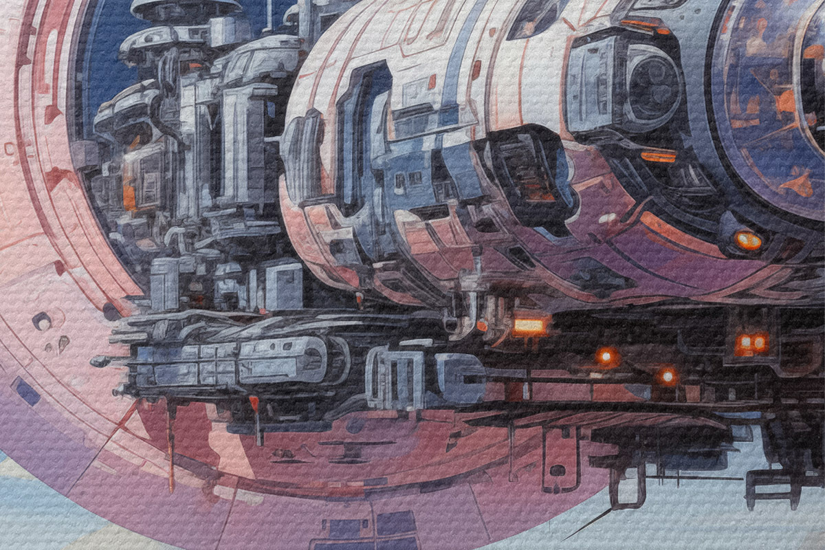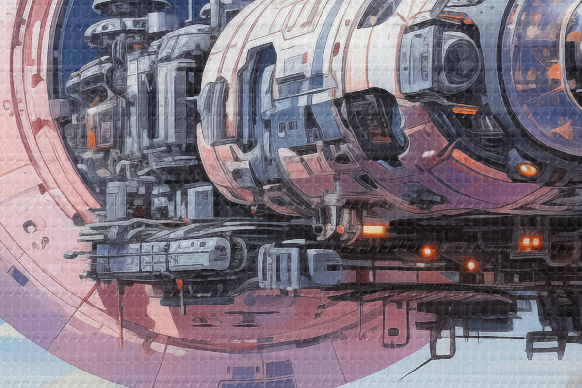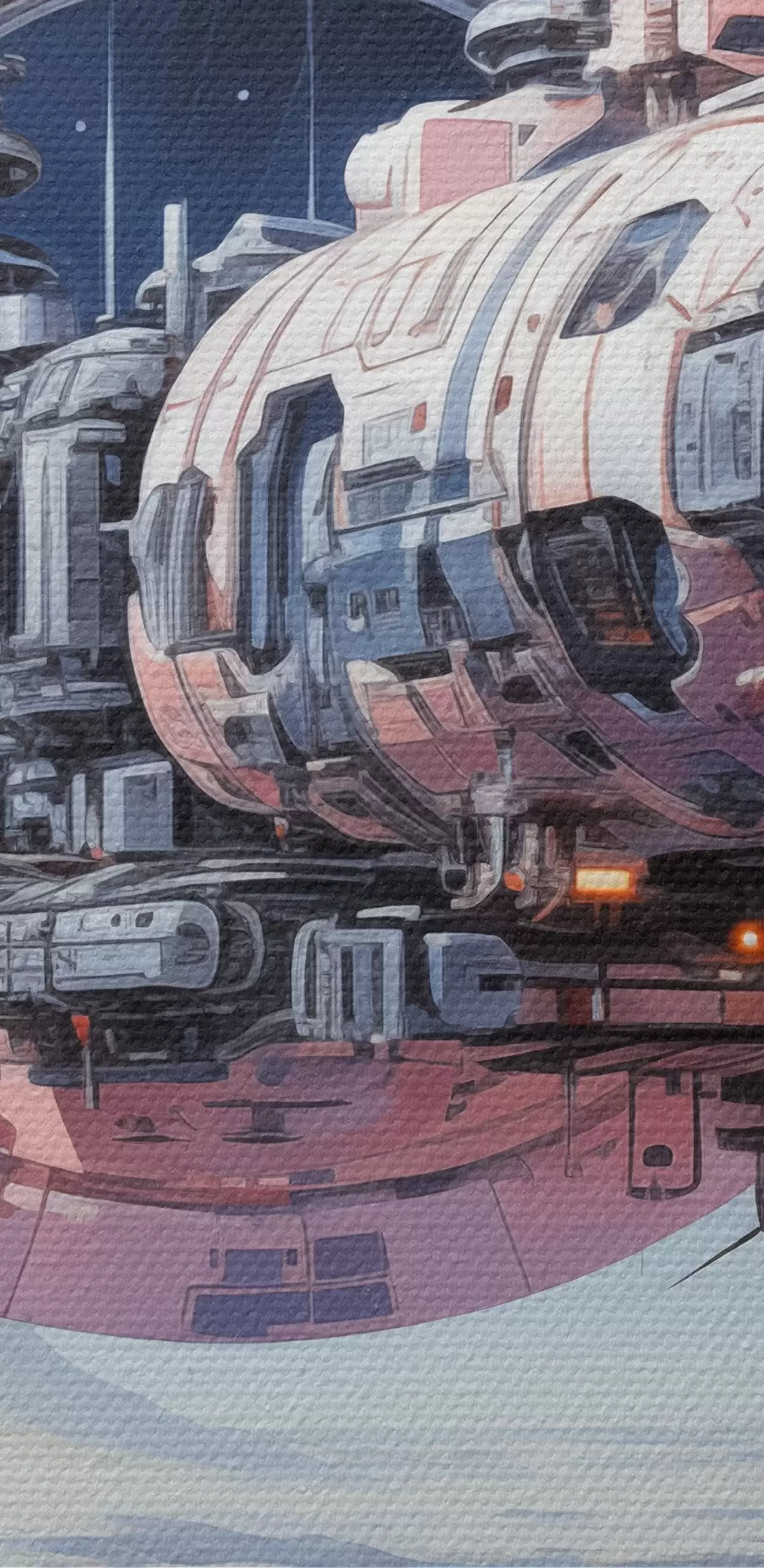 Obrázek Vesmírná loď v kyberpunkovém stylu letí ve vesmíru nad asteroidem a planetou, modrá, béžová, růžová, bílá barva Nr r39115