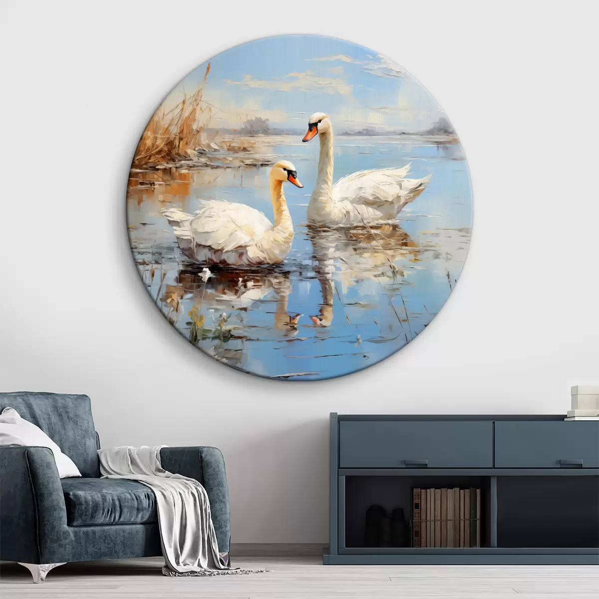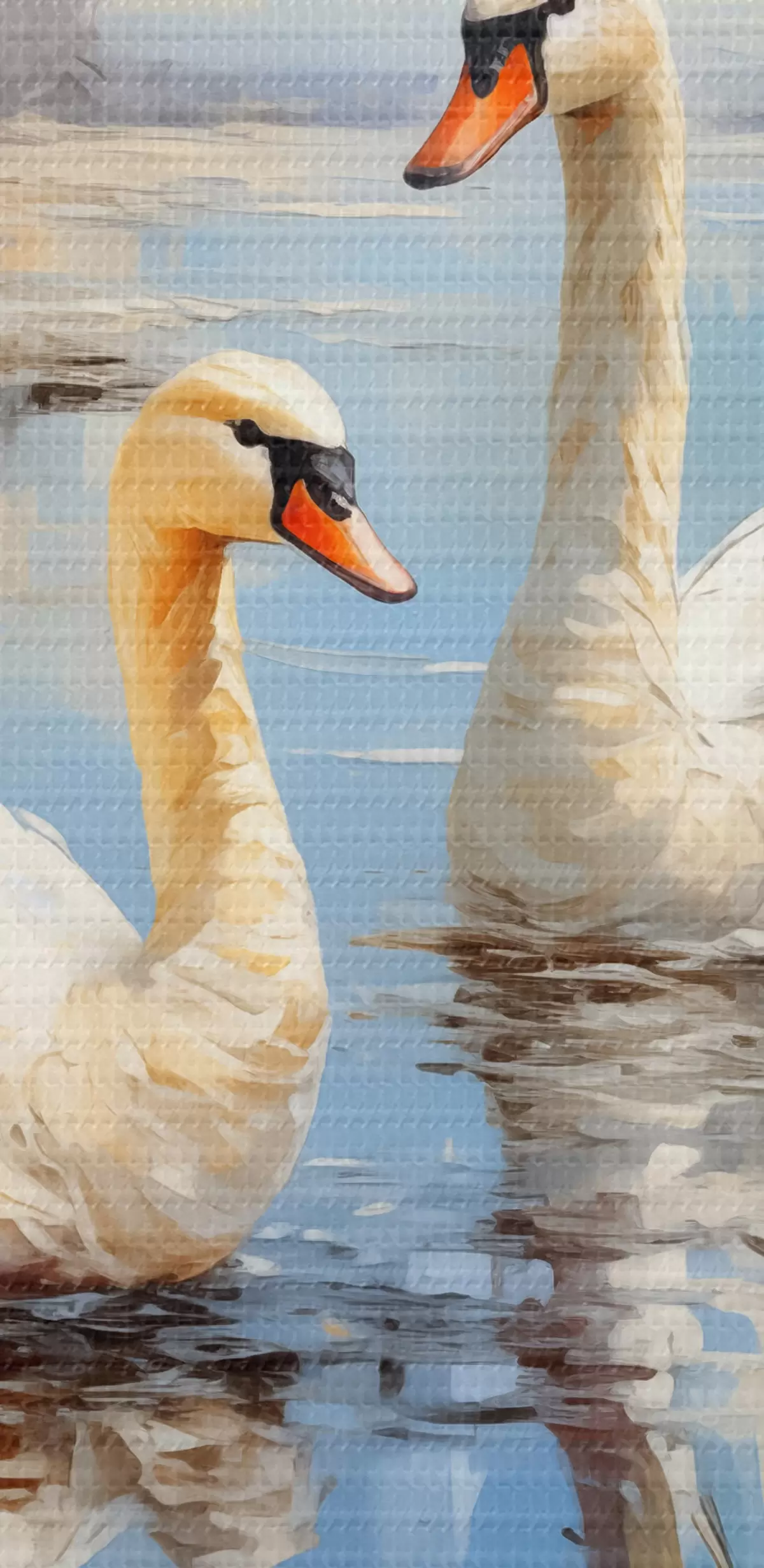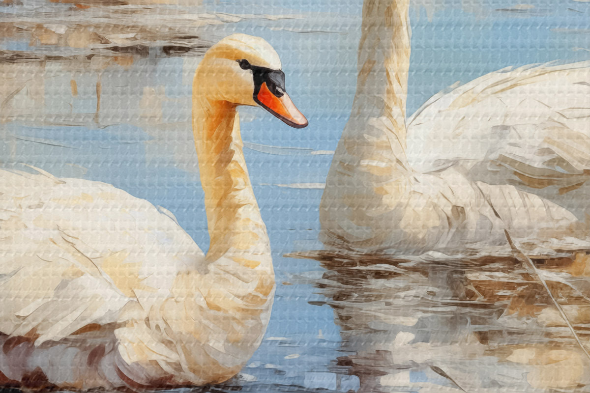 Obrázek Bílé husy plavou podél řeky mezi rákosím, modrá, bílá, béžová barva Nr r39130