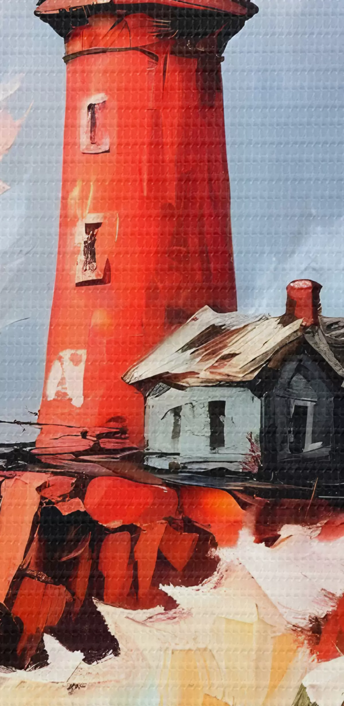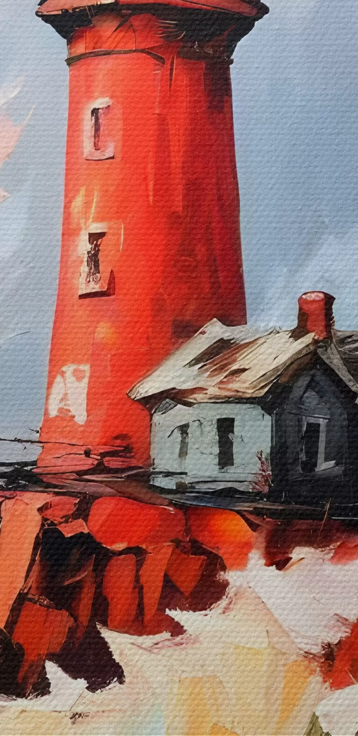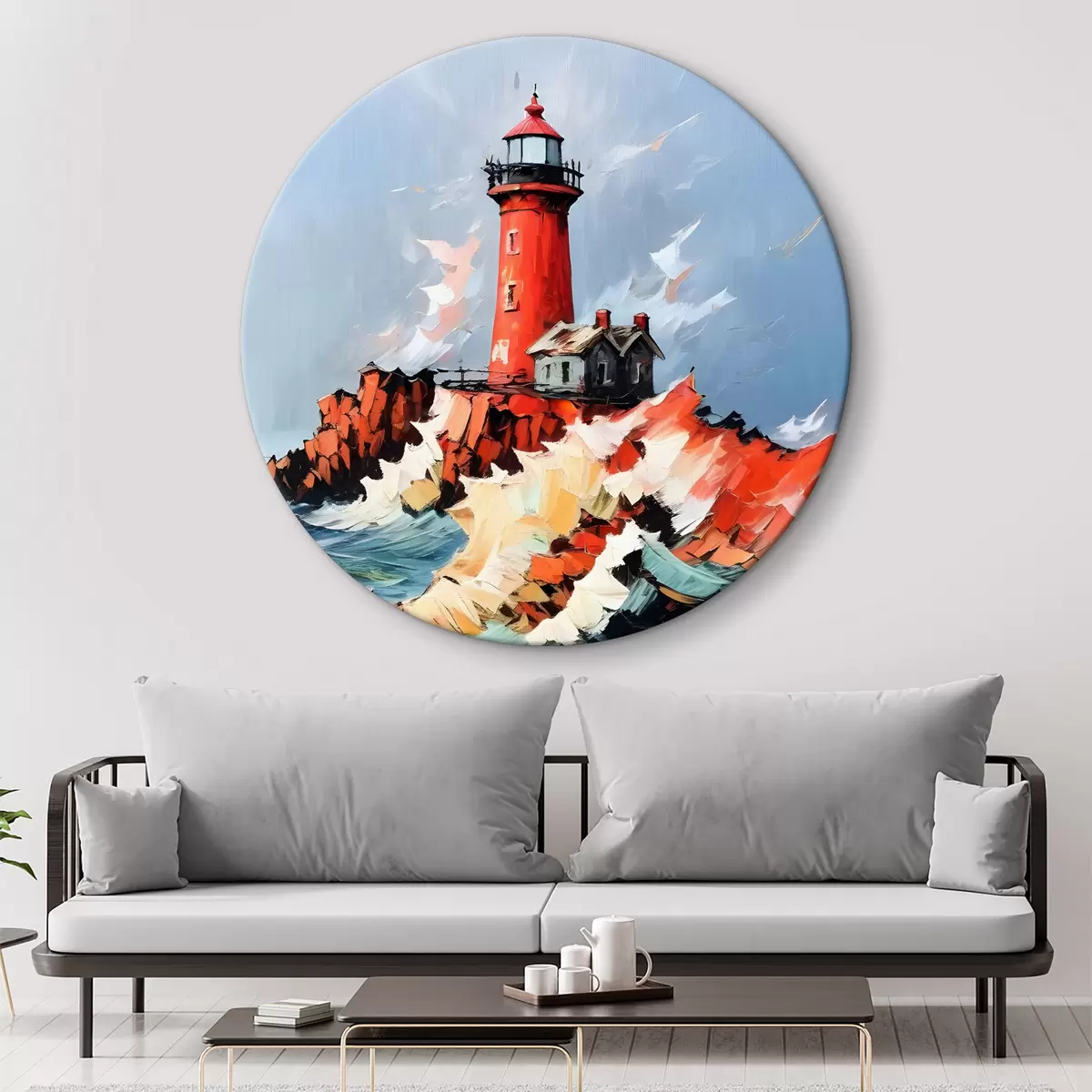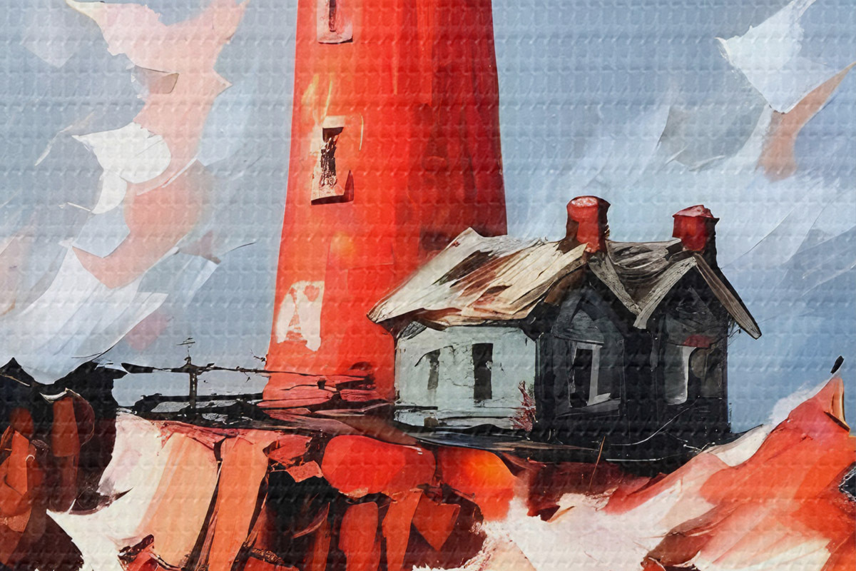 Obrázek Obraz červeného majáku stojícího vysoko na skalnatém útesu, obklopený burácejícími vlnami a bouřlivým nebem Nr r39392