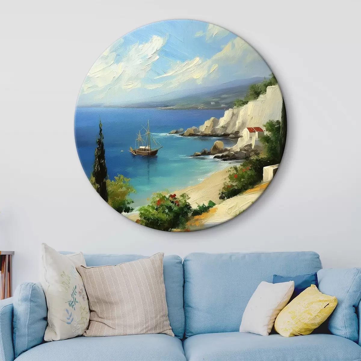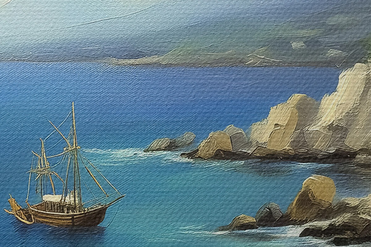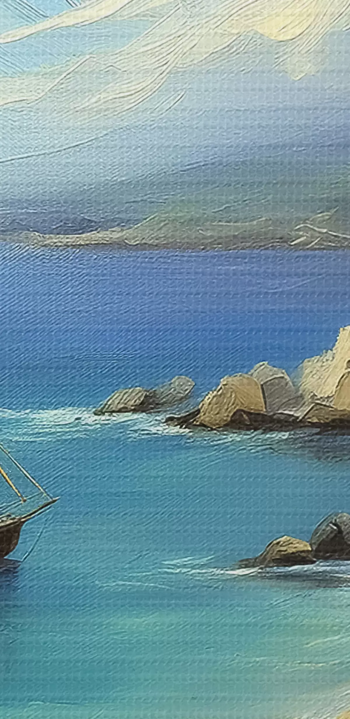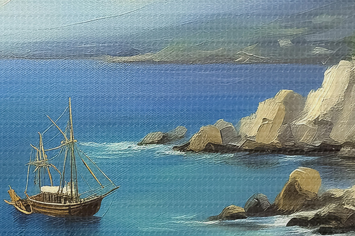 Obrázek Řecko mořské pobřeží, loď, modrá voda, olejomalba, letní příroda, skály, živé tahy štětcem Nr r39425