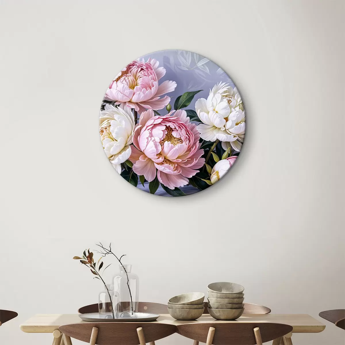 Obrázek Kytice velkých, svěžích růžových a bílých květů pivoňky se zelenými listy na měkkém, rozmazaném pozadí Nr r39514