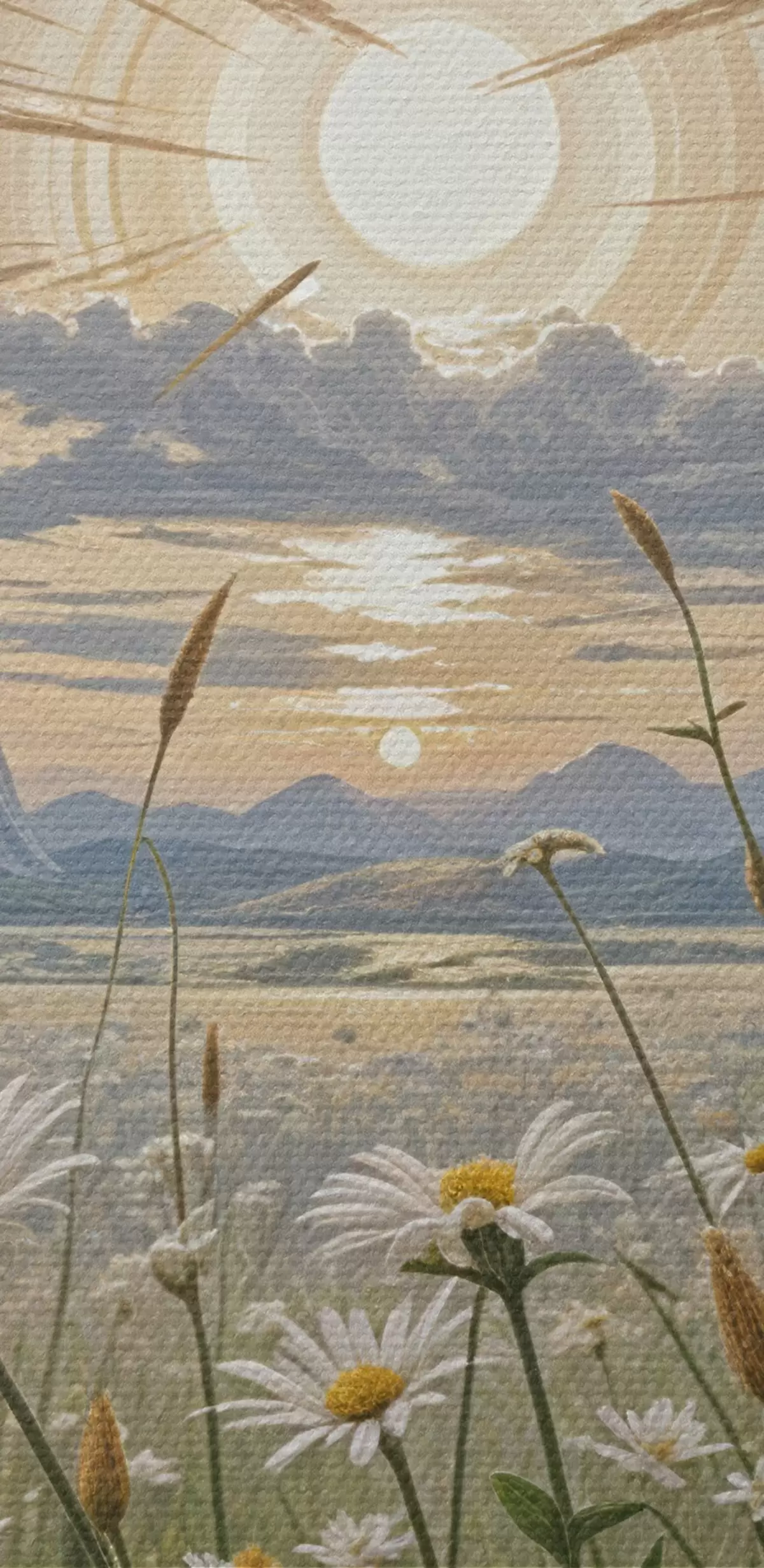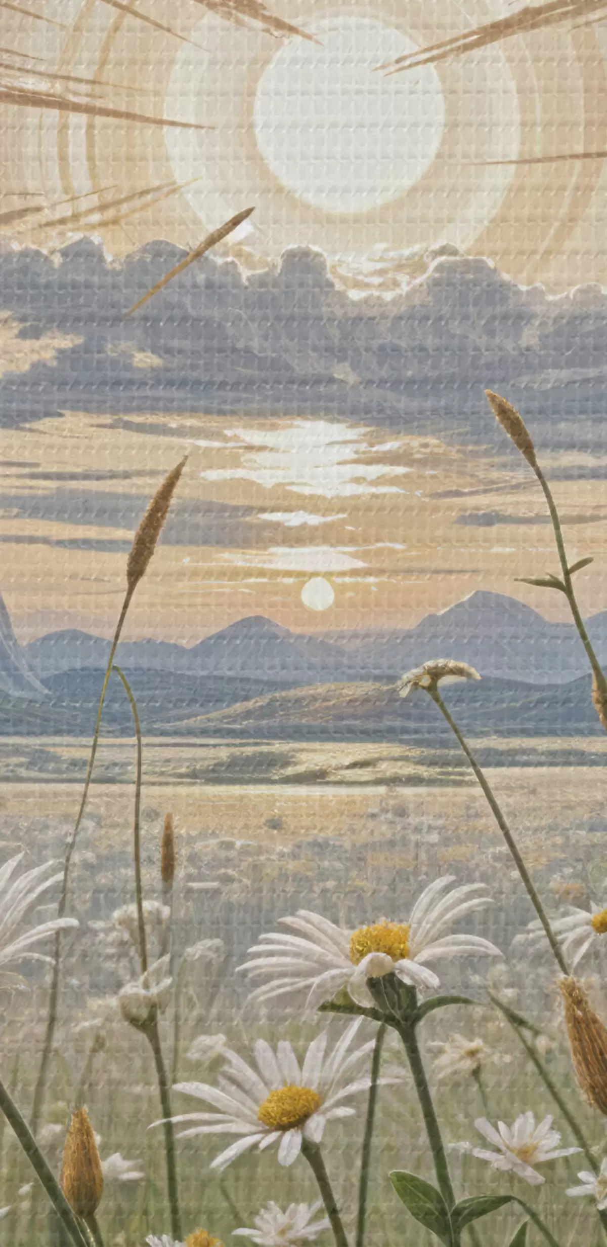 Obrázek Pole bílých květů sedmikrásky v popředí s krajinou hor a zataženou oblohou Nr r39528