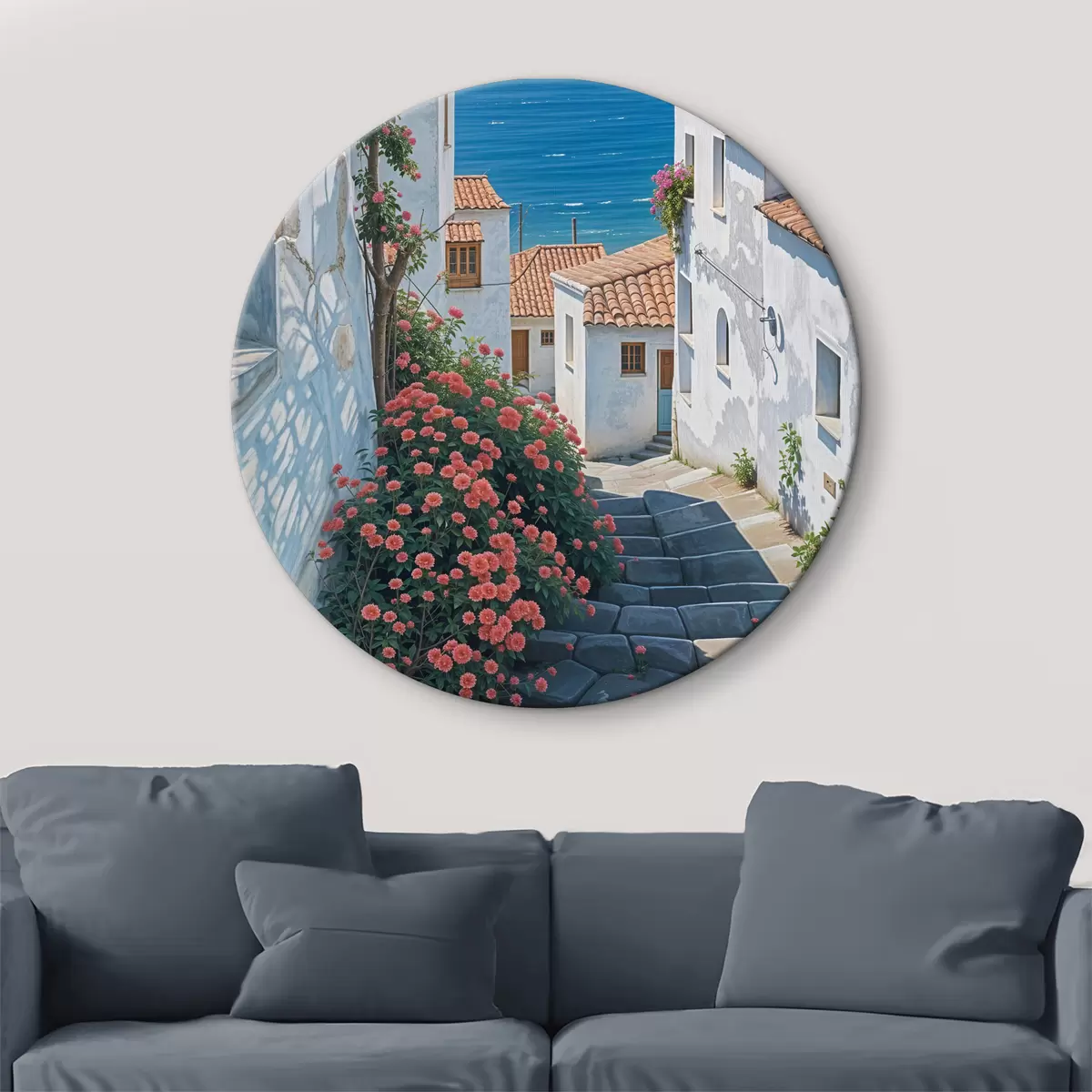 Kulaté obrazy Úzká ulička v pobřežním městě s bílými budovami, červenými taškami a zářivými růžovými květy r39532