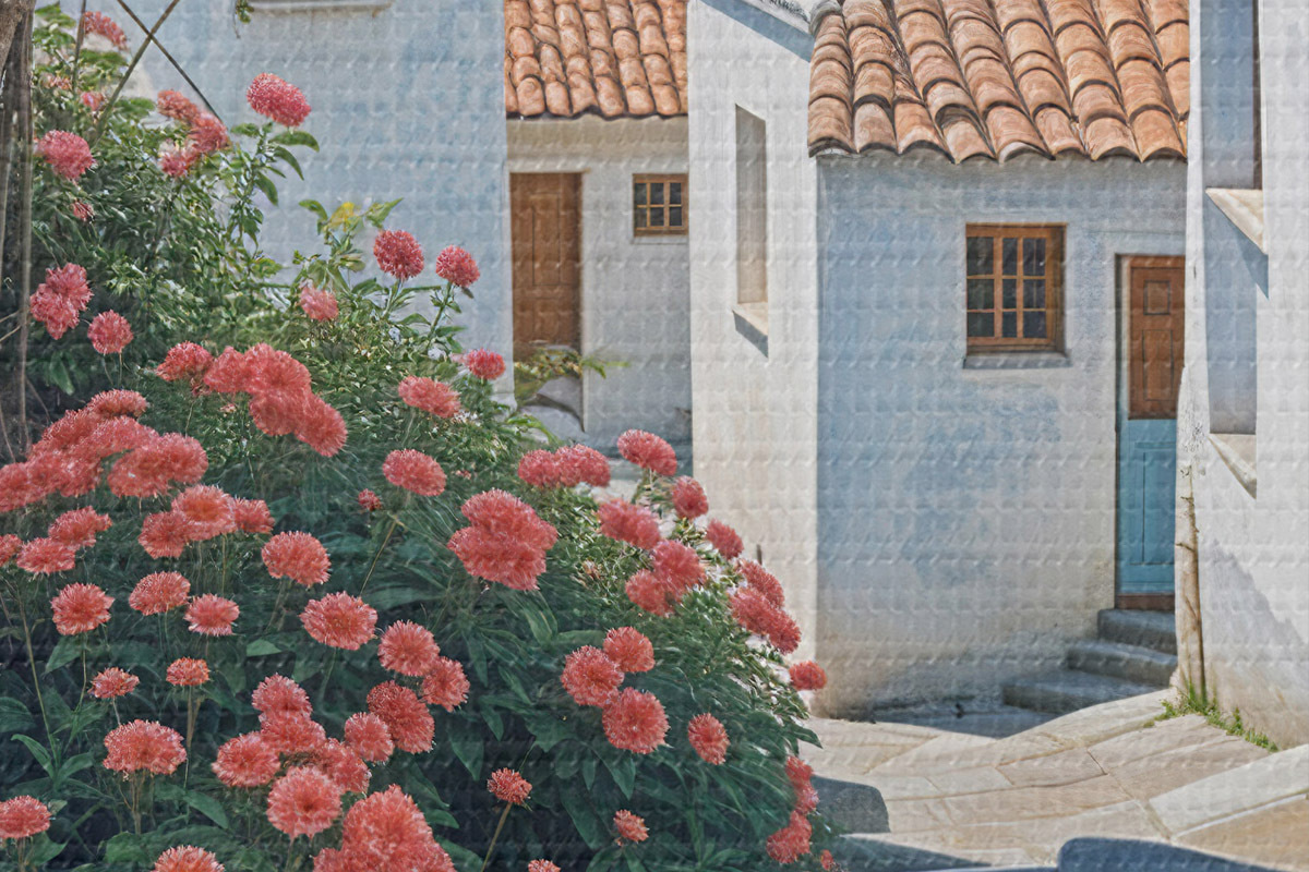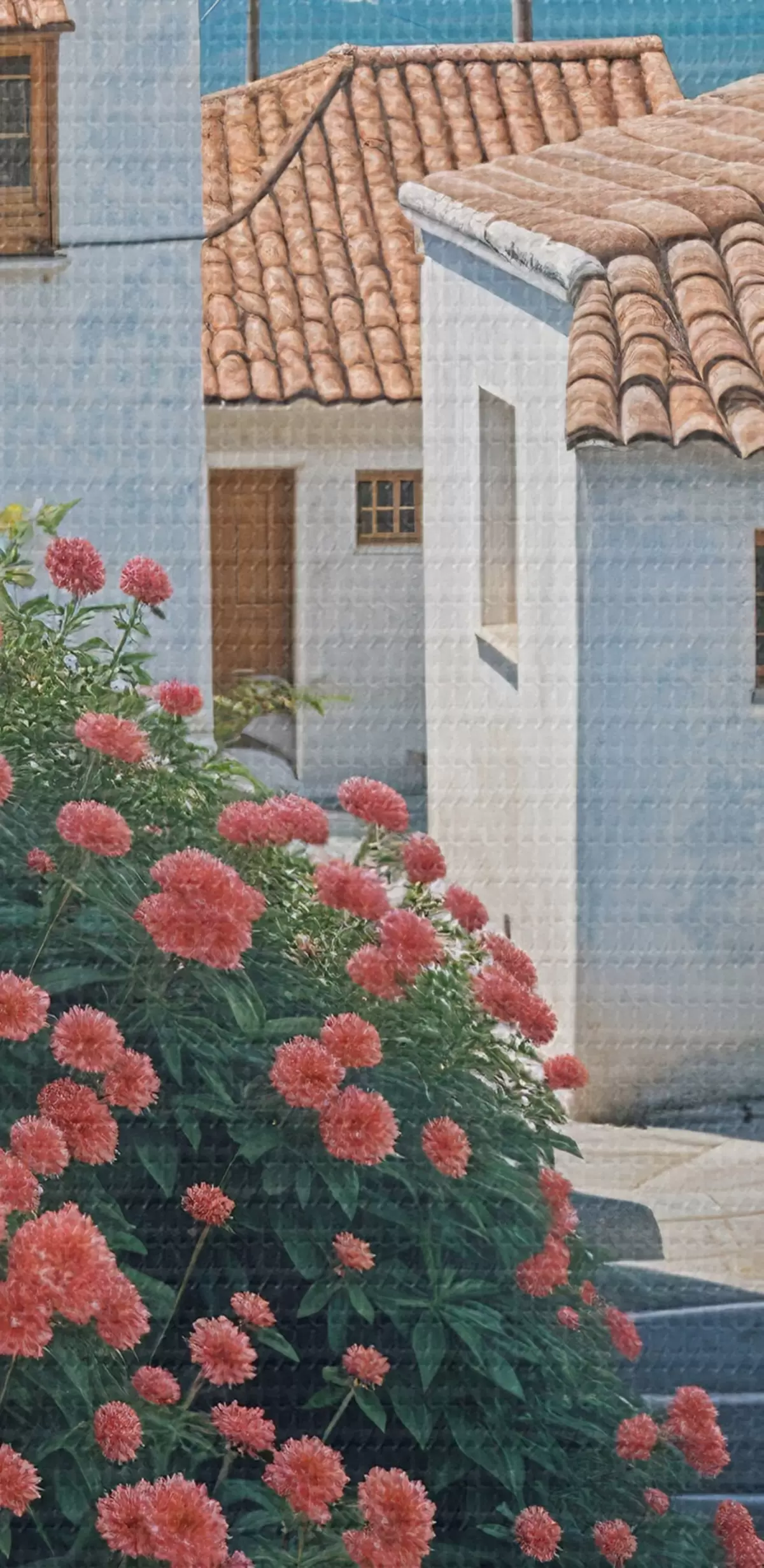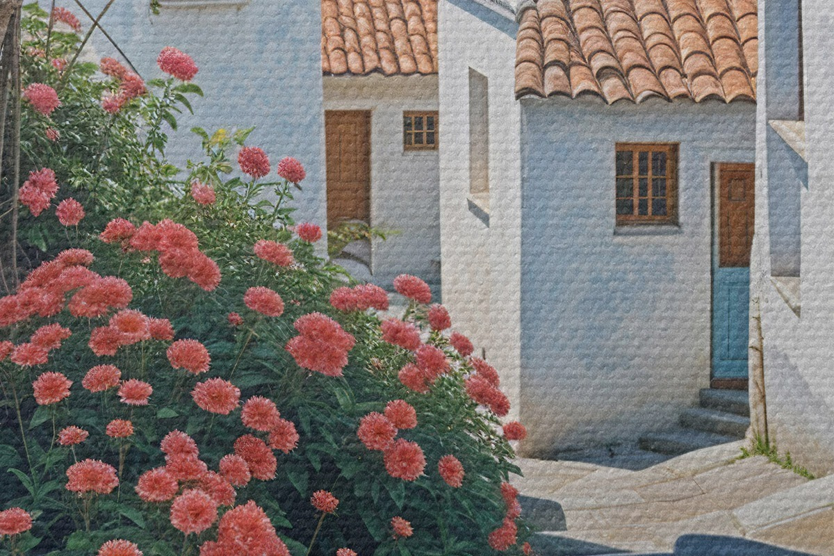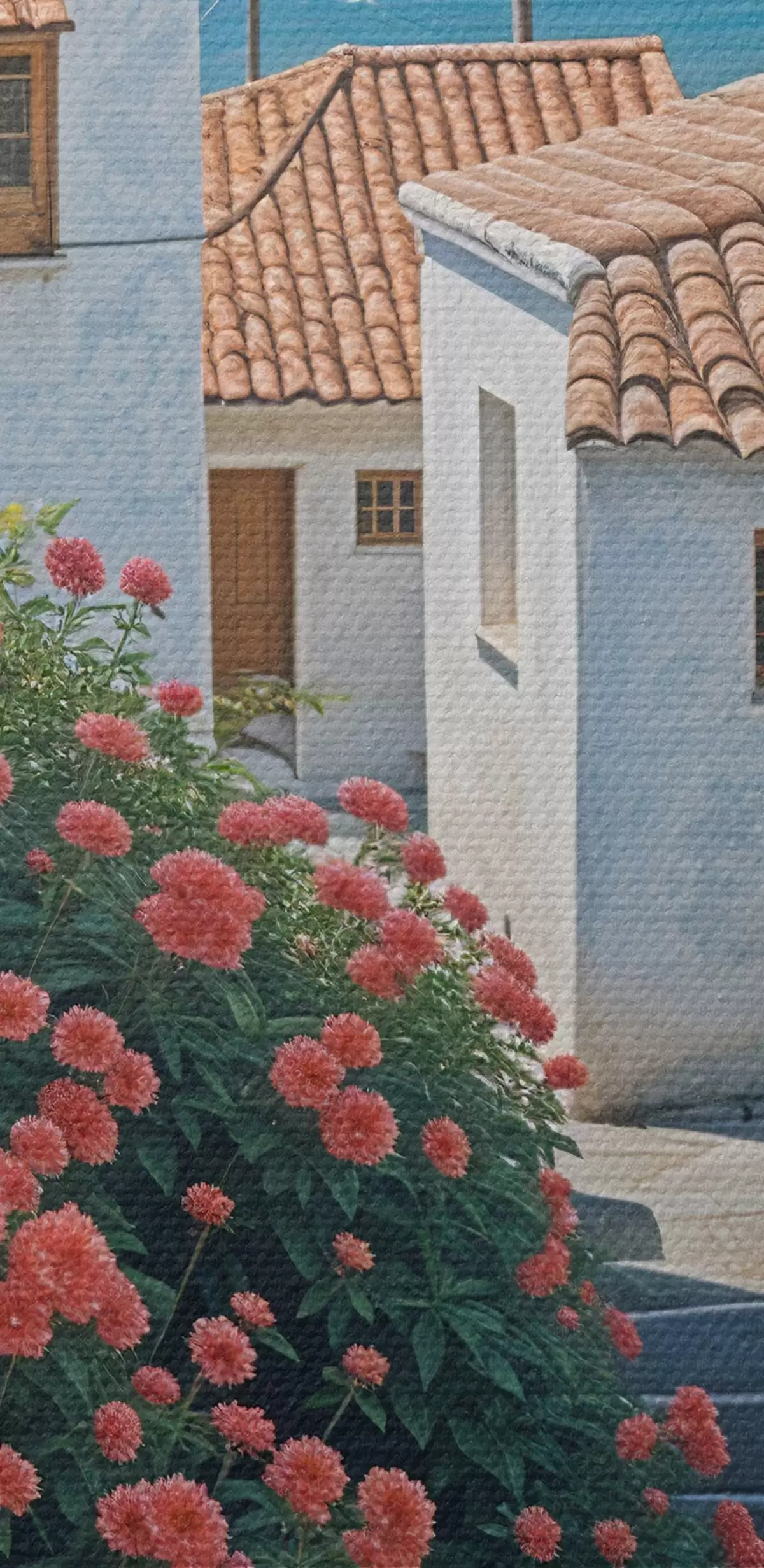 Obrázek Úzká ulička v pobřežním městě s bílými budovami, červenými taškami a zářivými růžovými květy Nr r39532