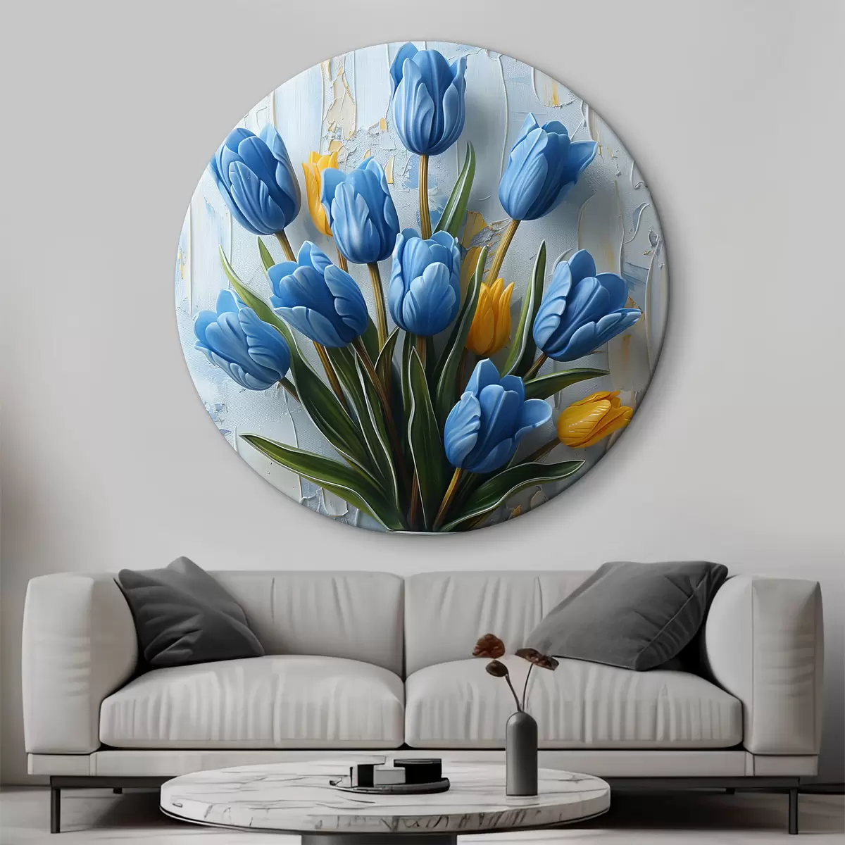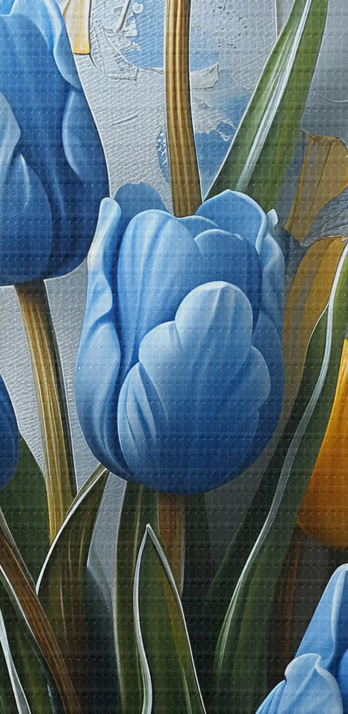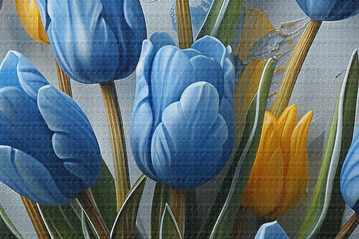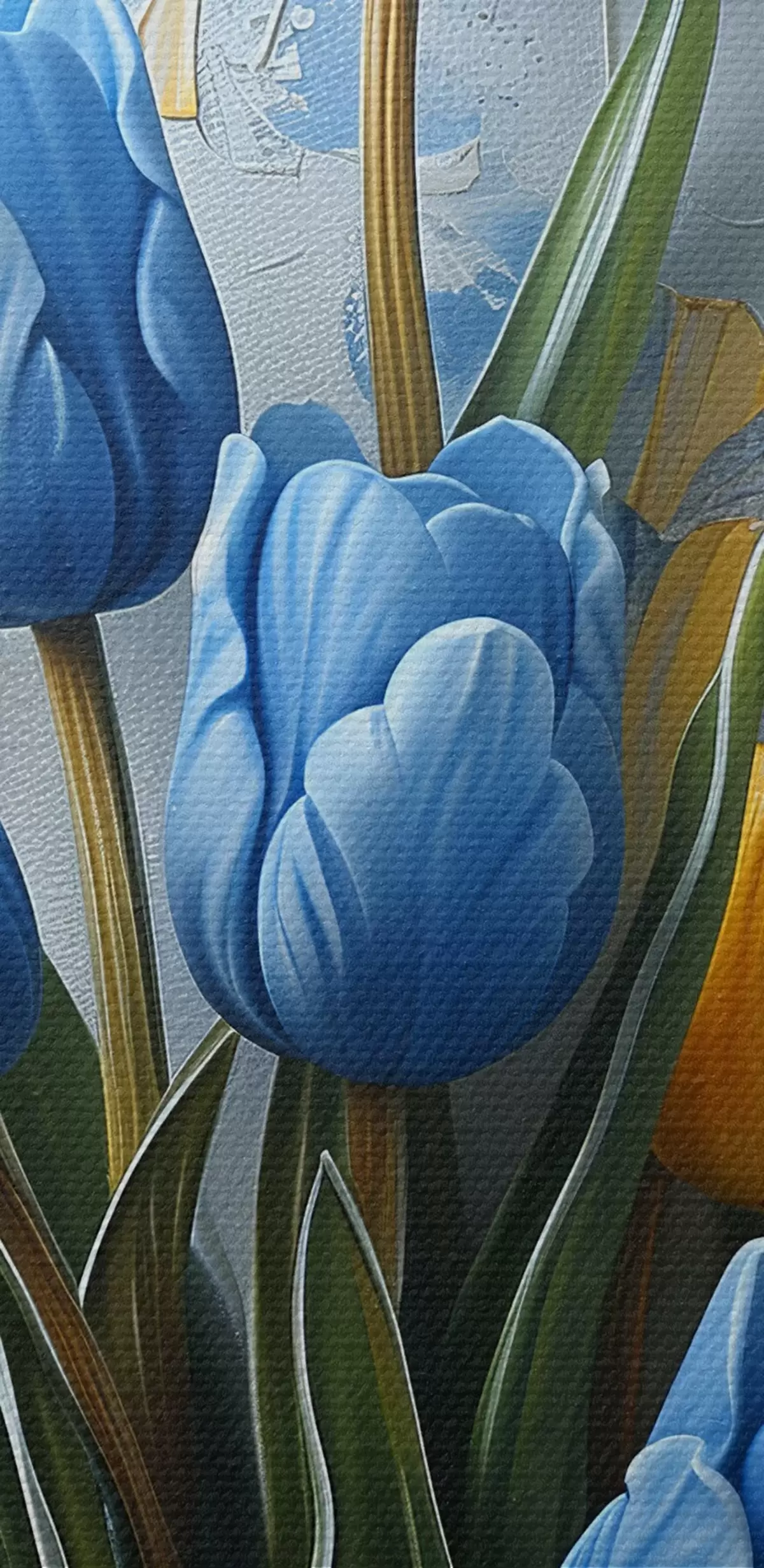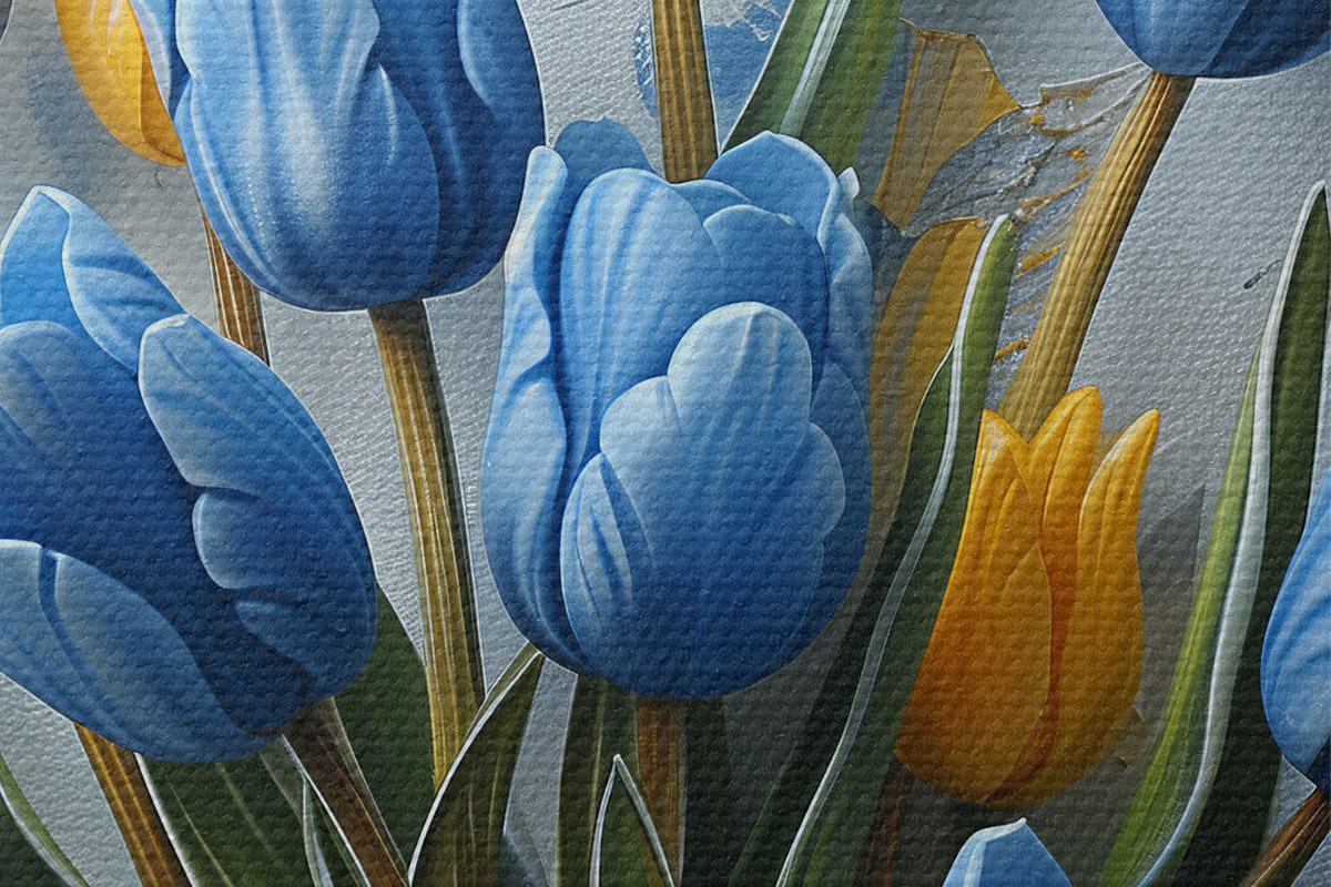 Obrázek Modré a žluté tulipány ve 3D: elegantní olejomalovaný nástěnný obraz s bílým a světle modrým pozadím a rytou vázou Nr r39637