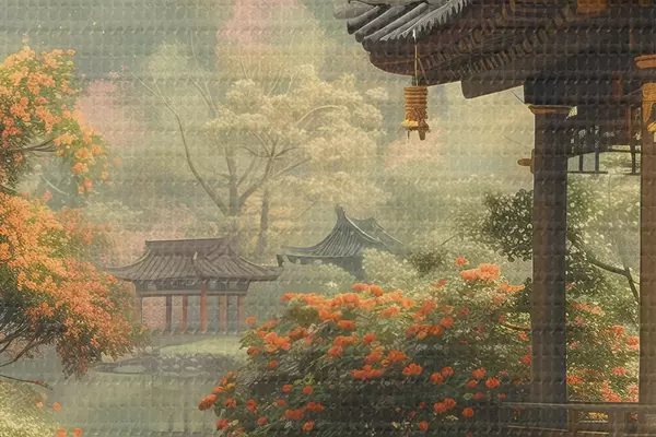 Obrázek Japonský park s kvetoucími stromy a květinami, les, zahradní domek, jezero Nr r39772