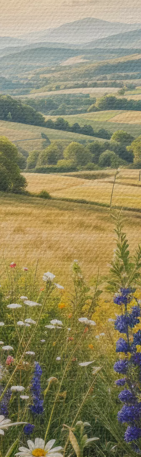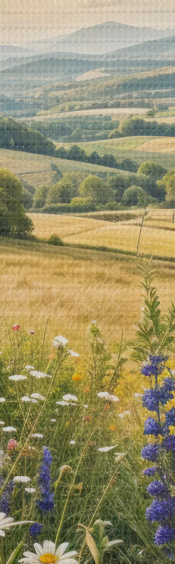 Obrázek Svěží venkovská krajina s pulzující divokou loukou plnou barevných květin pod zataženou oblohou Nr r40018