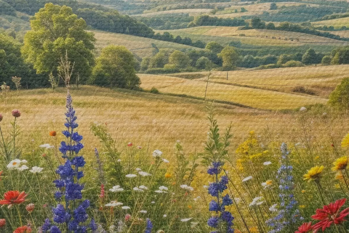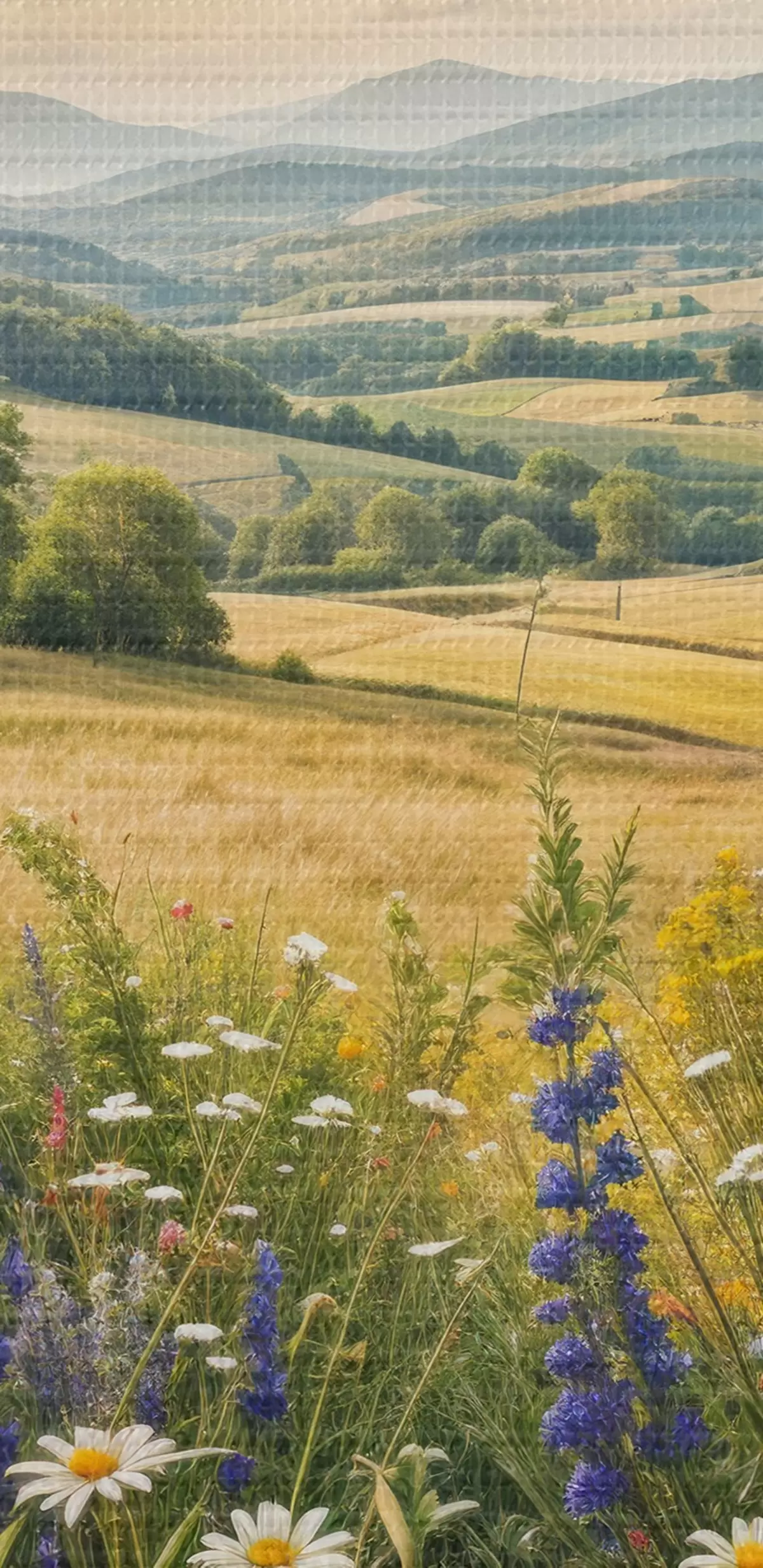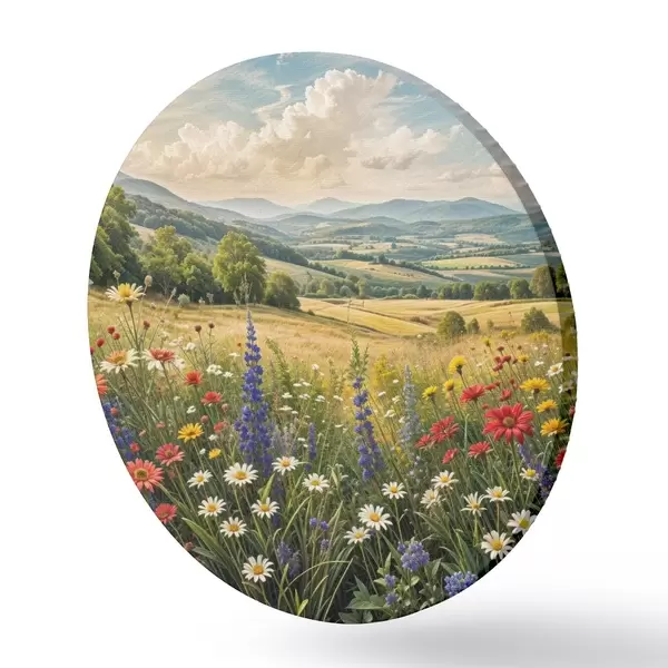 Obrázek Svěží venkovská krajina s pulzující divokou loukou plnou barevných květin pod zataženou oblohou Nr r40018