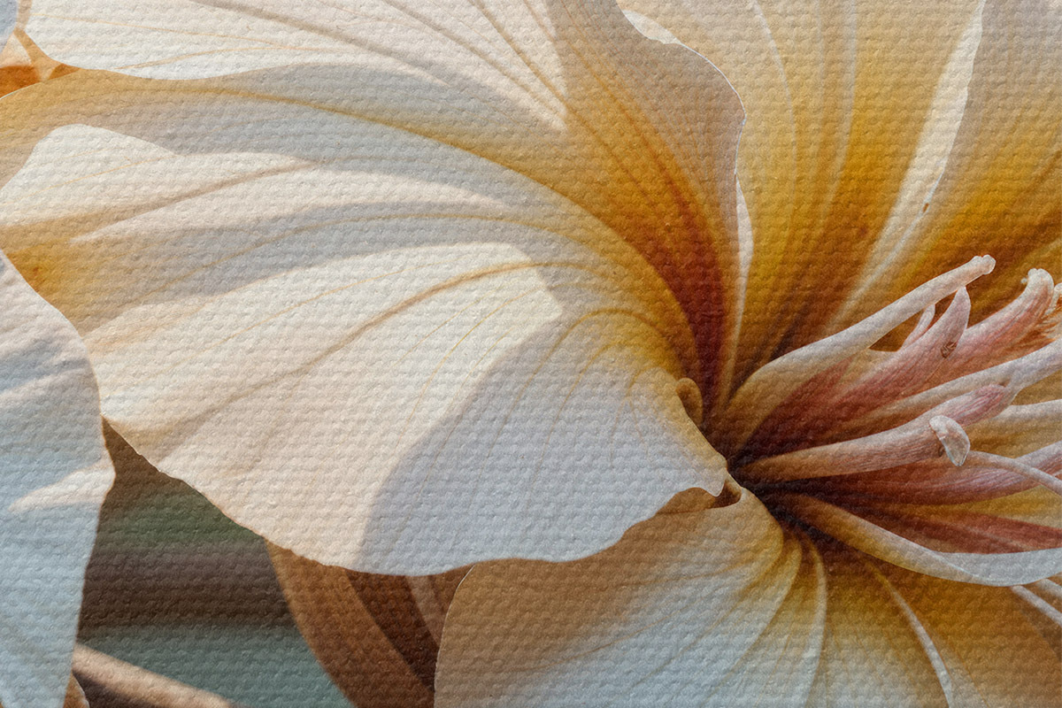 Obrázek Bílé a oranžové květy ibišku v květu, s rozostřeným pozadím Nr r40035
