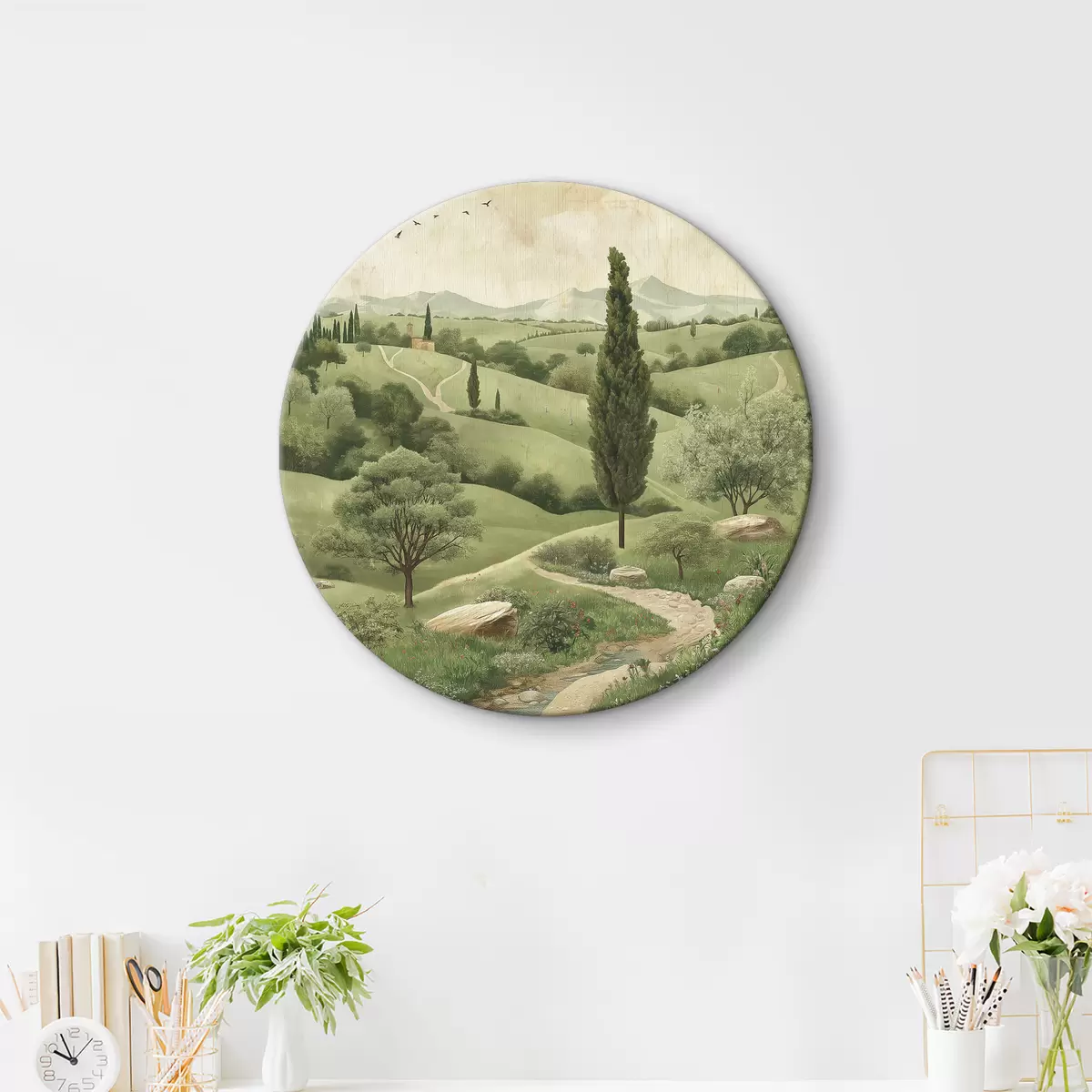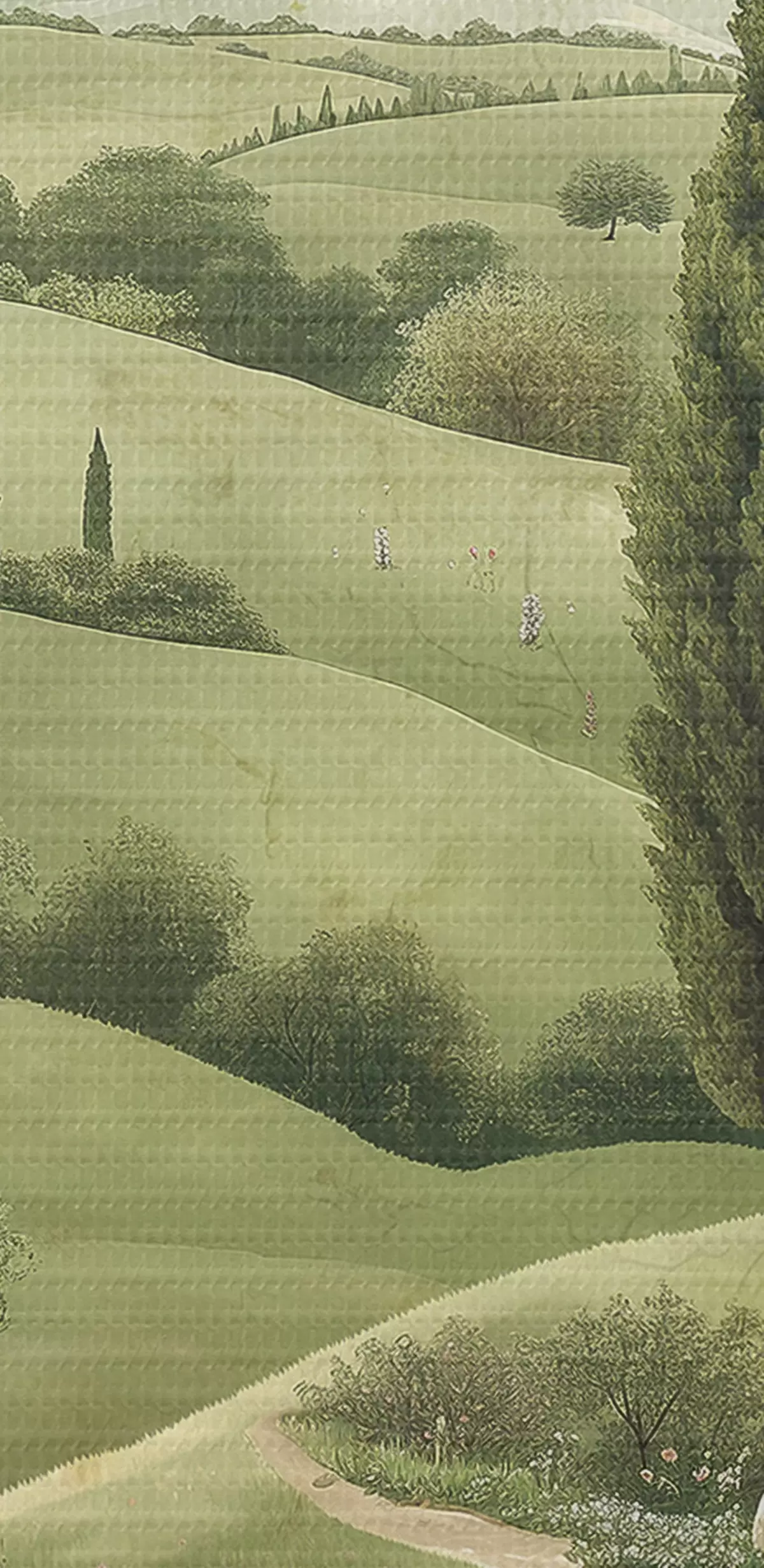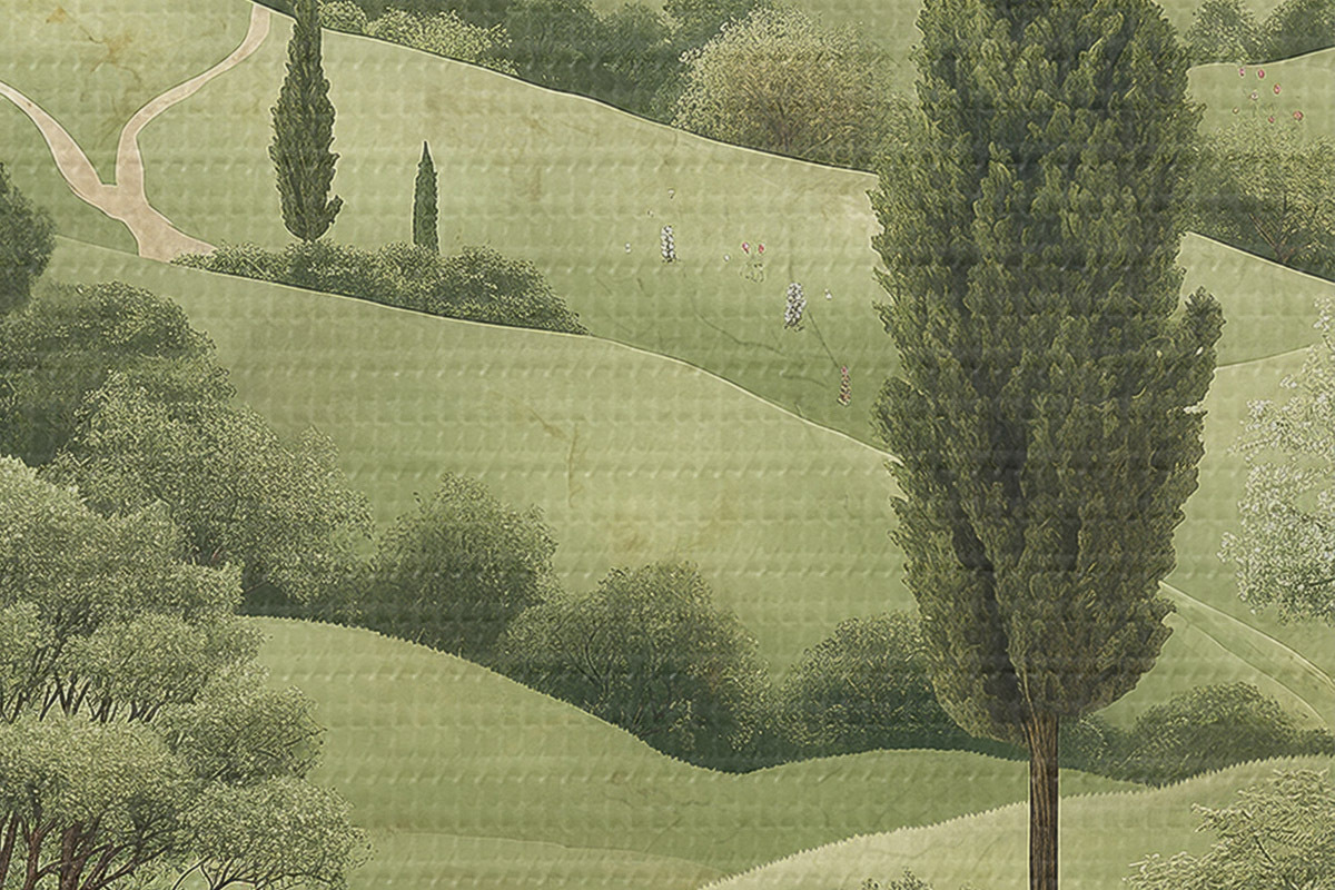 Obrázek Toskánská krajina, vintage styl, pastelově zelené barvy, kopce a stromy Nr r40075