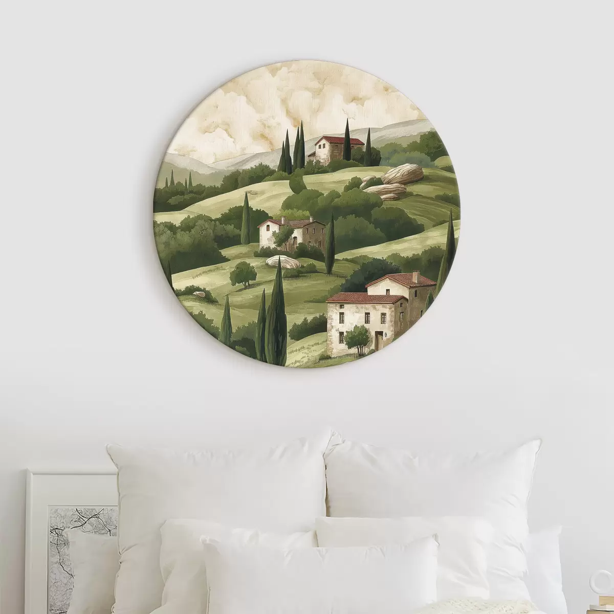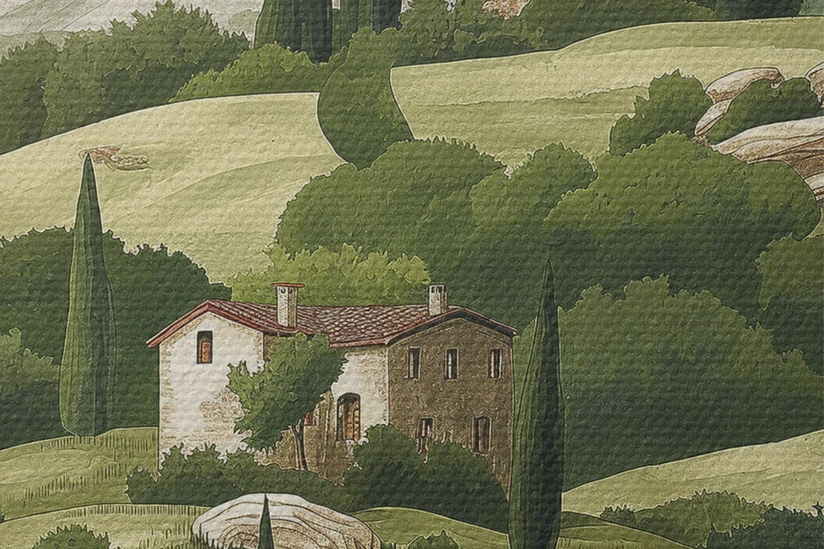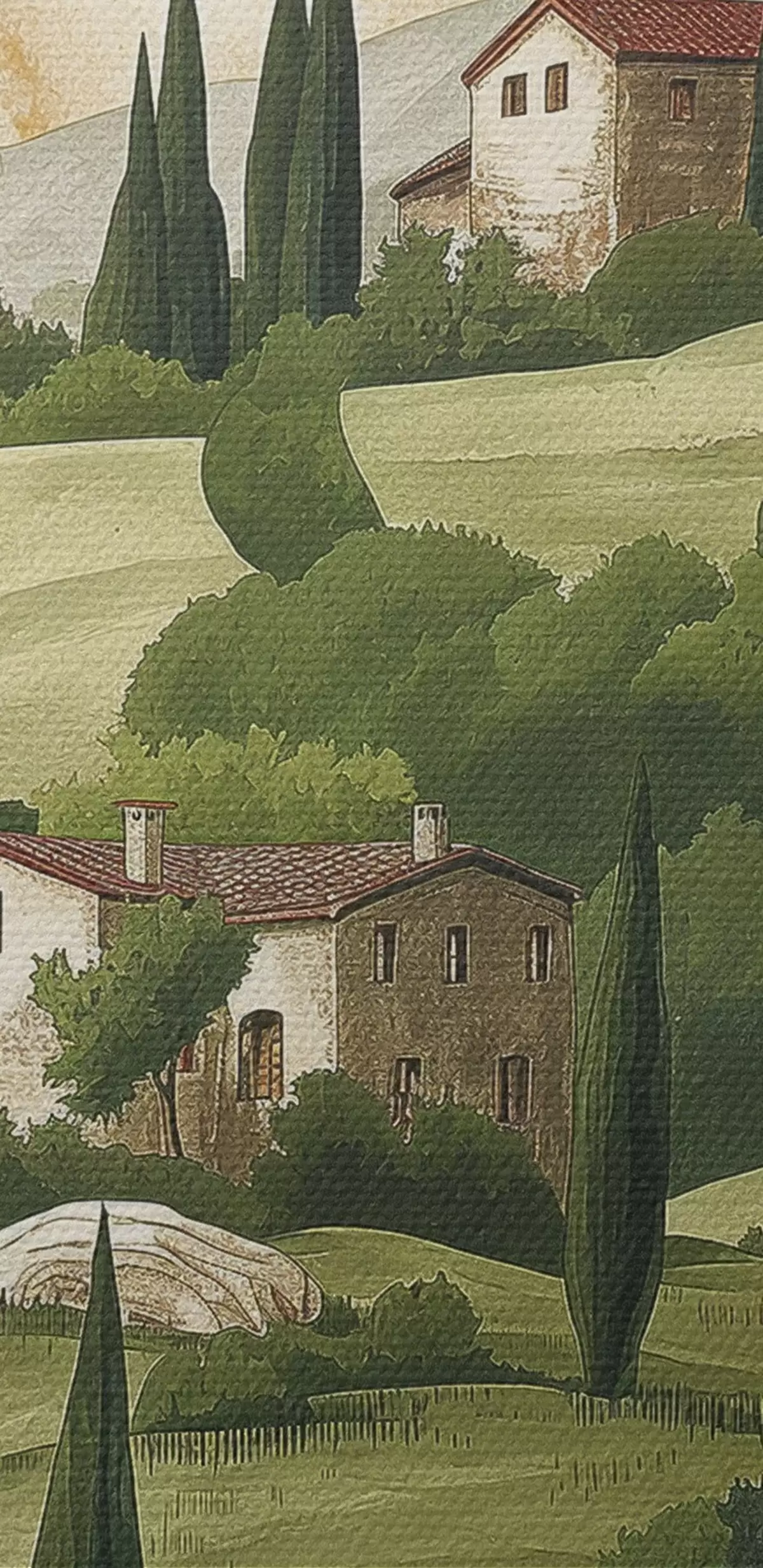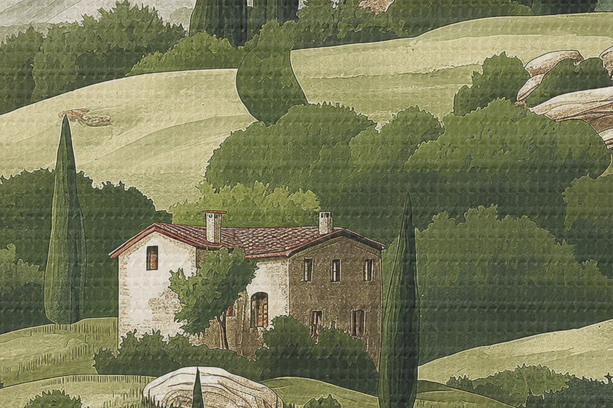 Obrázek Krajina s vintage domy, pastelově zelené barvy, akrylová kresba, rustikální Nr r40080