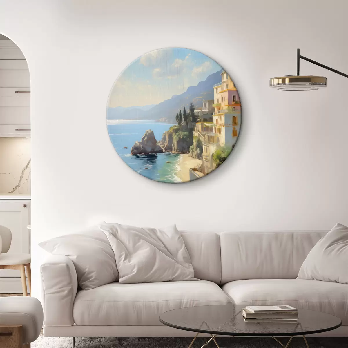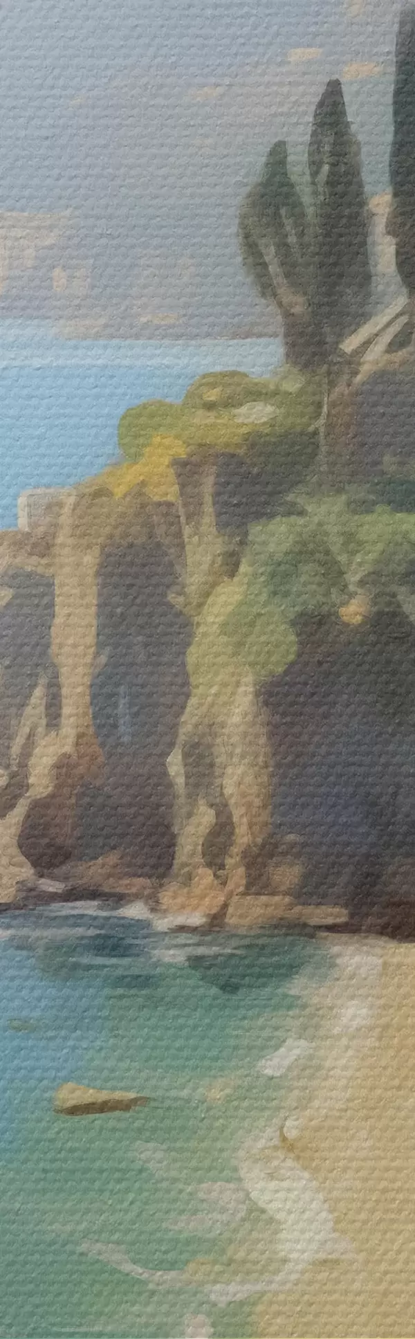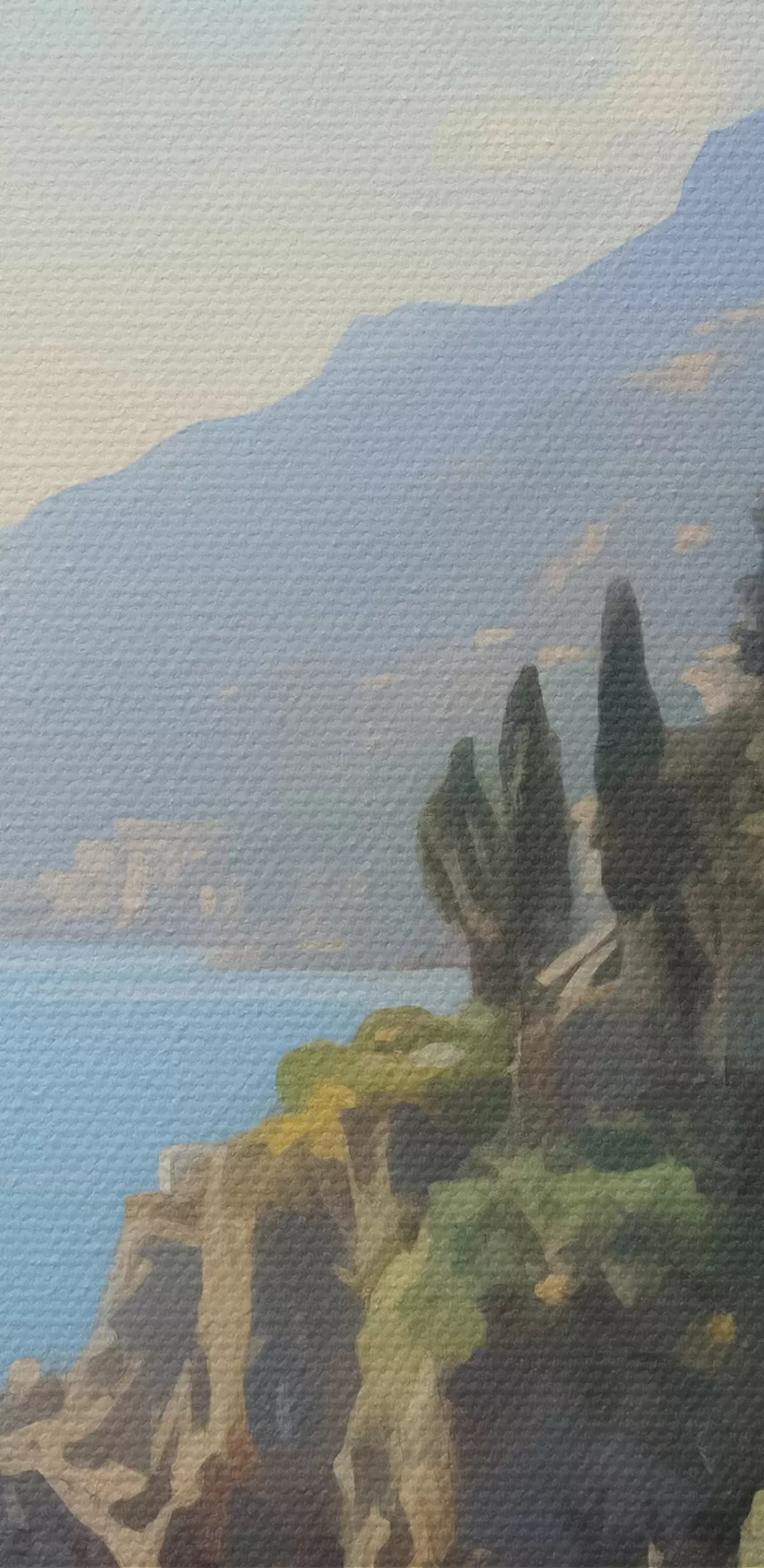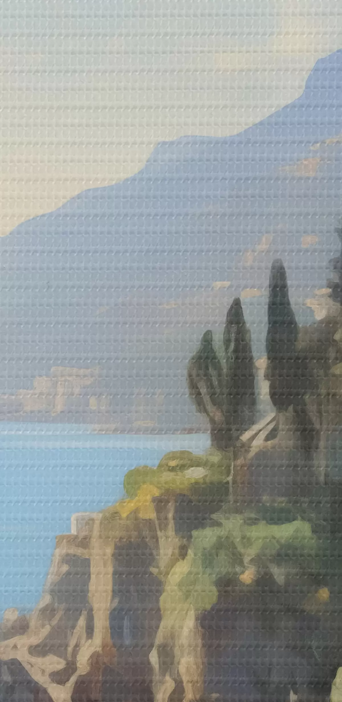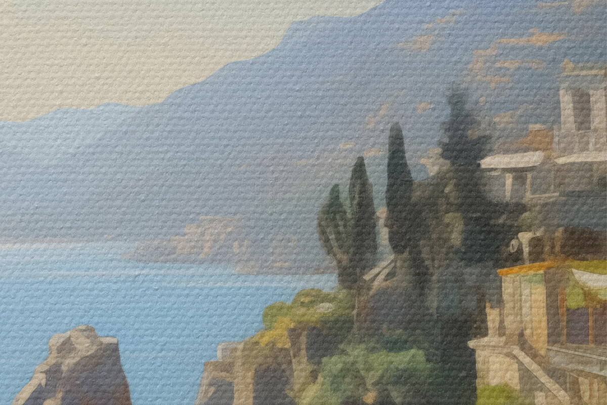Obrázek Pohled na mořský záliv, hory v Itálii z hotelové imitace olejomalby Nr r40088
