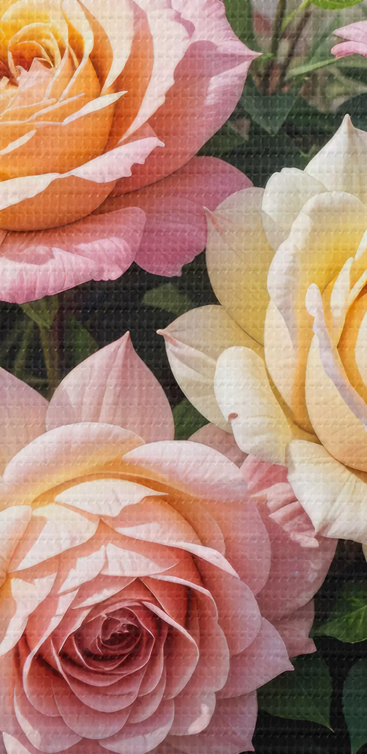 Obrázek Kytice barevných růží v různých odstínech růžové, žluté a oranžové, aranžovaná se zelenými listy Nr r40149