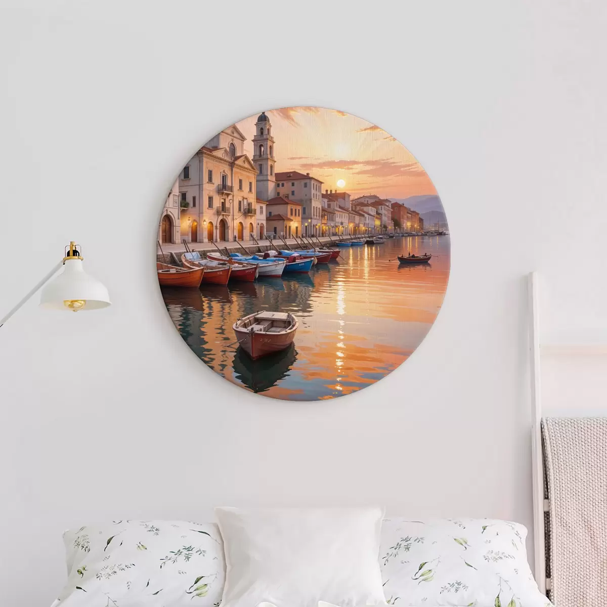 Obrázek Italské pobřežní město při západu slunce s barevnými budovami lemujícími nábřeží a čluny plujícími v klidných vodách Nr r40150