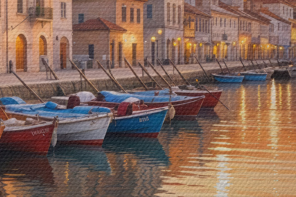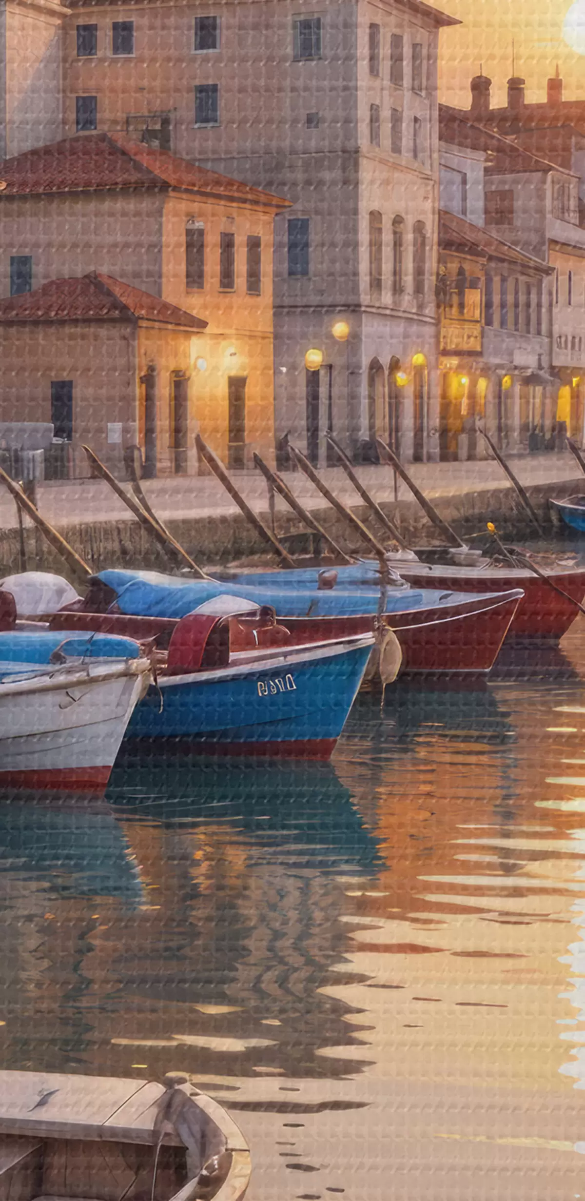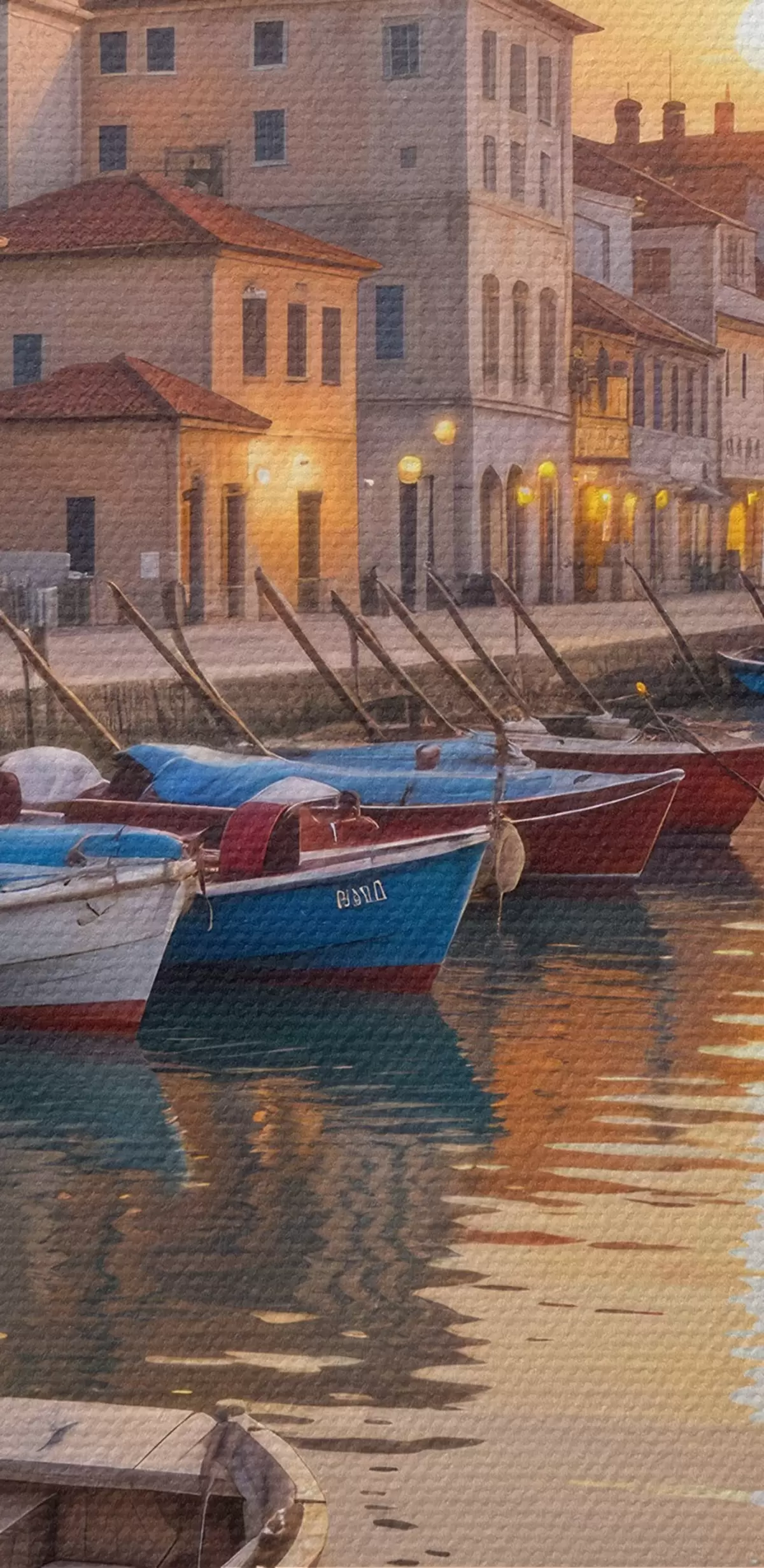 Obrázek Italské pobřežní město při západu slunce s barevnými budovami lemujícími nábřeží a čluny plujícími v klidných vodách Nr r40150