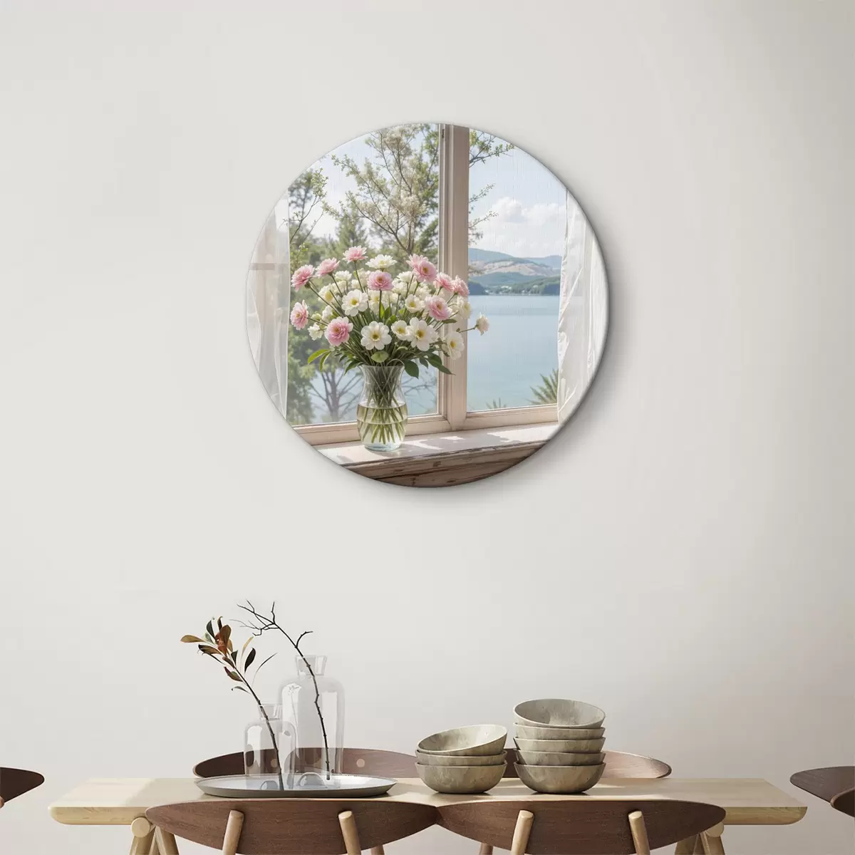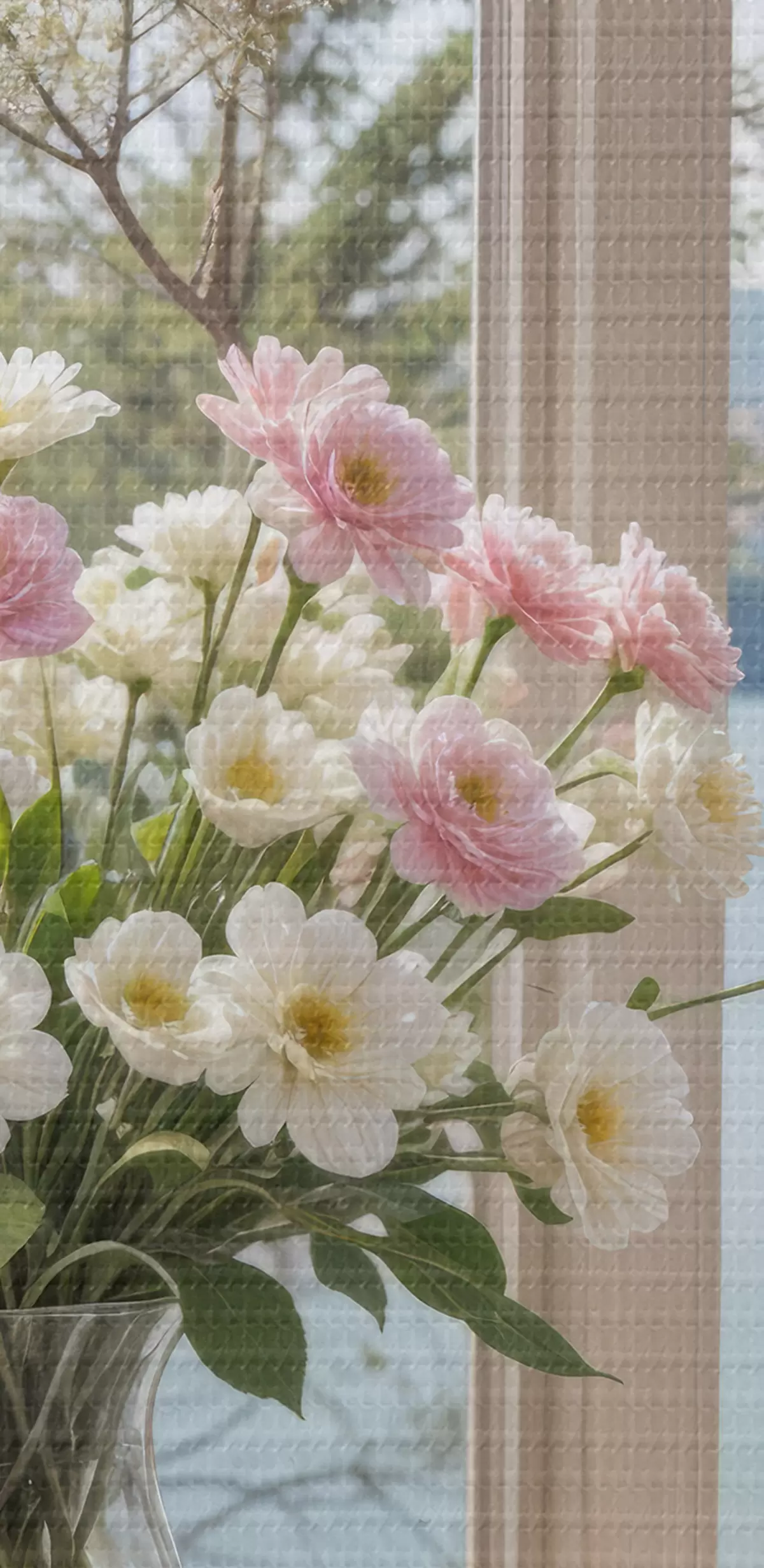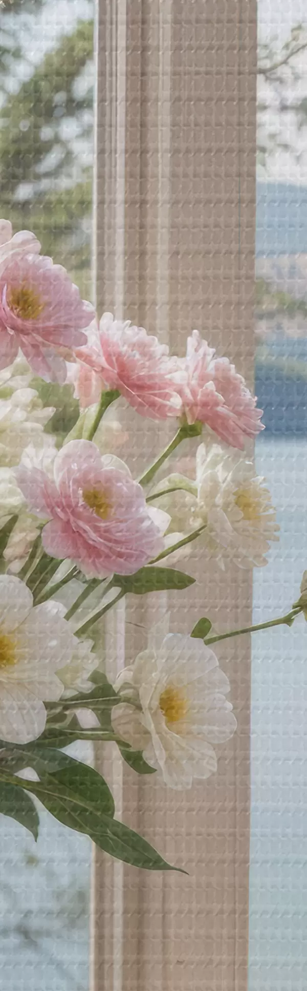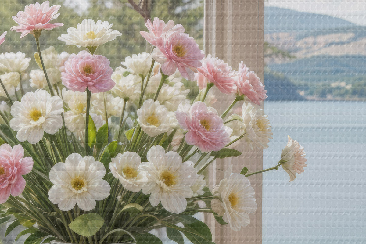 Obrázek Kytice růžových a bílých květin ve skleněné váze umístěné na okenním parapetu s malebným jezerem a horami Nr r40151