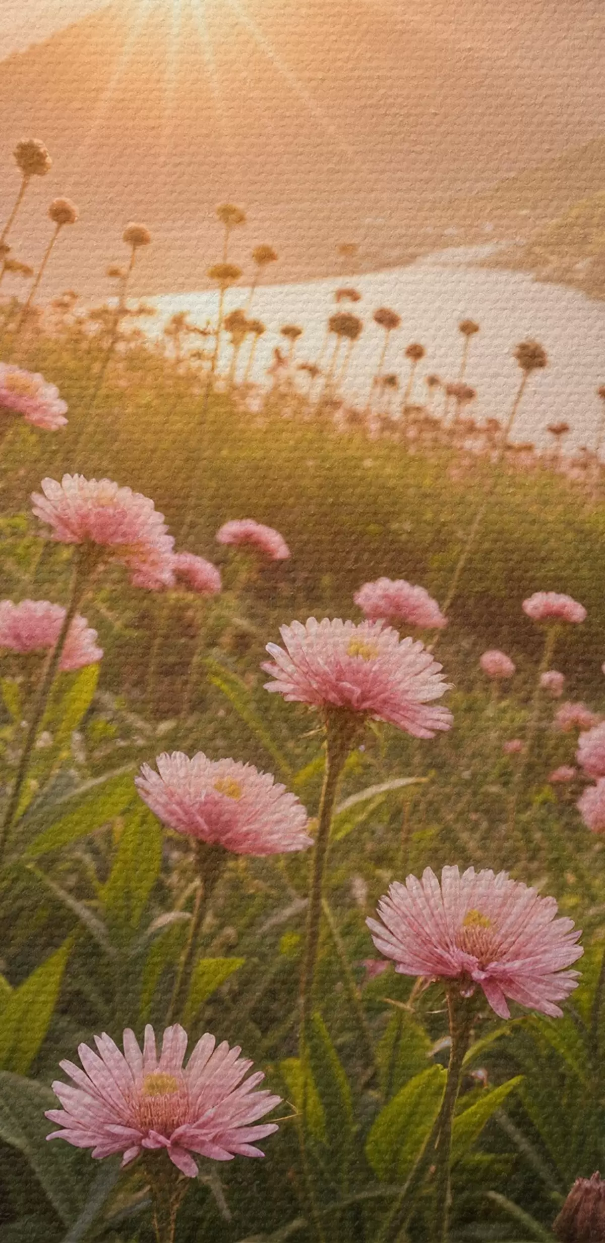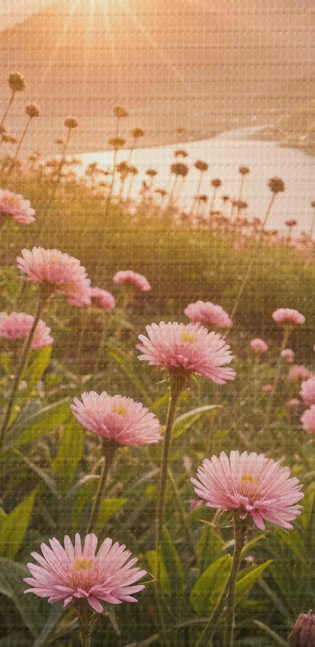 Obrázek Pole růžových sedmikráskových květů v popředí s velkým pohořím v pozadí Nr r40154