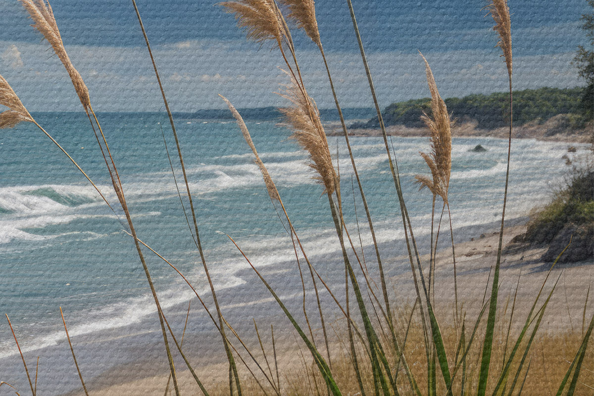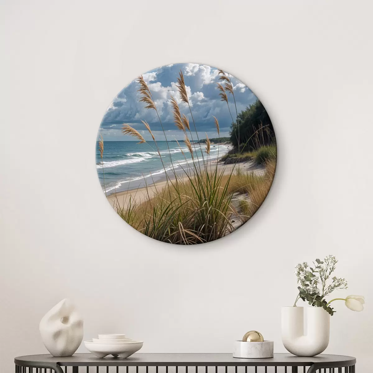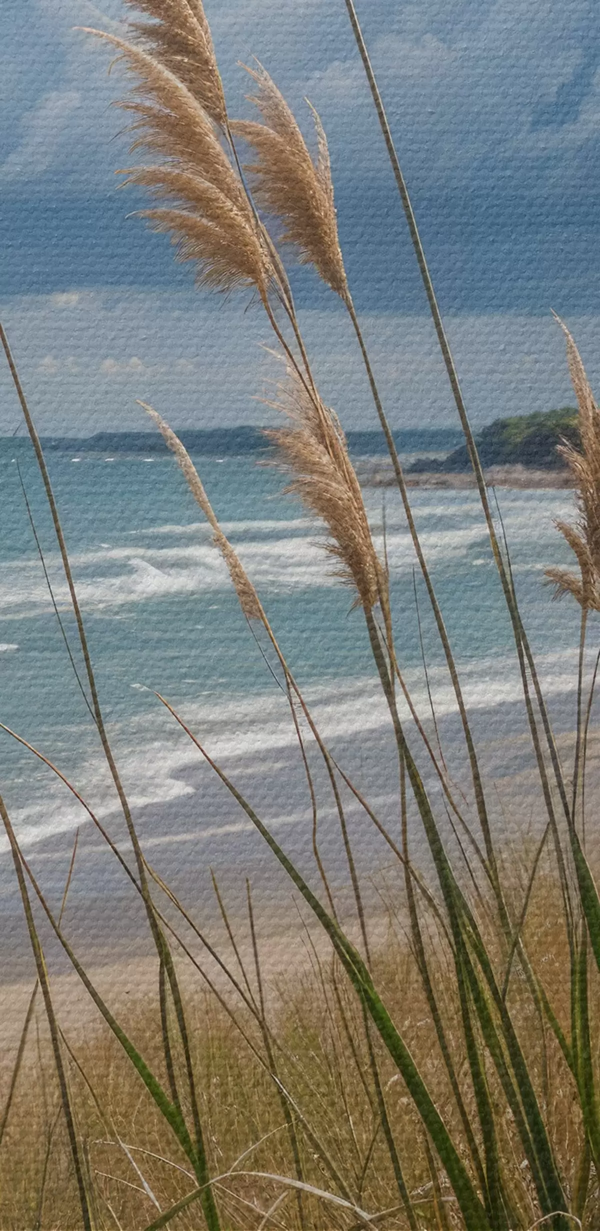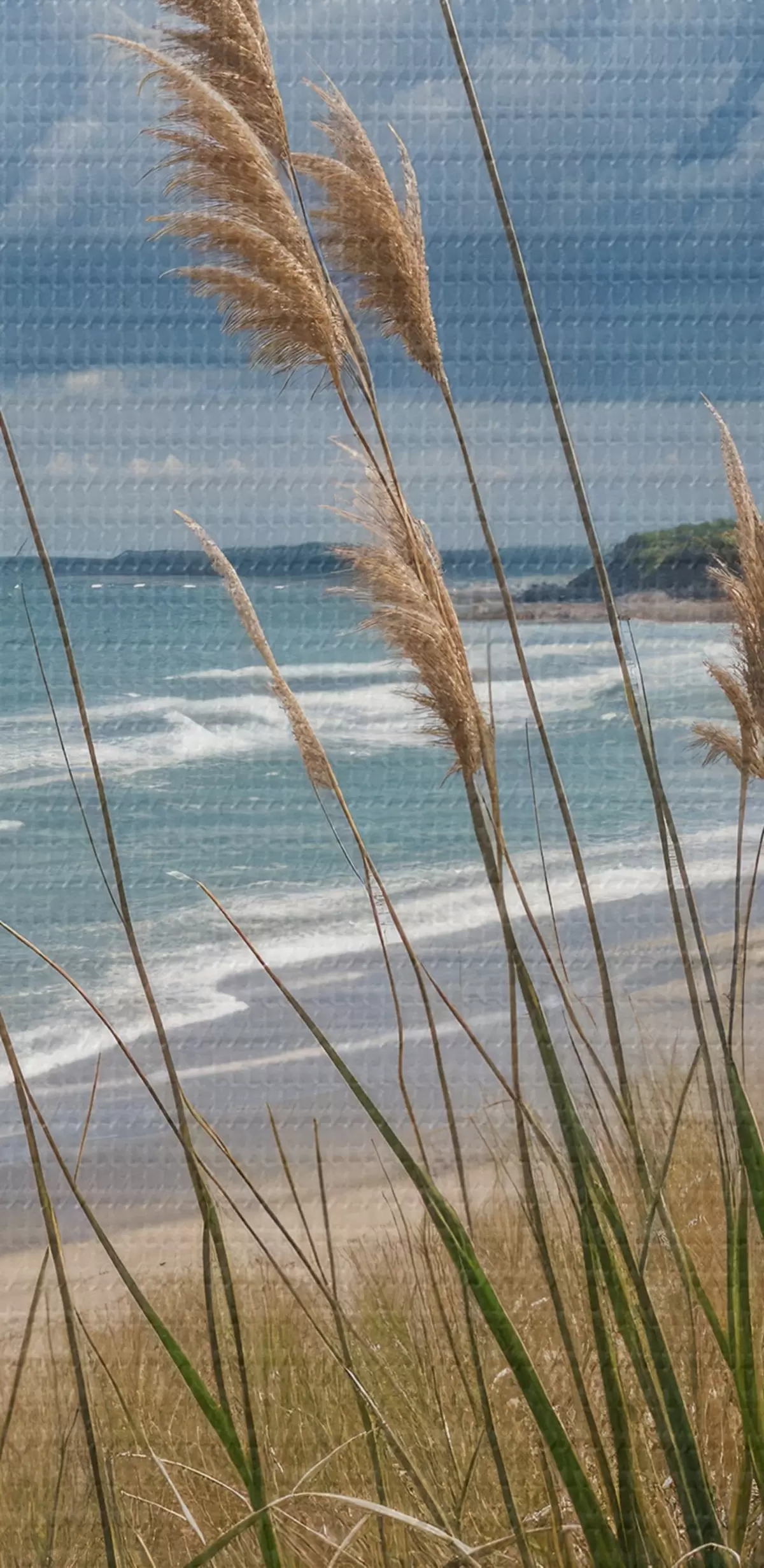 Obrázek Malebná pláž s vysokou trávou houpající se ve větru, s výhledem na oceán s burácejícími vlnami a zataženou oblohou Nr r40161