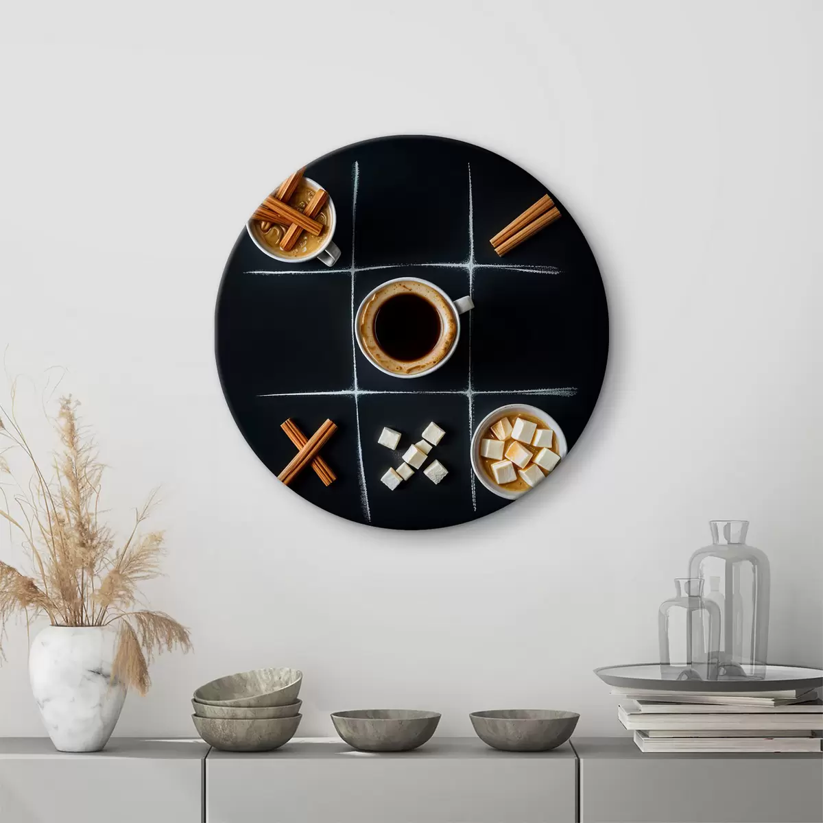 Obrázek Šálek kávy se skořicovými tyčinkami, kostkami cukru a marshmallows uspořádanými do mřížky jako piškvorky Nr r40163