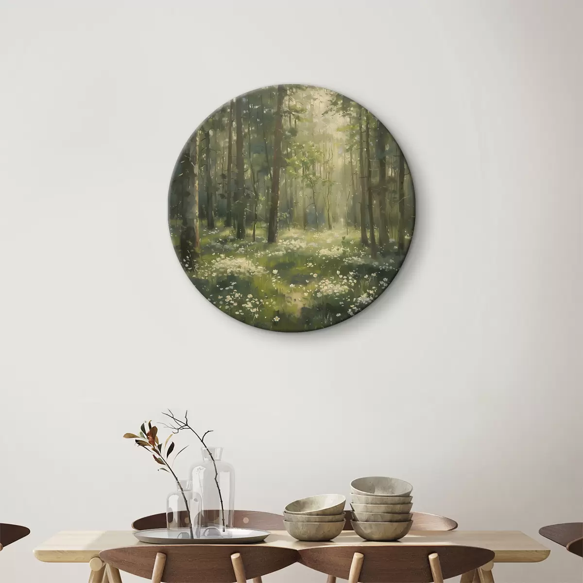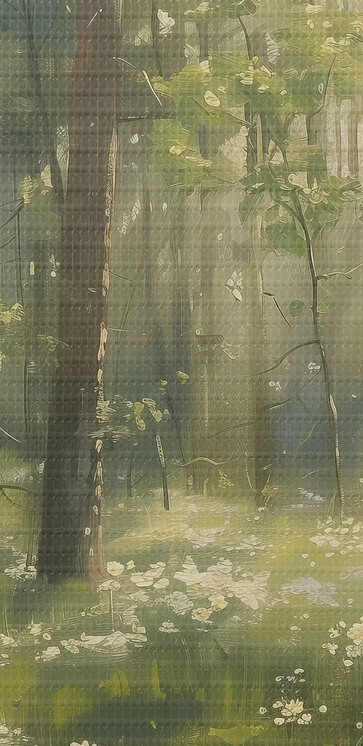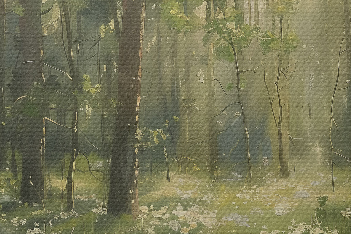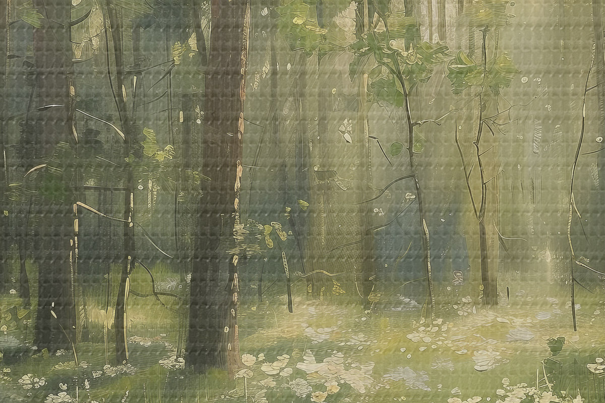 Obrázek Les se slunečním světlem ve stromech, květy heřmánku, zelená tráva, akrylová kresba Nr r40226