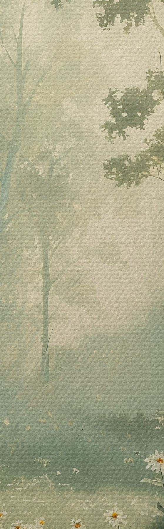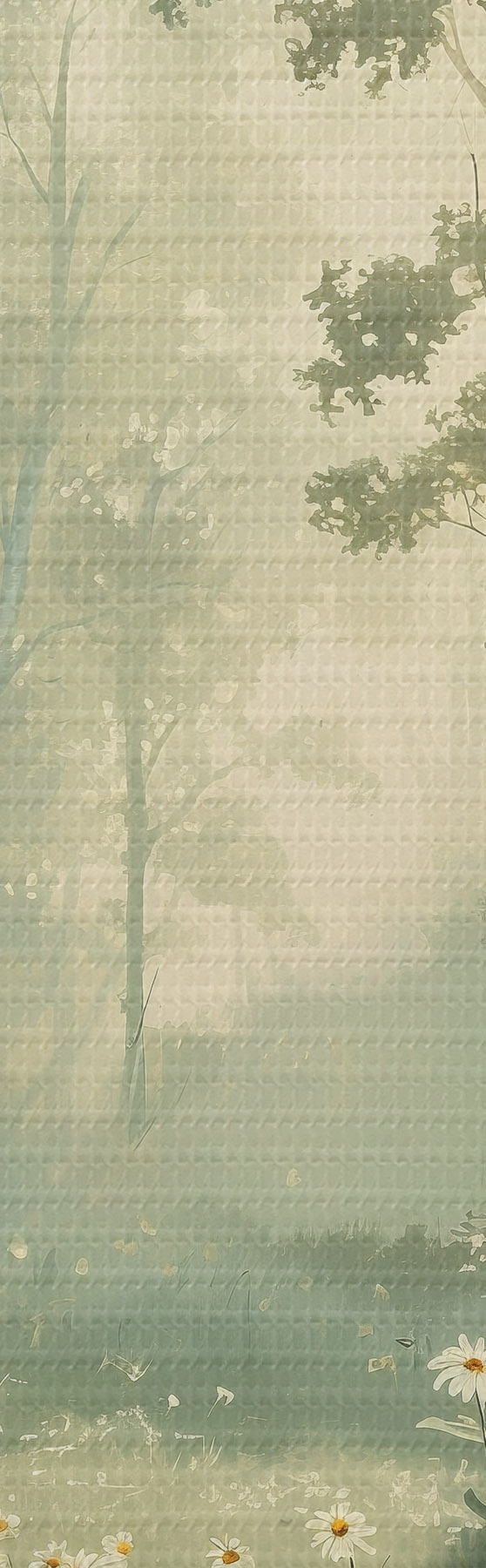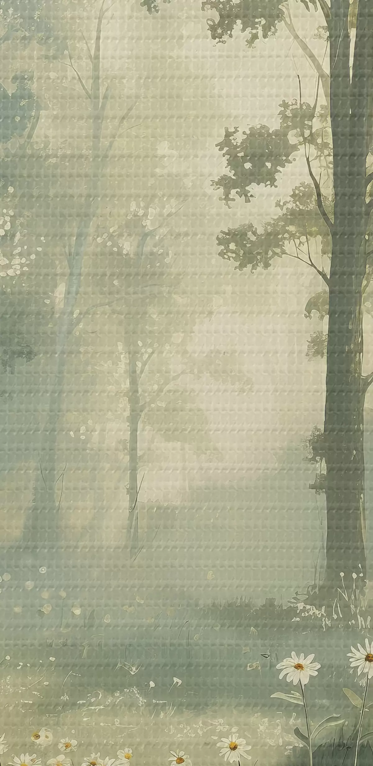 Obrázek Les s měkkým slunečním světlem, květy heřmánku, stromy, zelená tráva, akrylová kresba Nr r40228