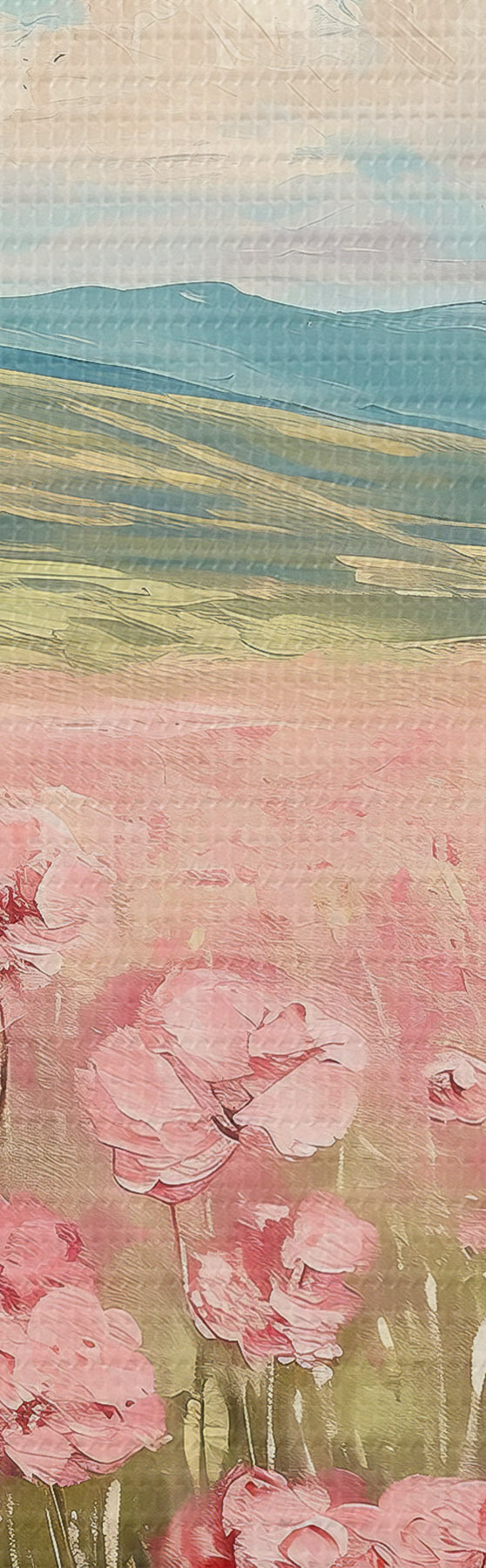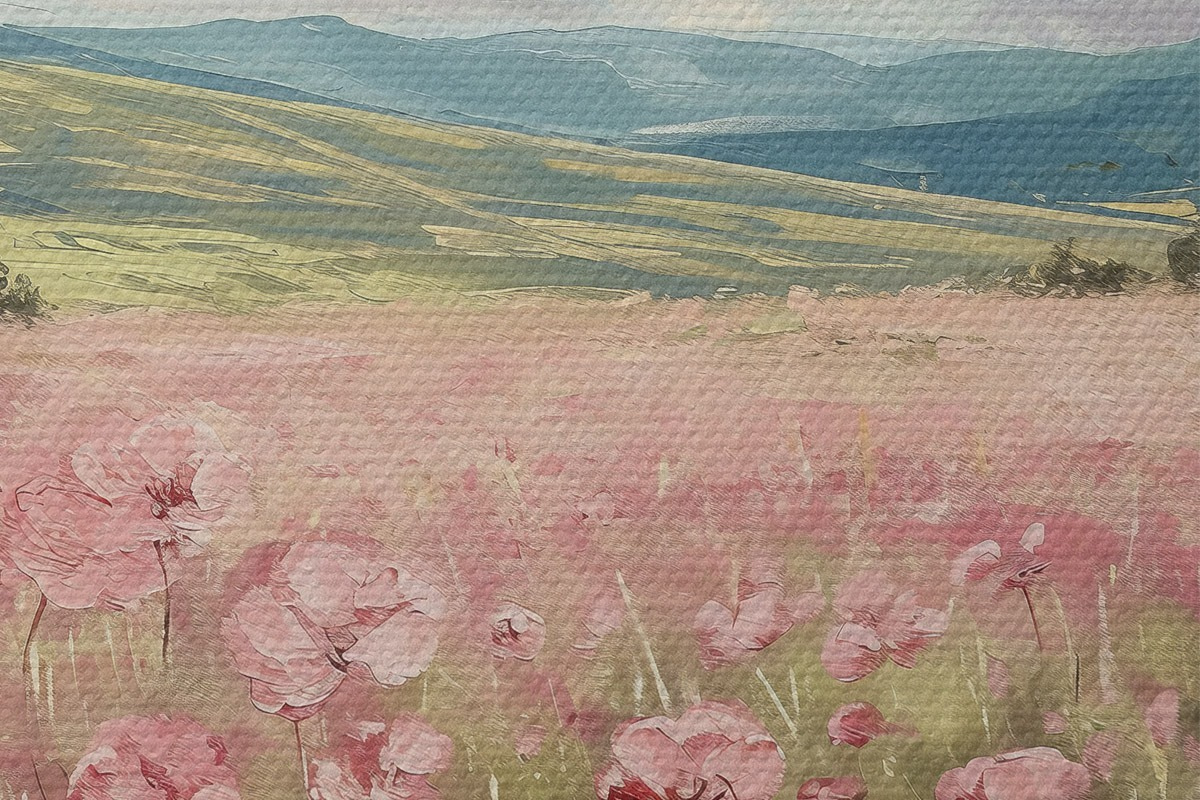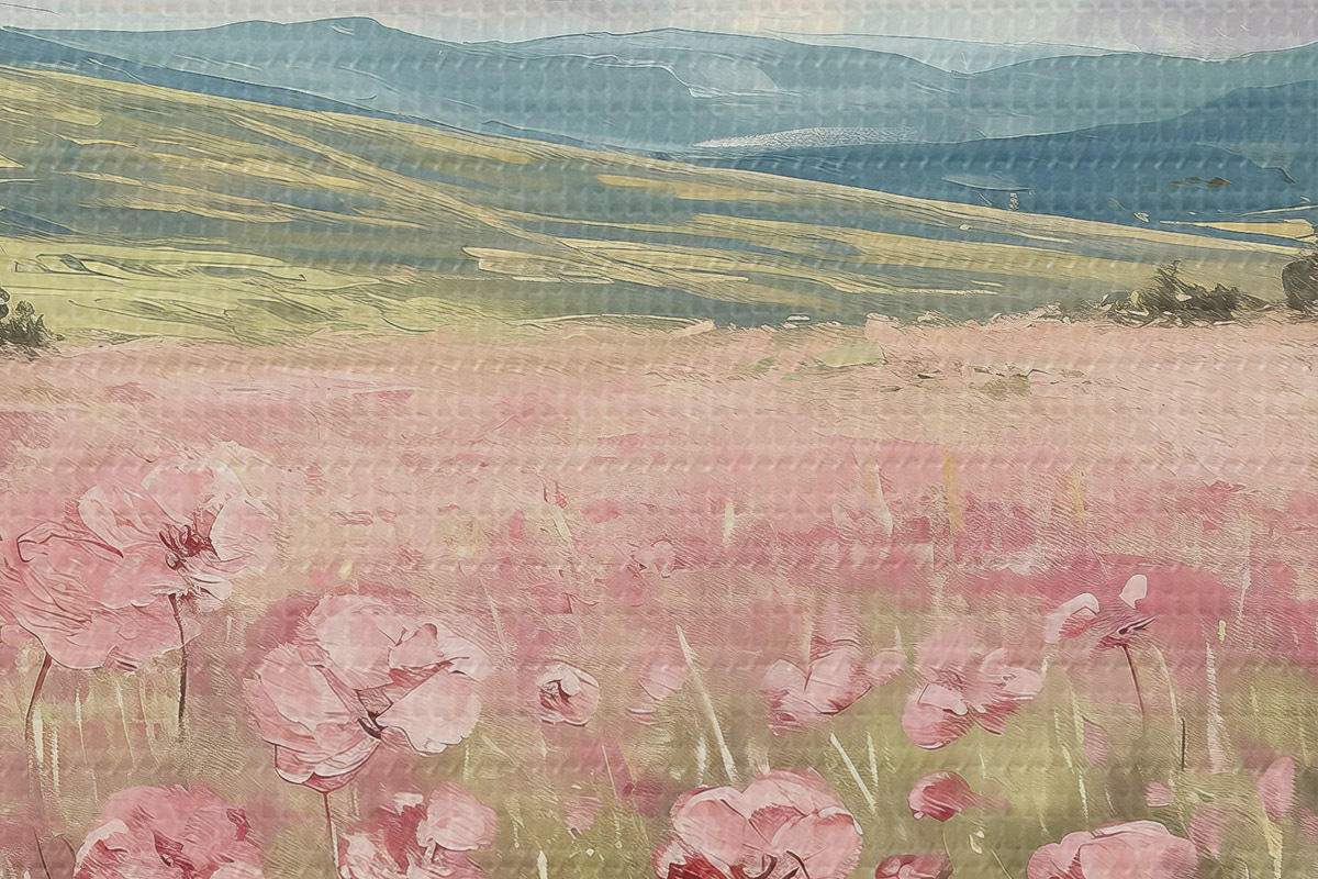 Obrázek Louka s růžovými květy, hory, přírodní krajina, modrá obloha s mraky, akryl Nr r40232