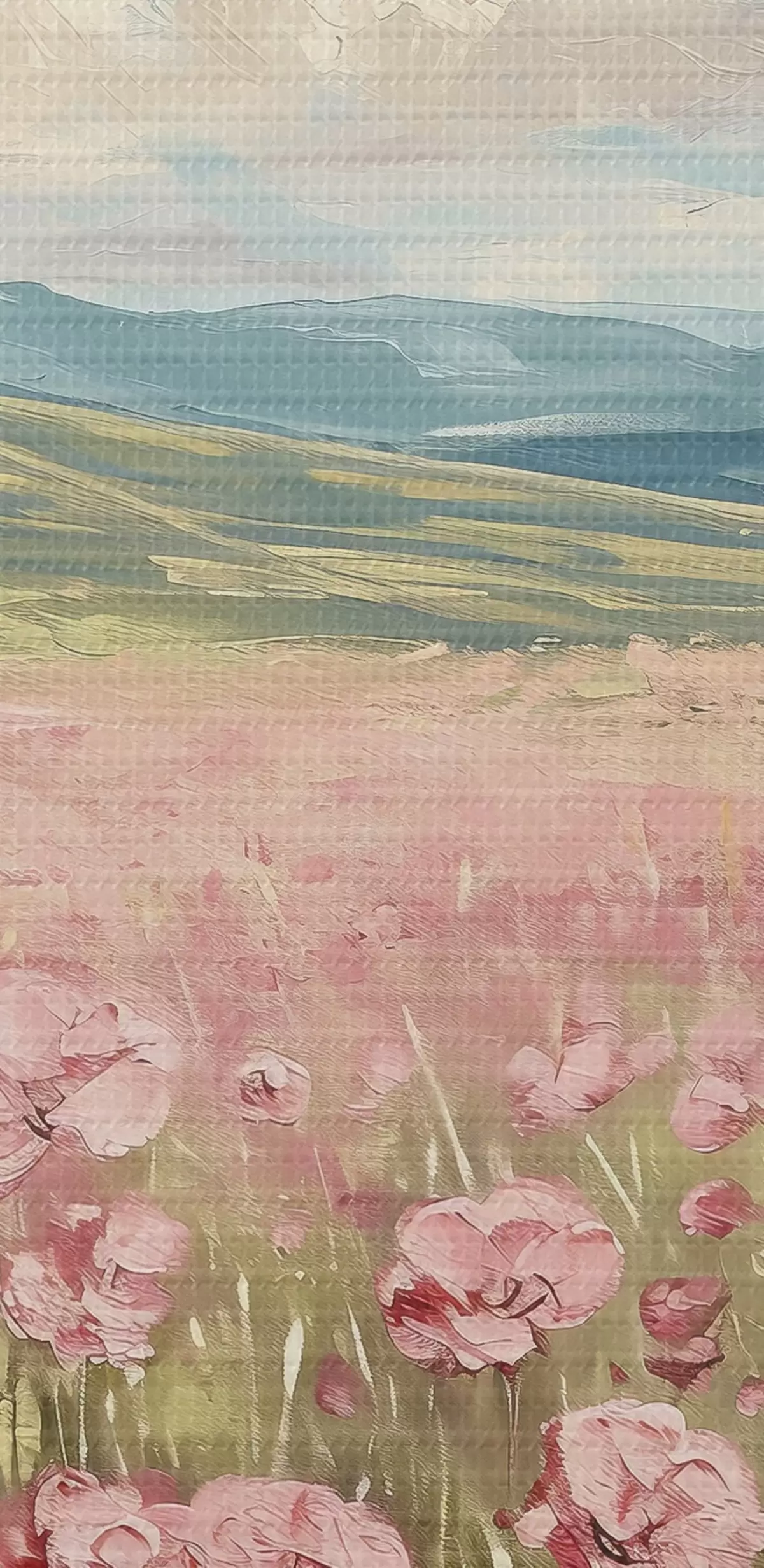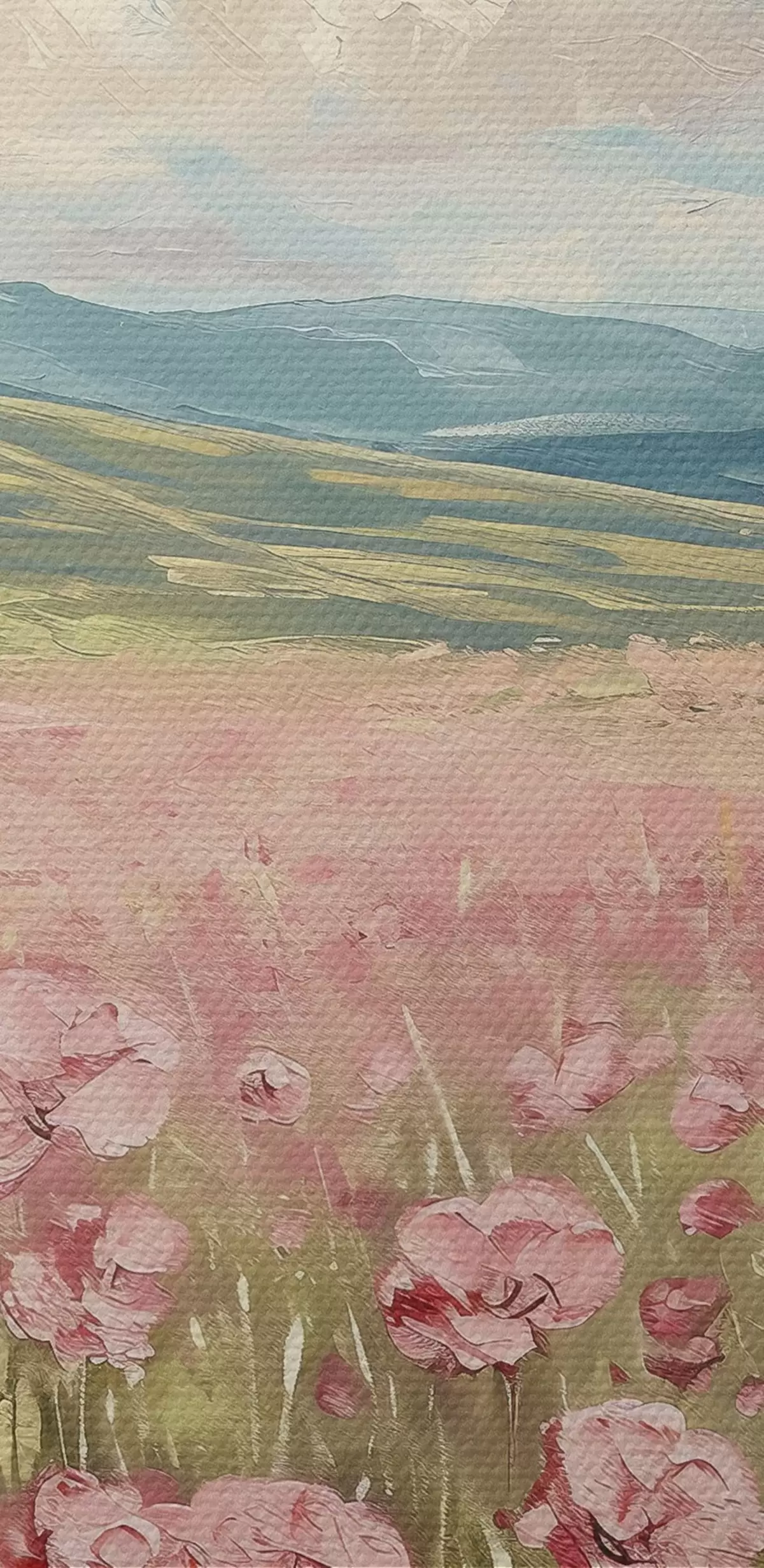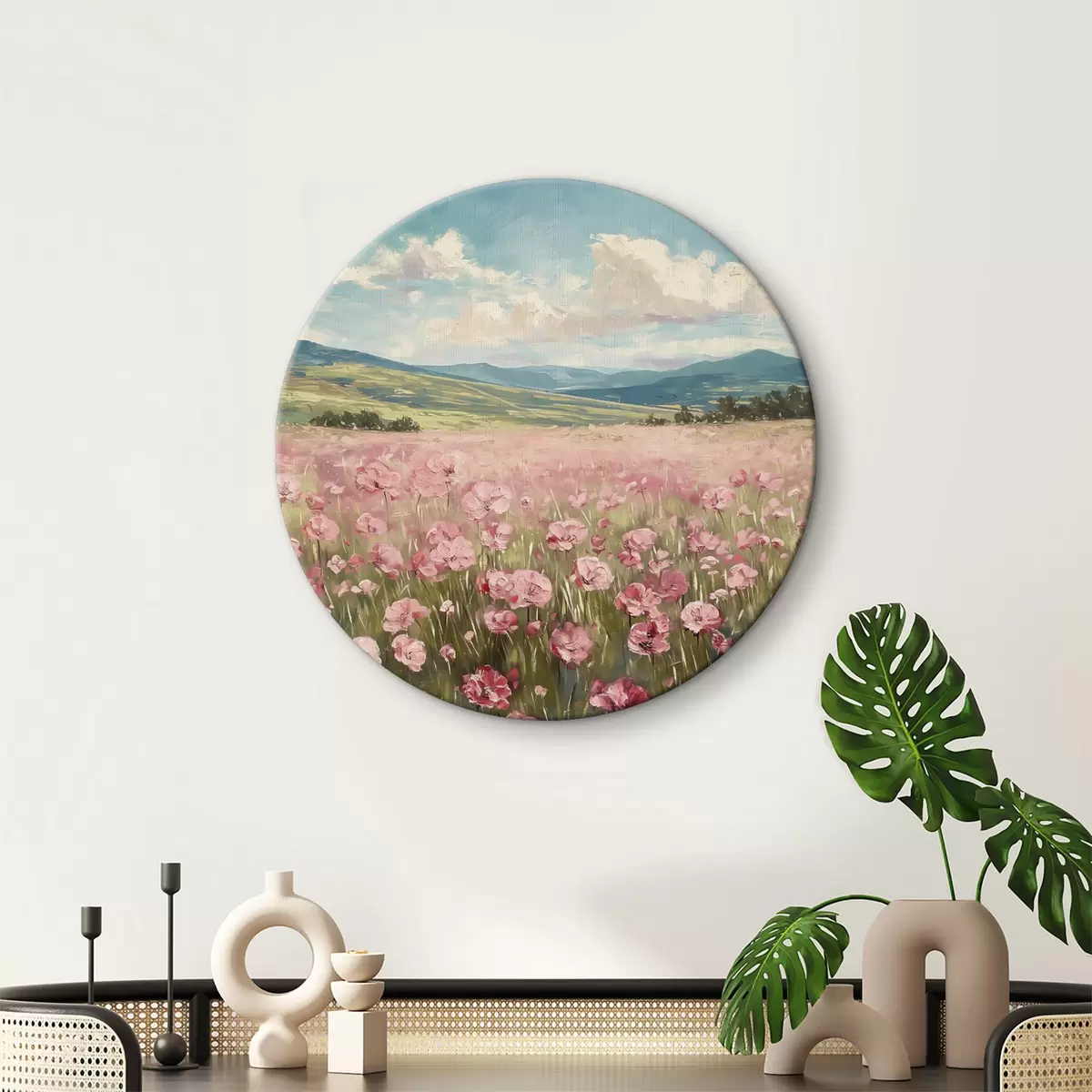 Obrázek Louka s růžovými květy, hory, přírodní krajina, modrá obloha s mraky, akryl Nr r40232