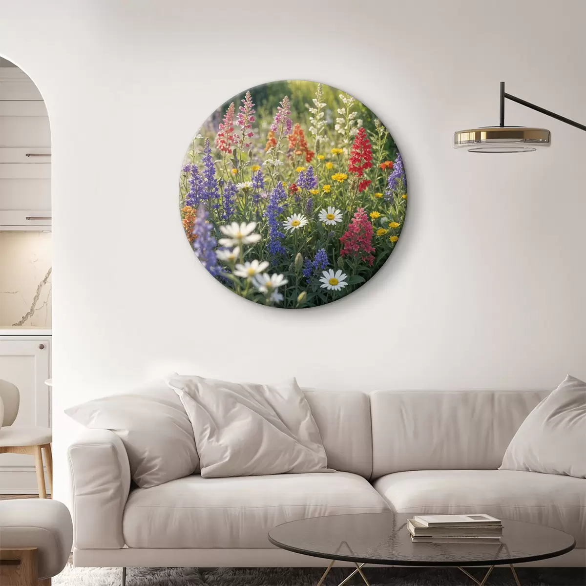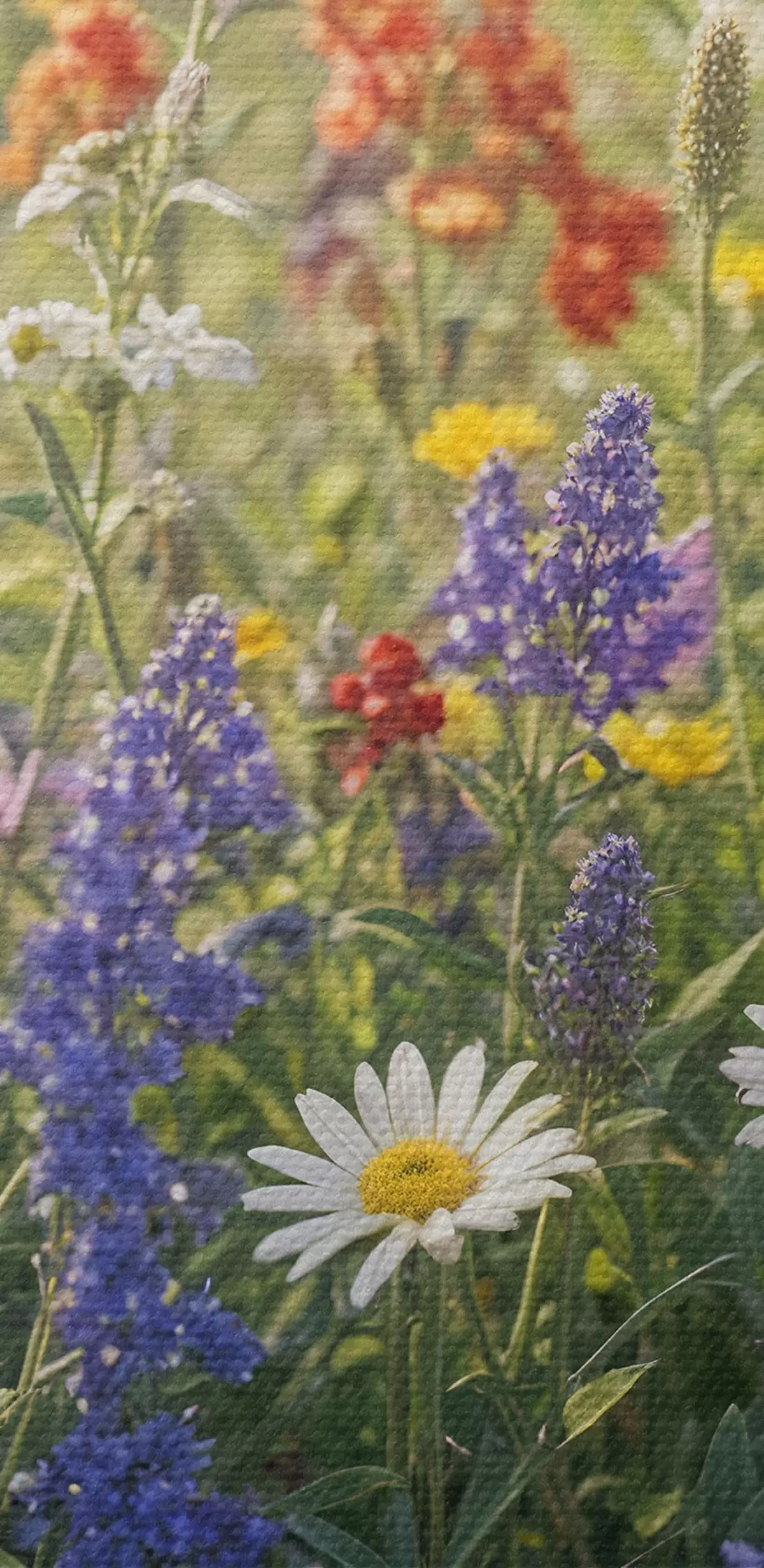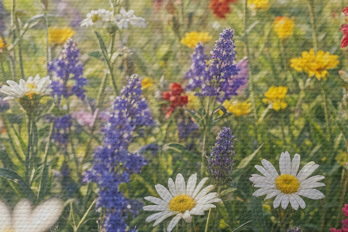 Obrázek Barevná divoká louka s různými kvetoucími květinami včetně sedmikrásek, levandule a červených květin Nr r40390
