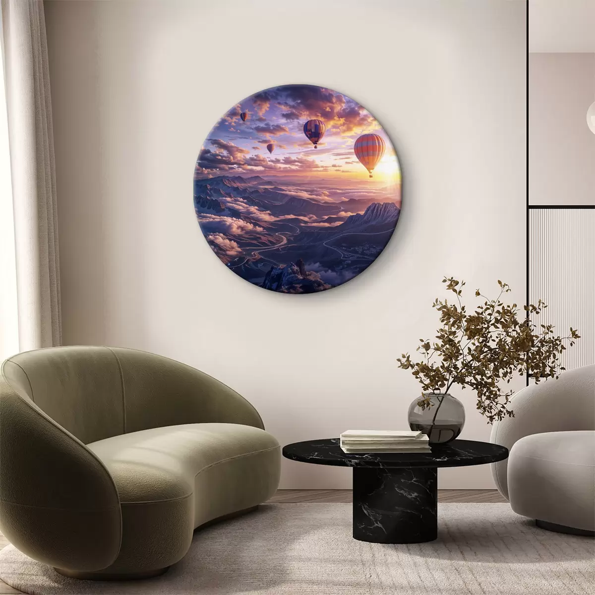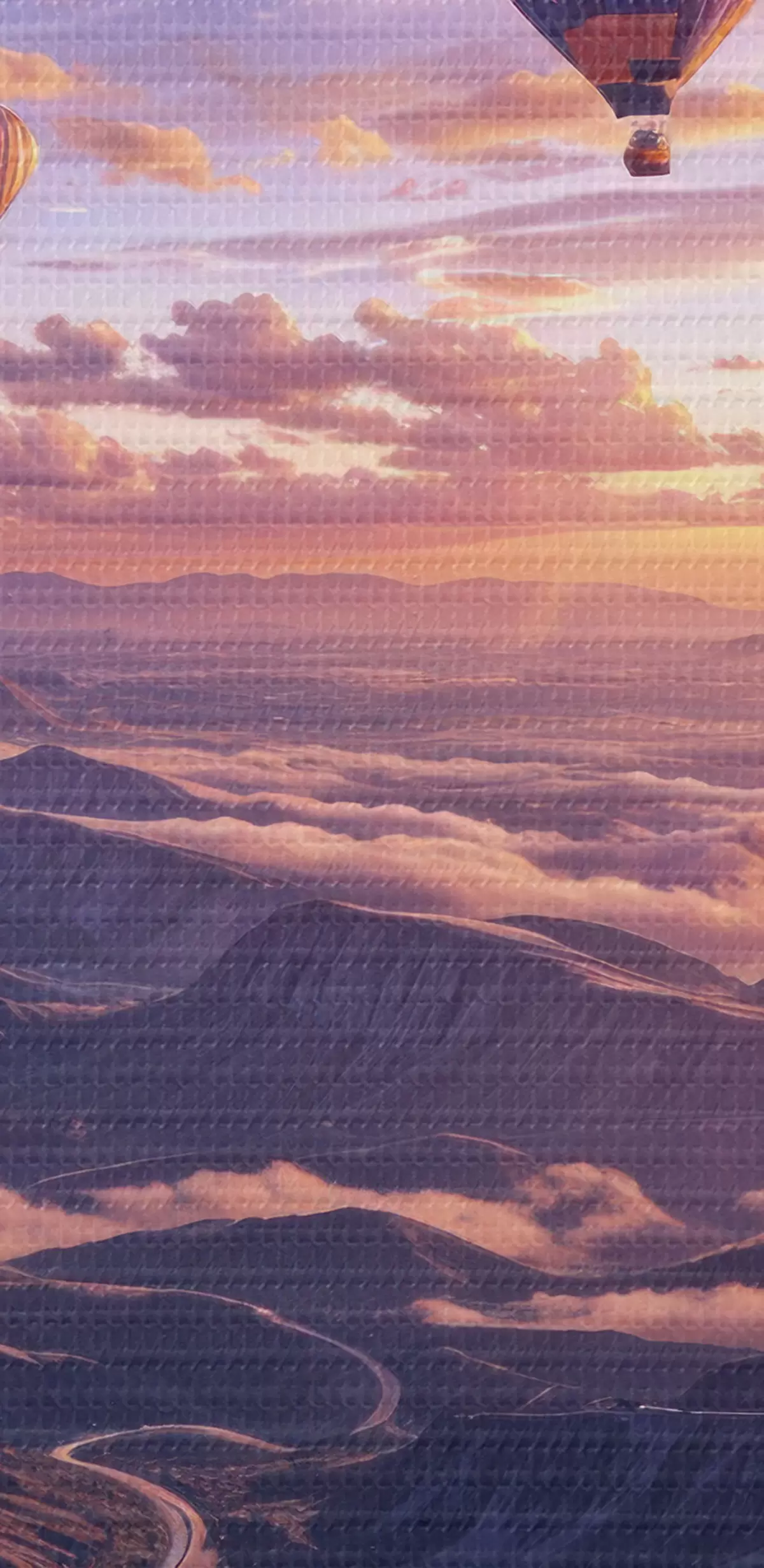 Obrázek Horkovzdušné balóny plovoucí nad hornatou krajinou při západu slunce, s mraky a zářivými barvami na obloze Nr r40397