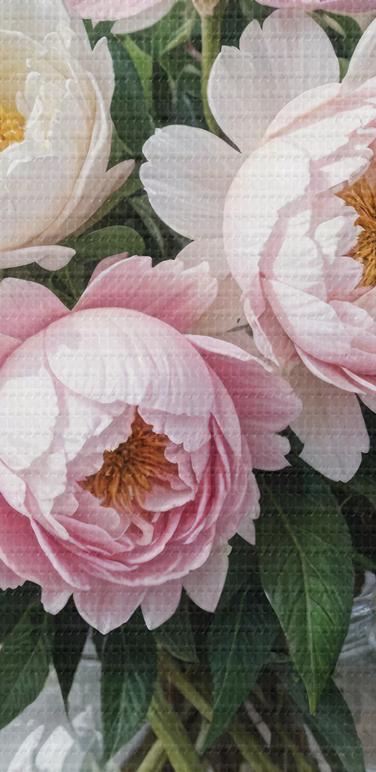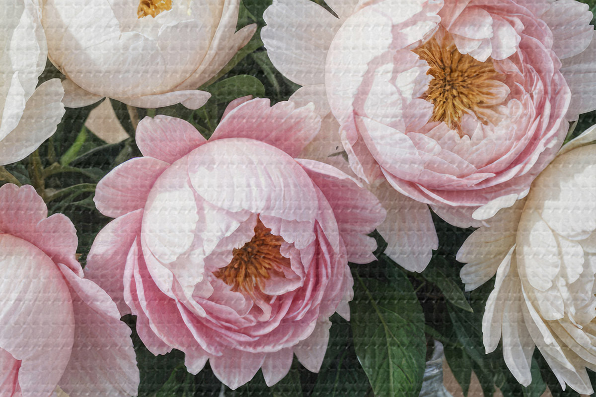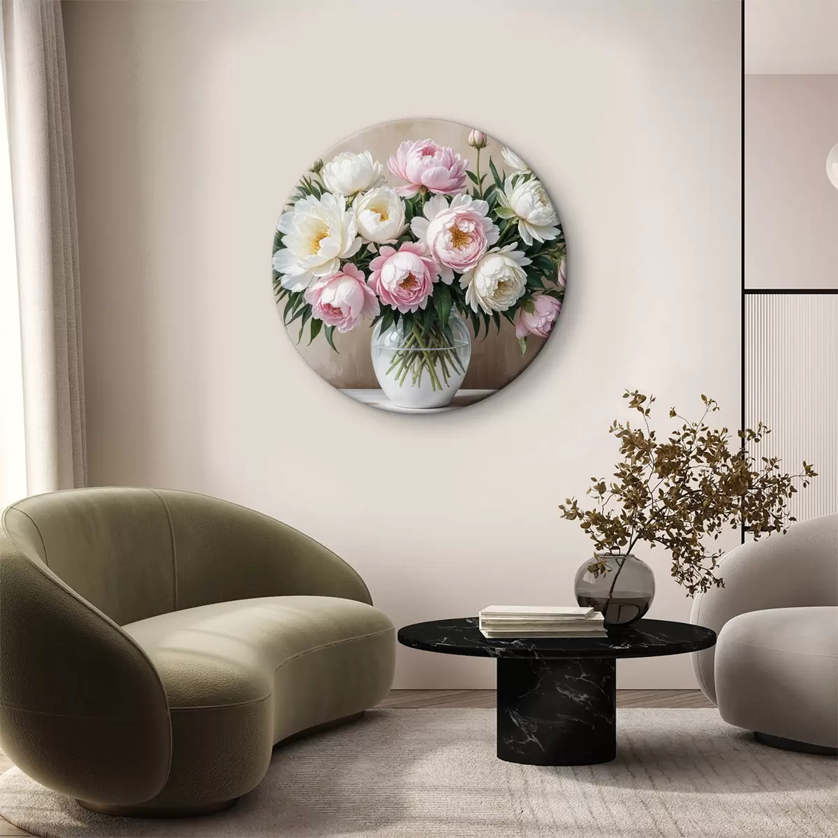 Obrázek Kytice krásných růžových a bílých pivoněk ve skleněné váze, naaranžovaná na dřevěném povrchu Nr r40398