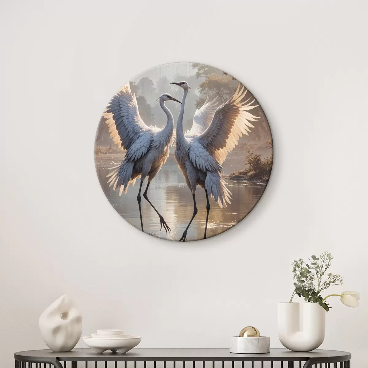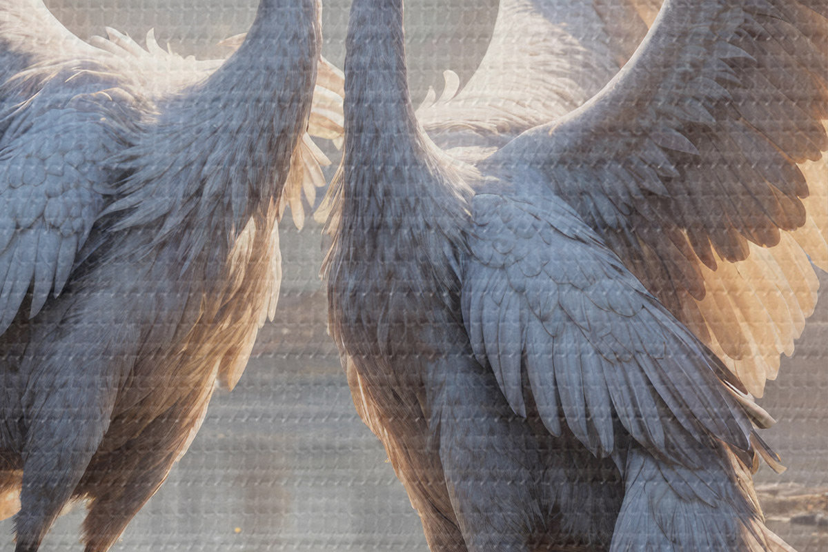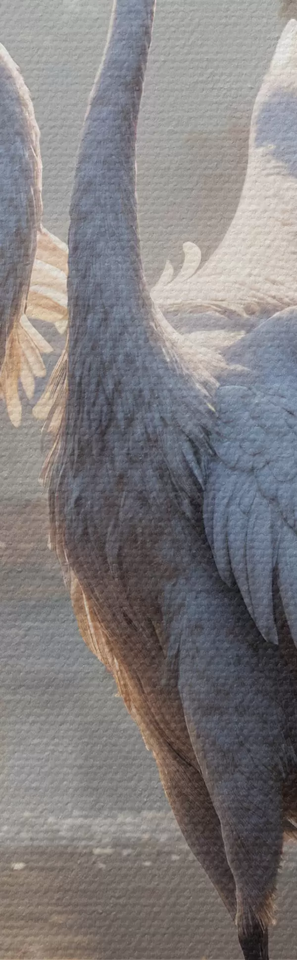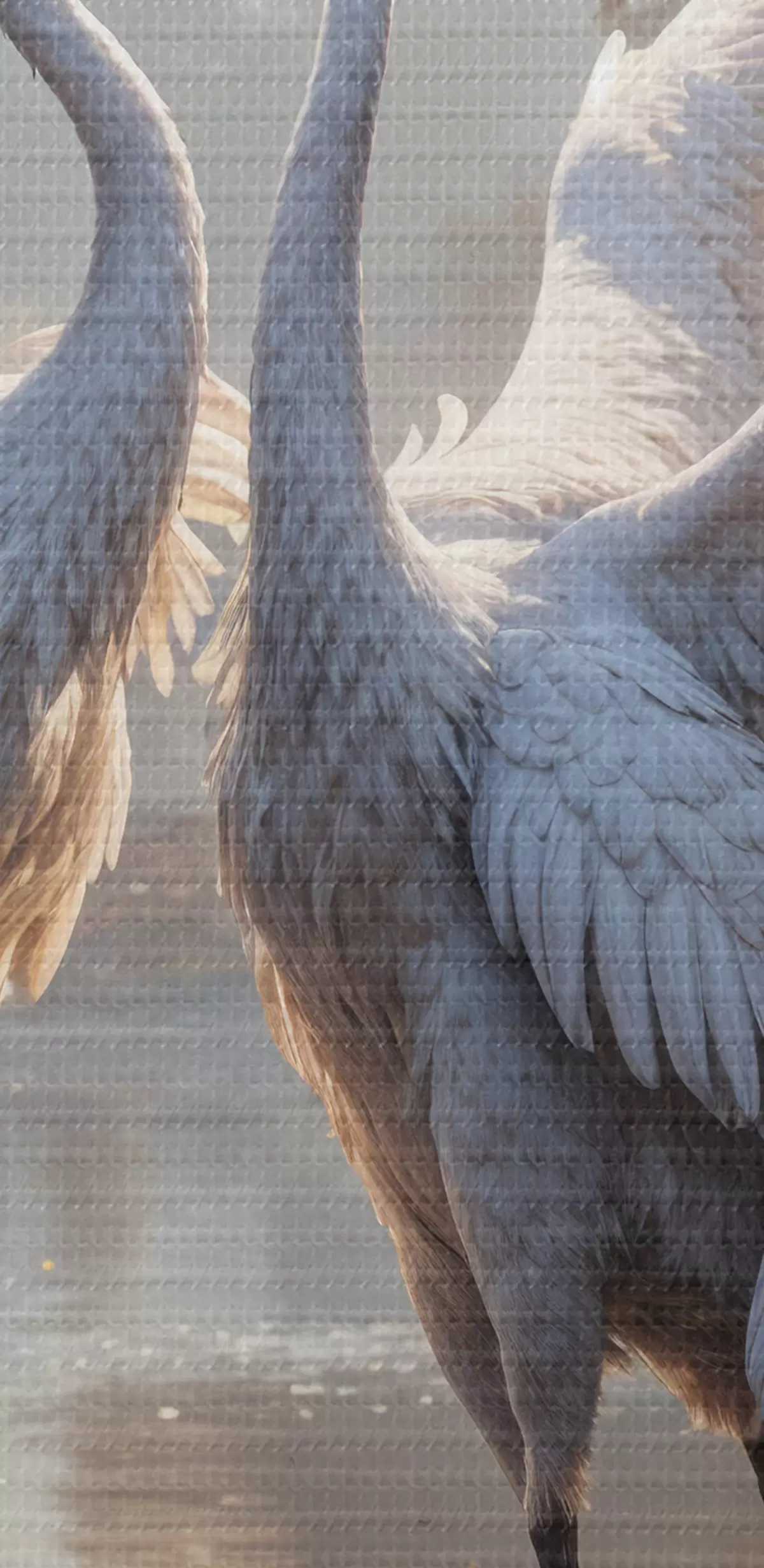Obrázek Dva velcí šedý jeřábi s dlouhými krky a křídly stojící v mlžném jezeře obklopeném stromy Nr r40404