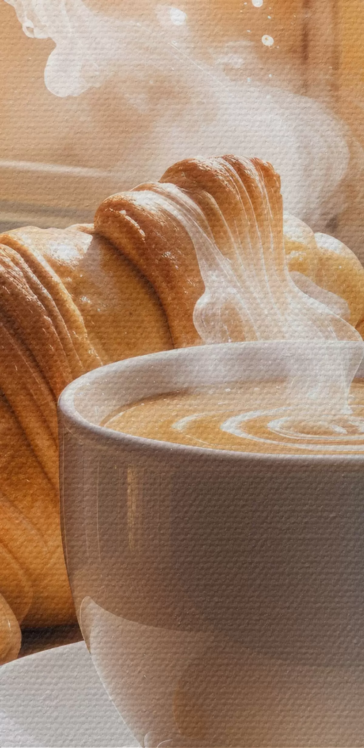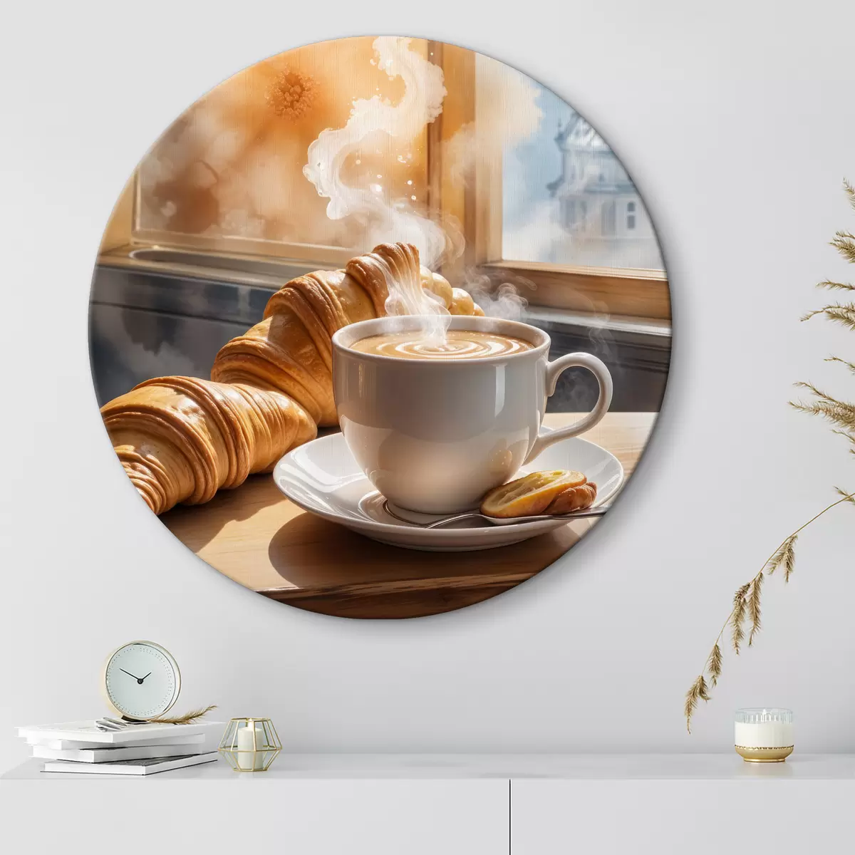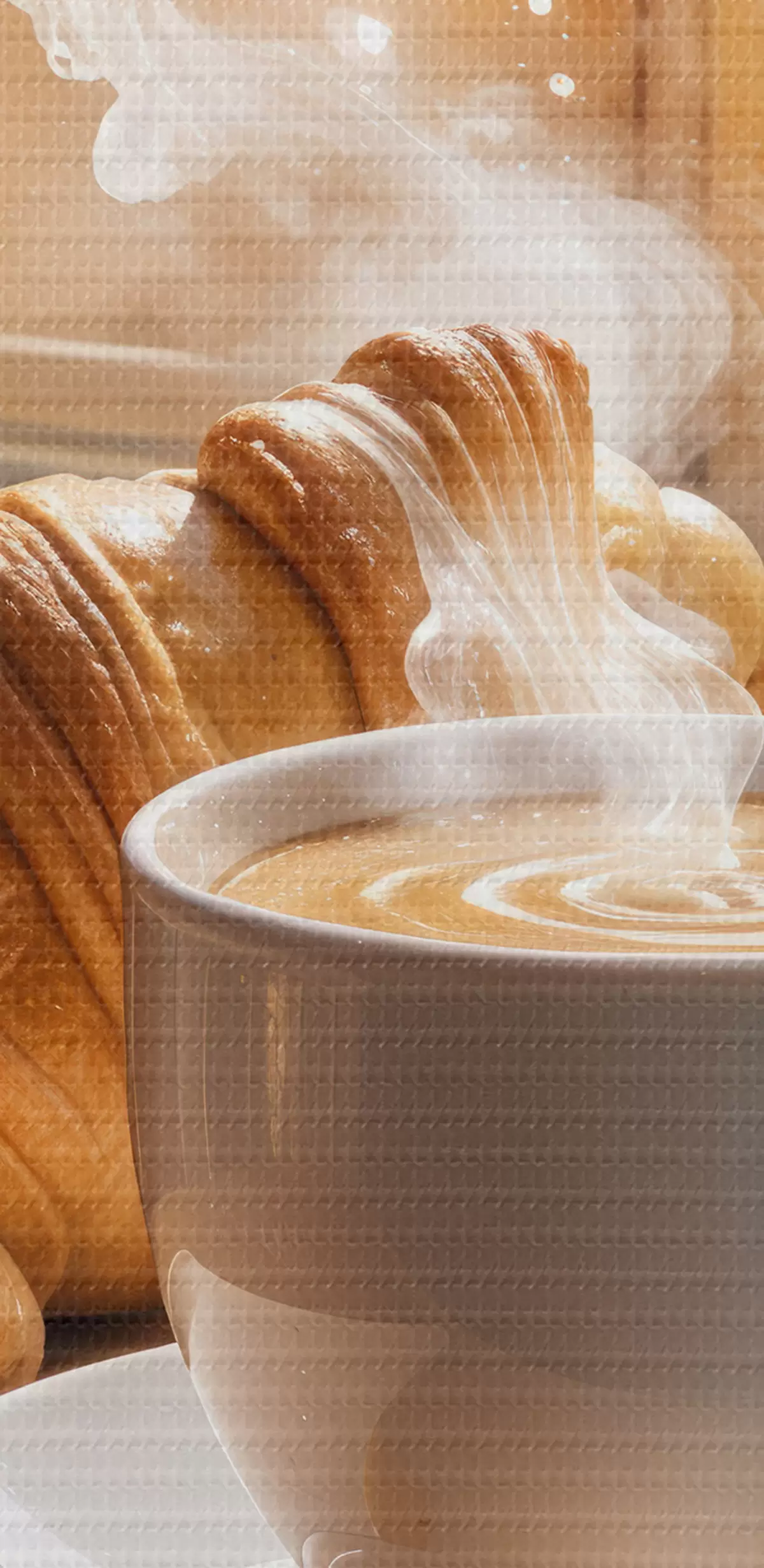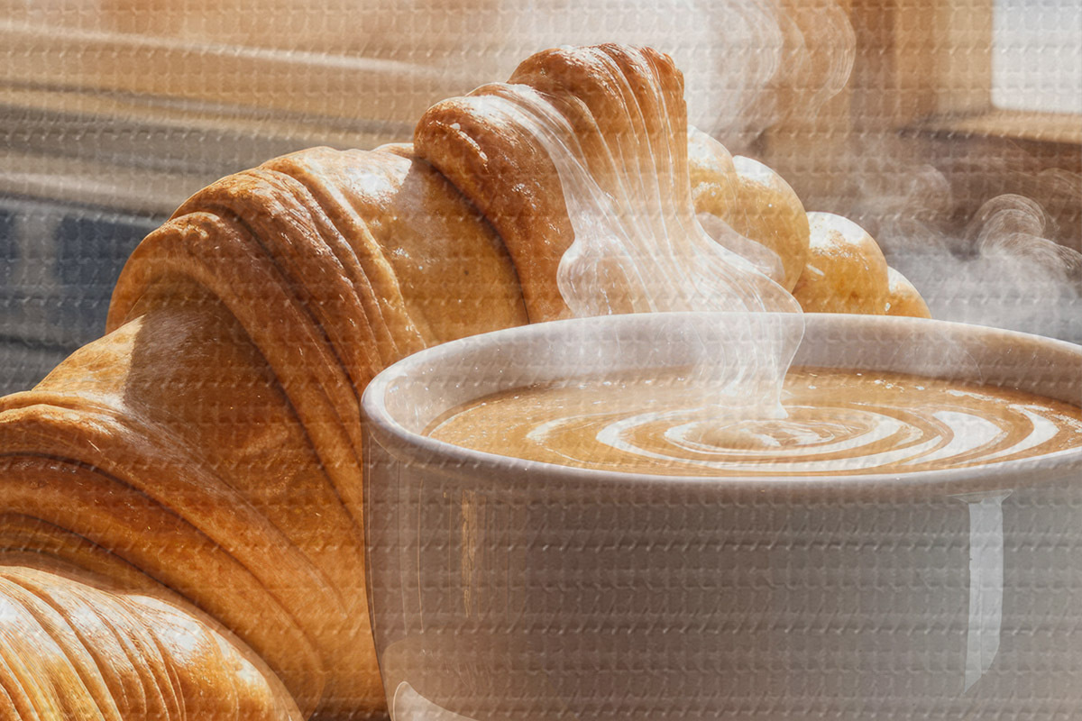 Obrázek Teplý šálek kávy se stoupající párou, položený na stole vedle croissantu, s výhledem na historickou budovu Nr r40405