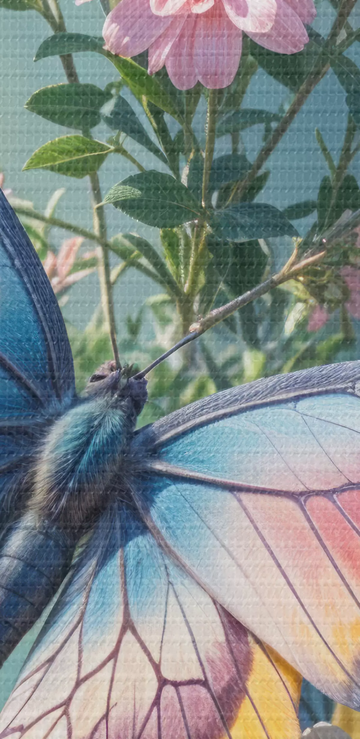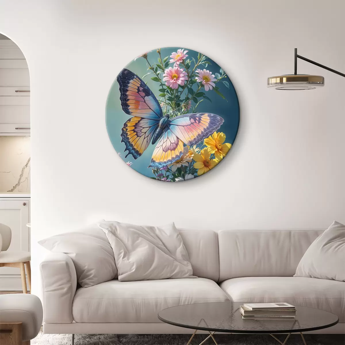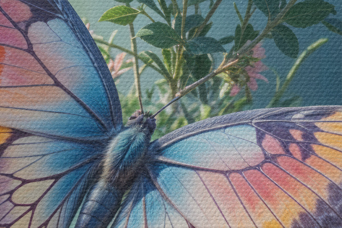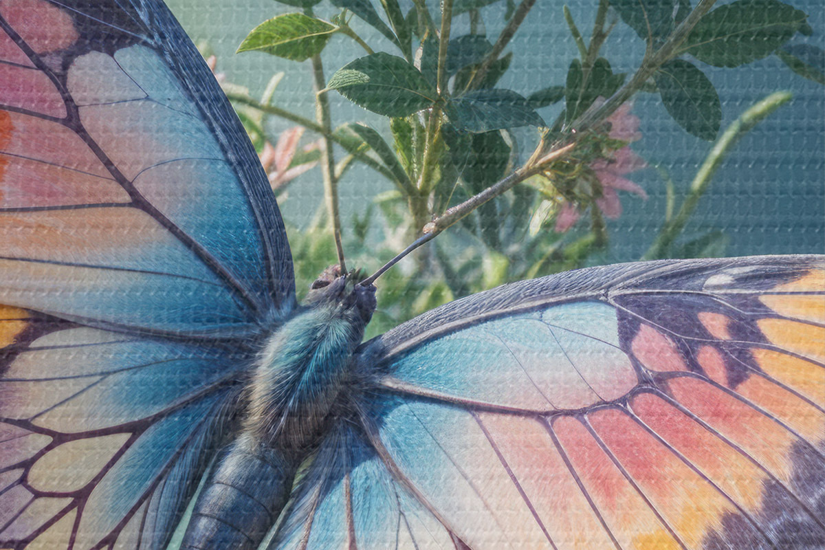 Obrázek Velký, barevný motýl posazený na kytici růžových a žlutých květů na tmavě zeleném pozadí Nr r40411