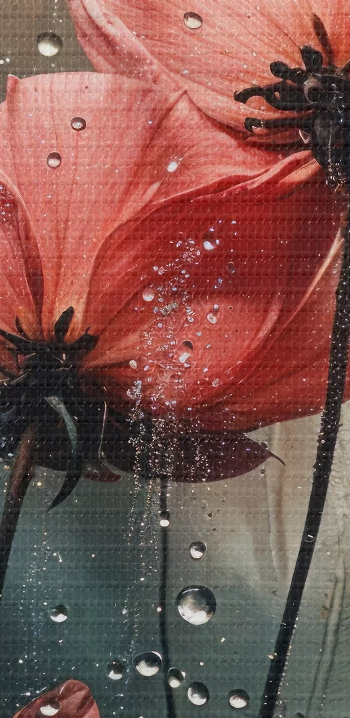 Obrázek Červené květy s kapkami vody na rozmazaném pozadí Nr r40412