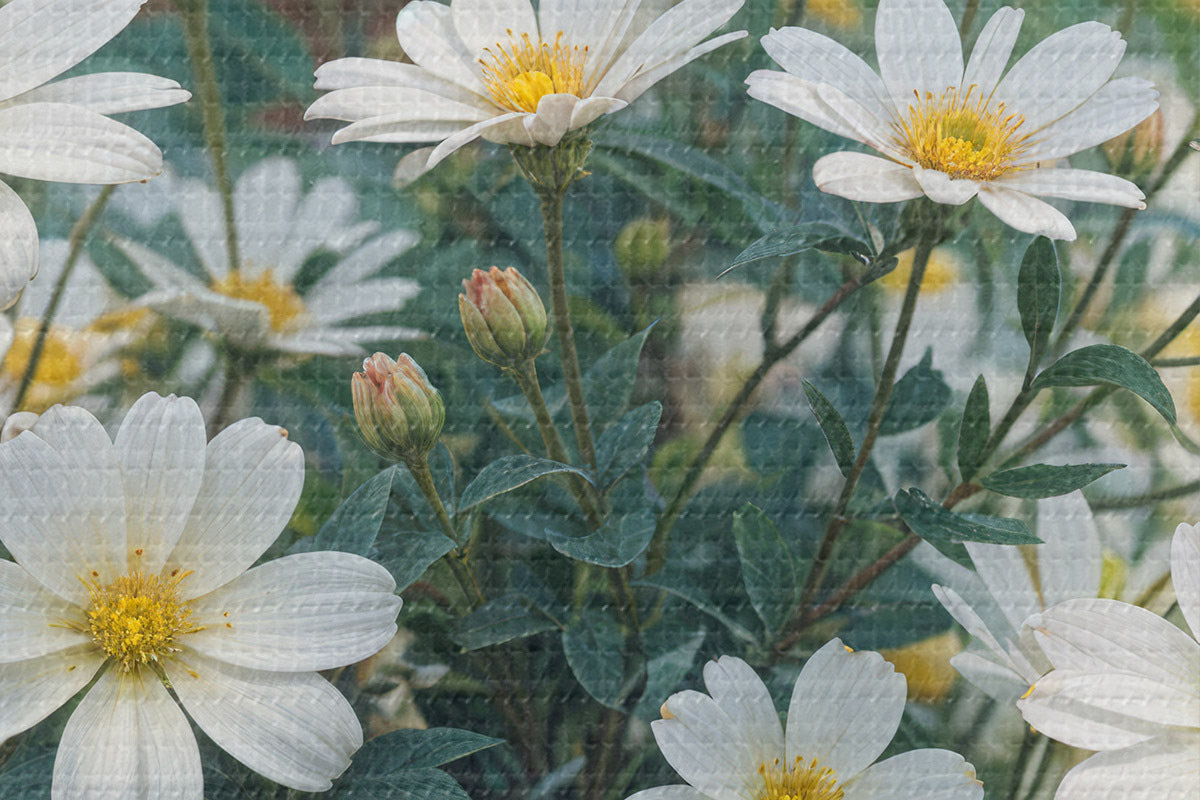 Obrázek Pole bílých květů sedmikrásky se zeleným listím na rozmazaném pozadí Nr r40413