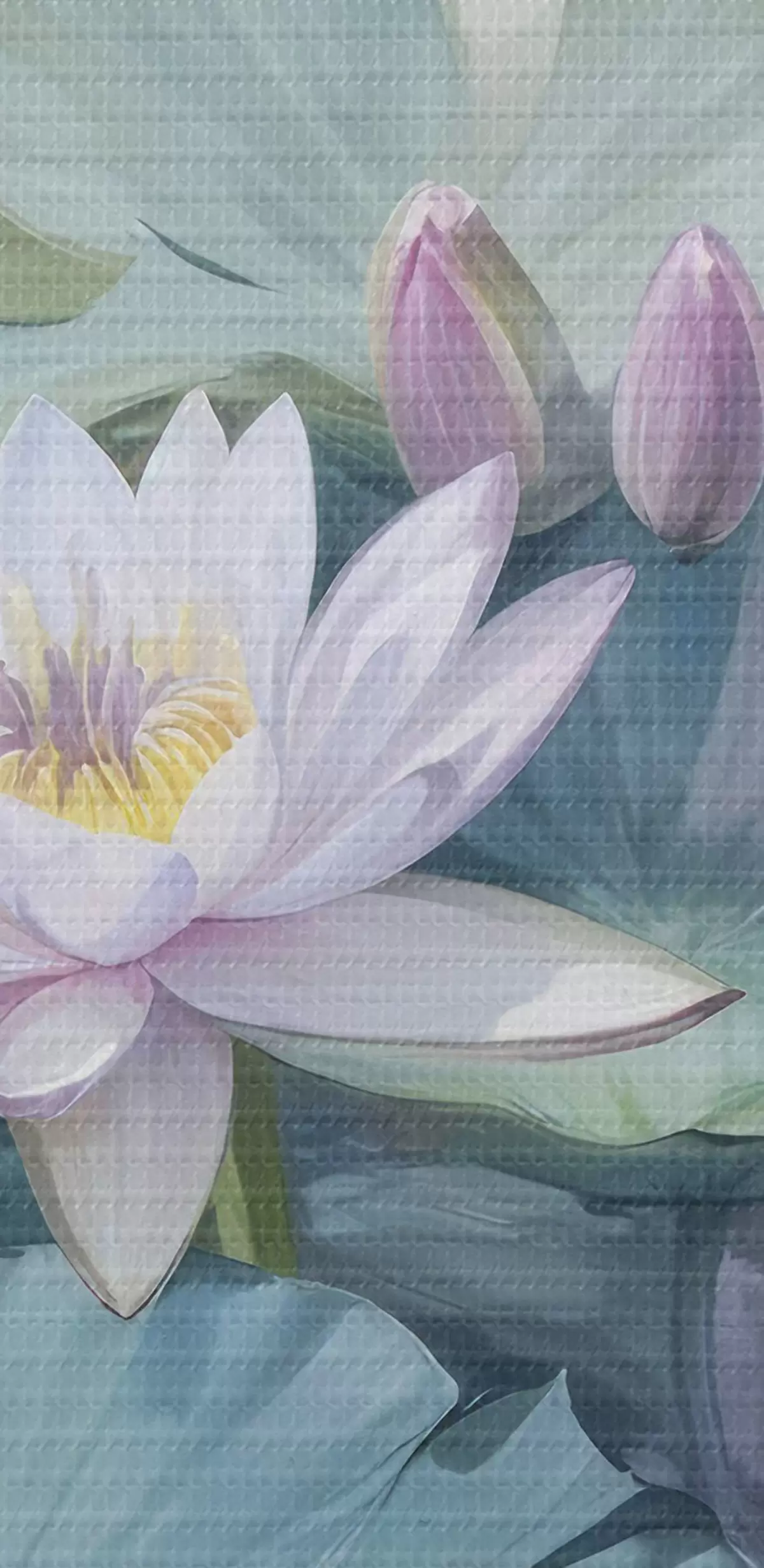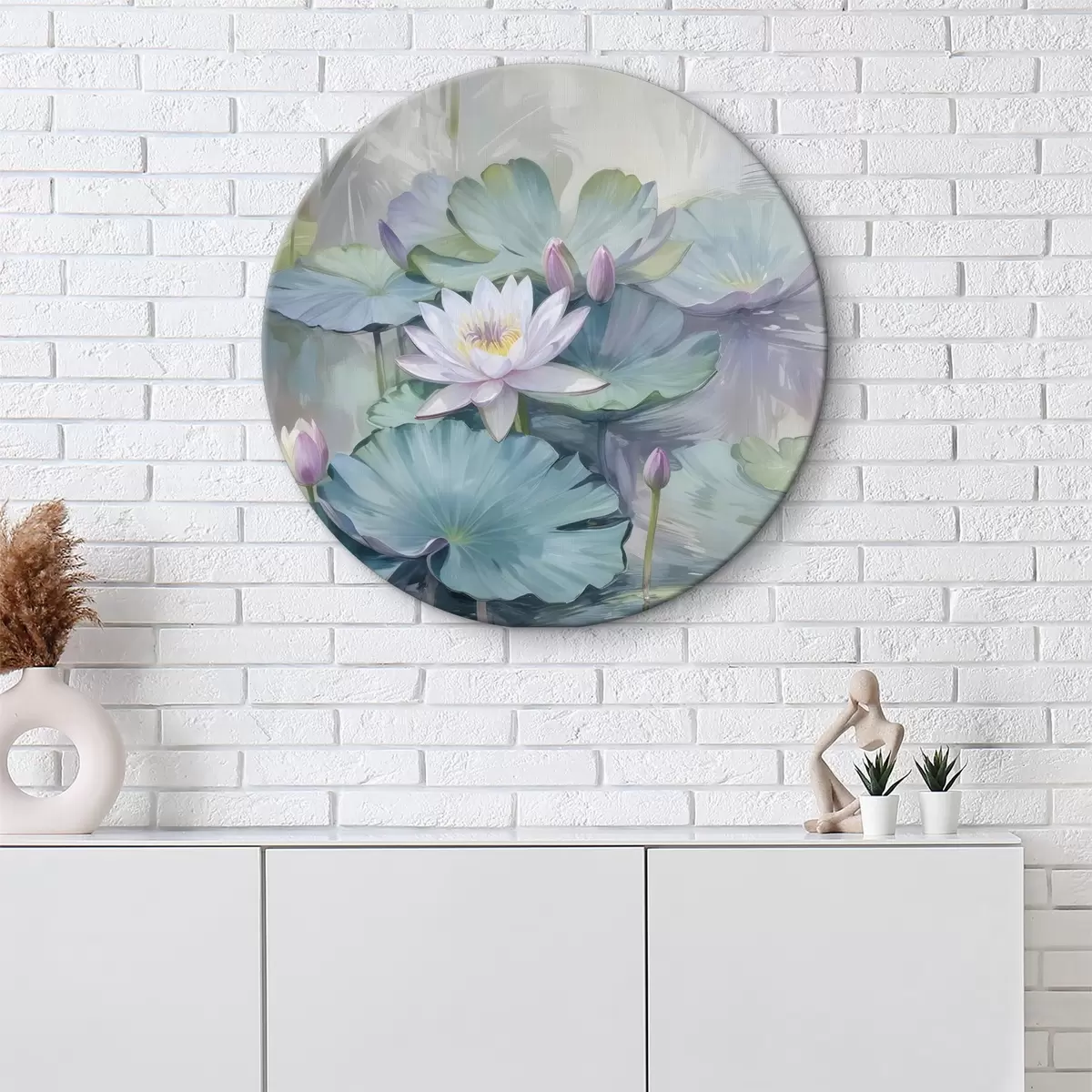 Obrázek Klidný obraz jezírka s lekníny a květinami v pastelových barvách, obklopený svěžími zelenými listy leknínů Nr r40542