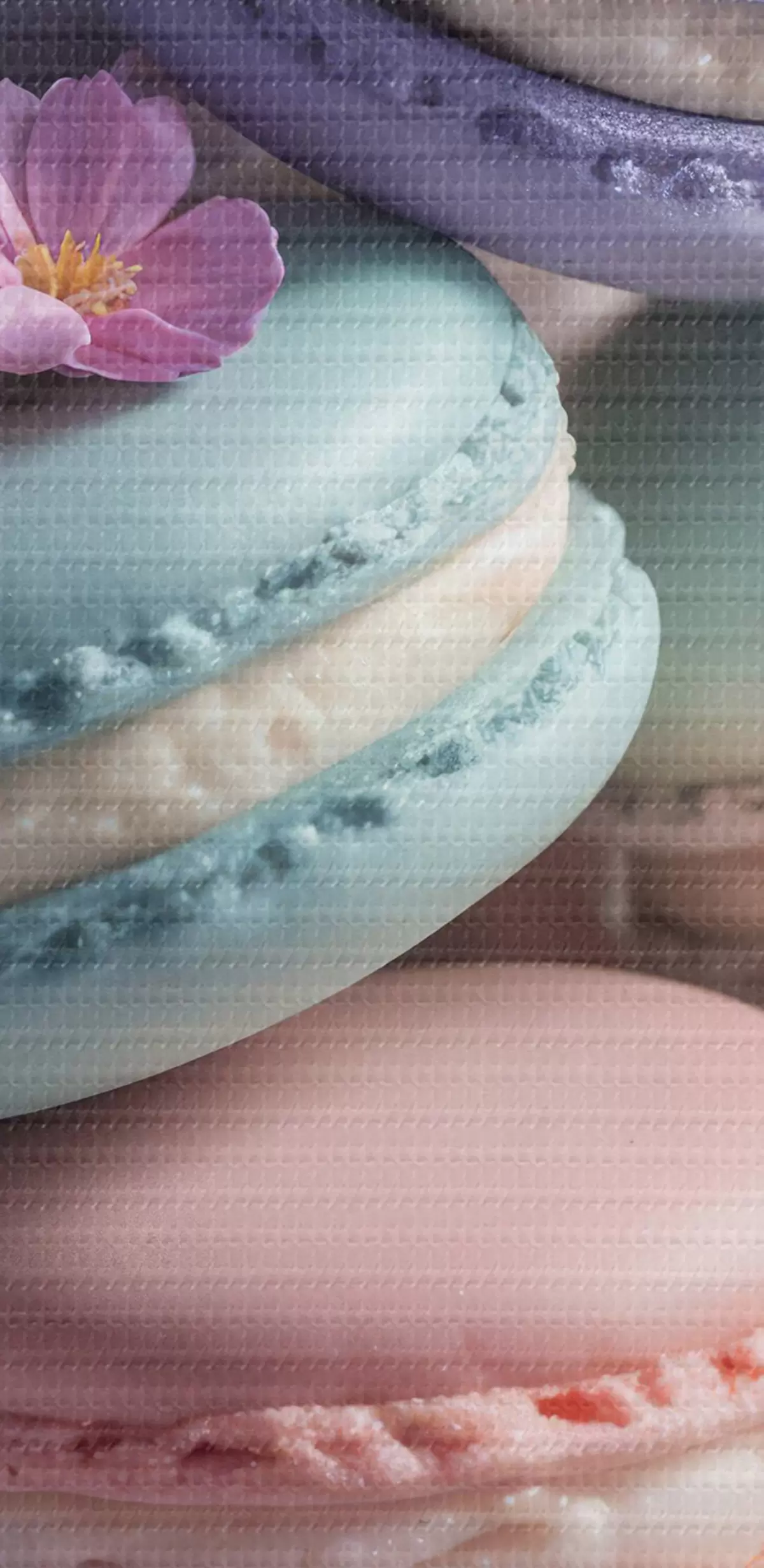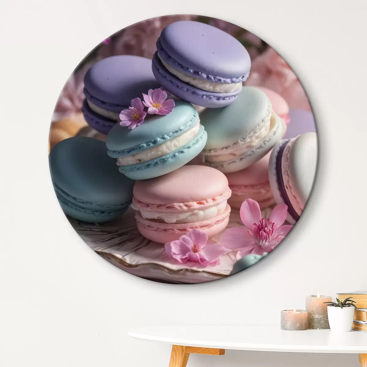 Obrázek Barevné makronky s růžovými a fialovými květy na talíři, detailní záběr Nr r40546