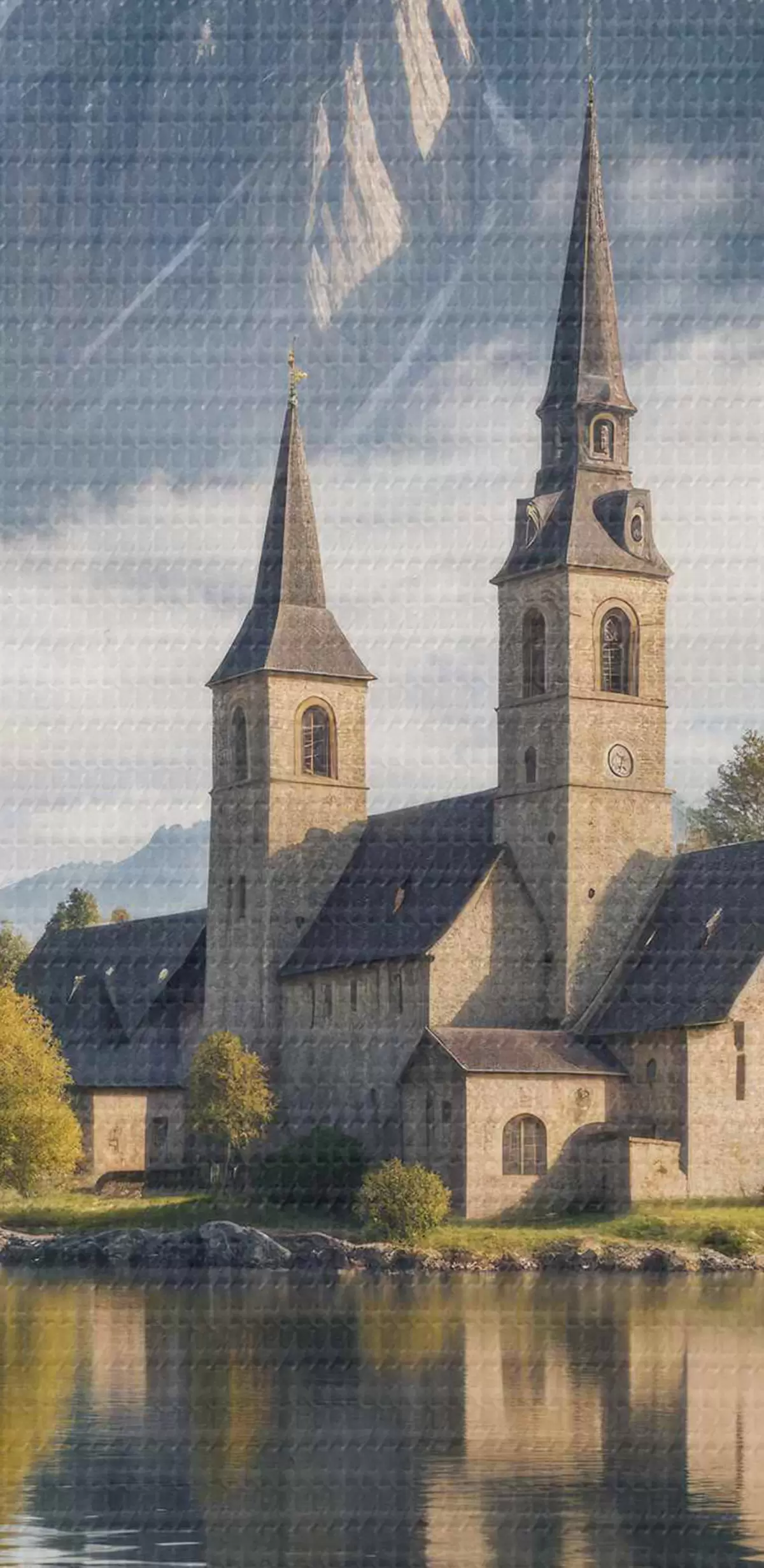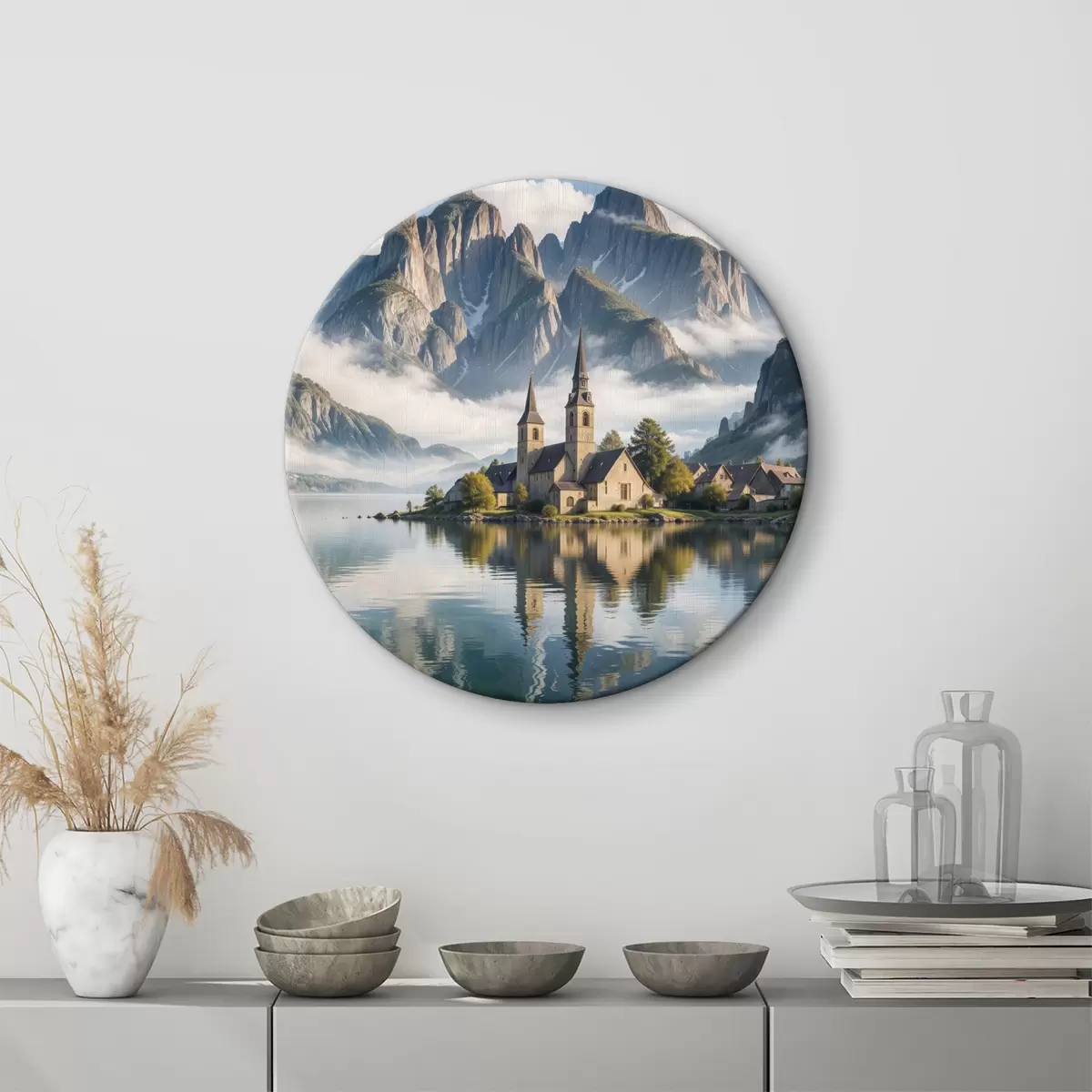 Obrázek Malebná alpská vesnička u klidného jezera, nad kterým se tyčí zasněžené hory Nr r40554