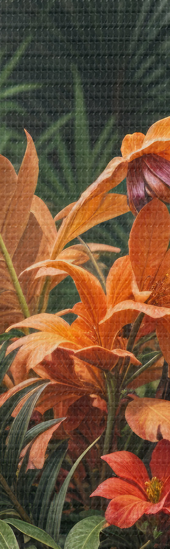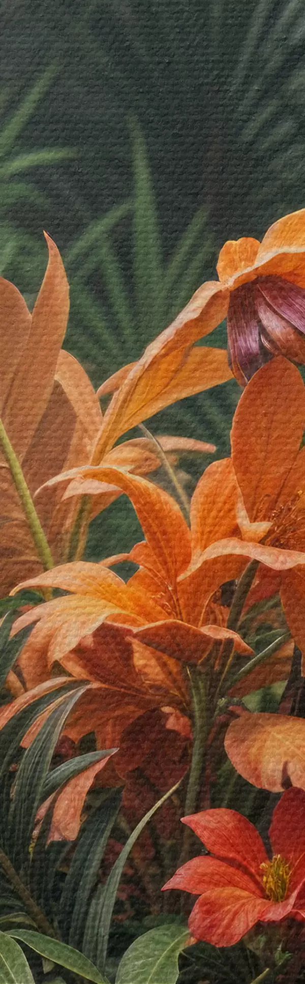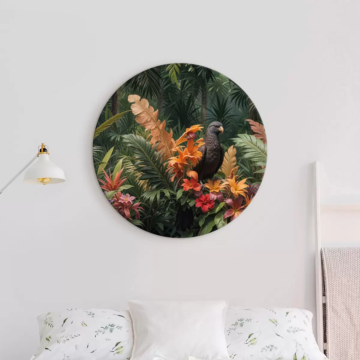 Obrázek Tropický pták sedící na větvi obklopený bujnou vegetací, palmovými listy, květinami a exotickými rostlinami Nr r40578
