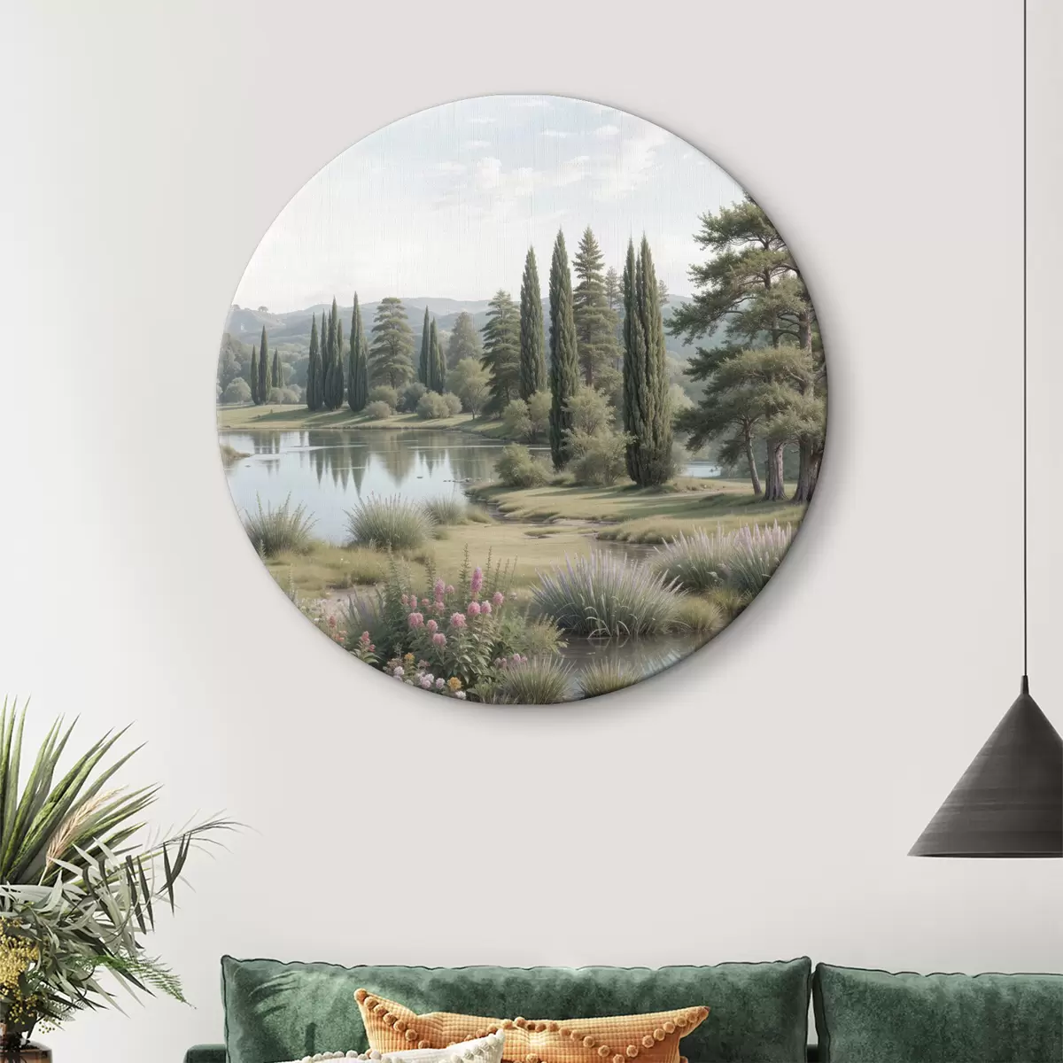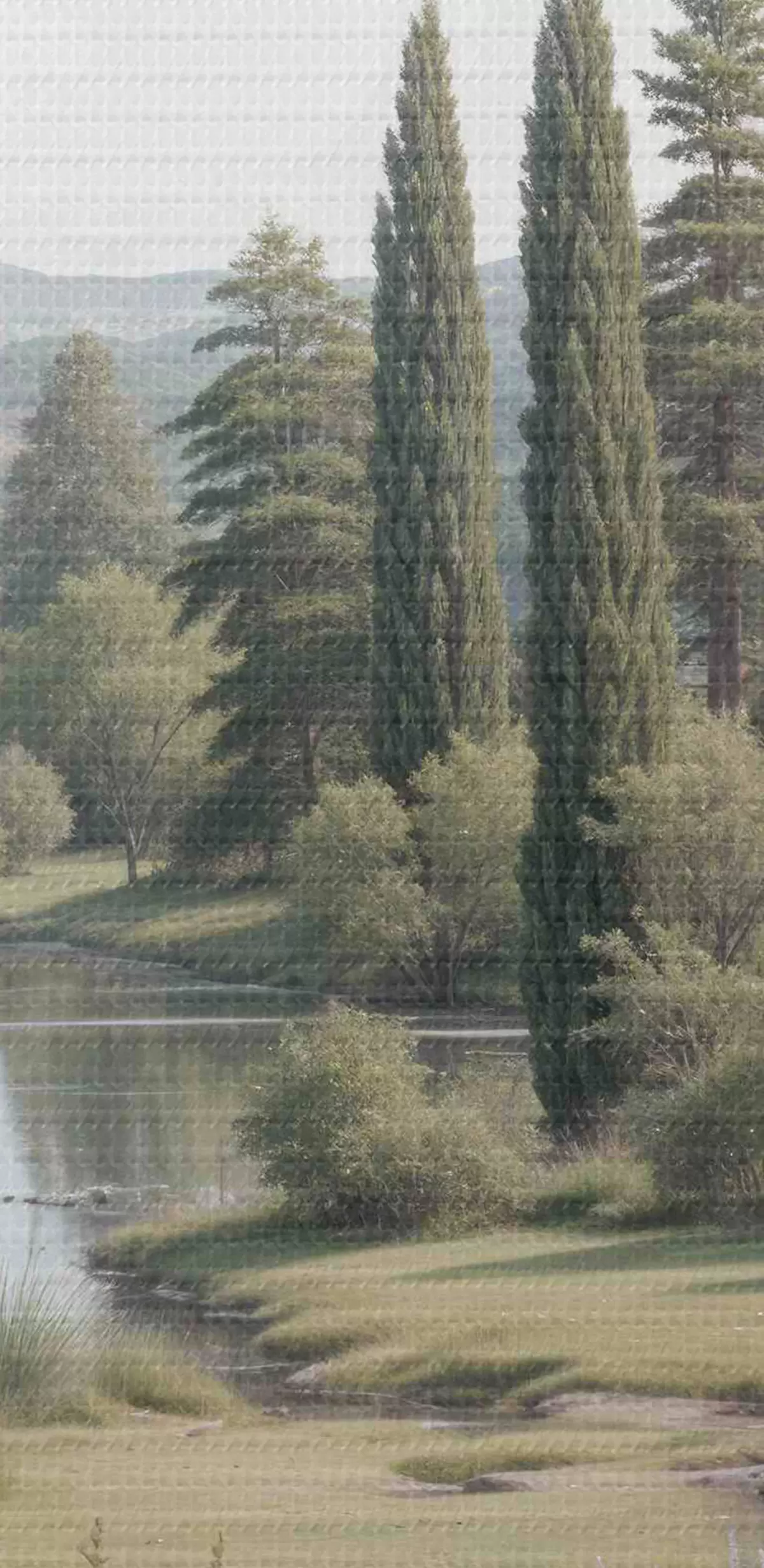 Obrázek Klidná krajina s tichým jezerem obklopeným borovicemi, cypřiši a další bujnou vegetací Nr r40579