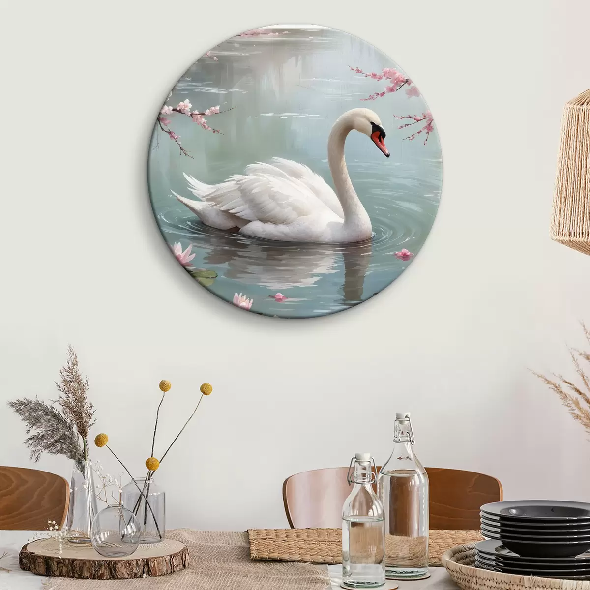 Obrázek Půvabná bílá labuť plavající v klidném rybníku obklopeném rozkvetlými růžovými třešněmi Nr r40597