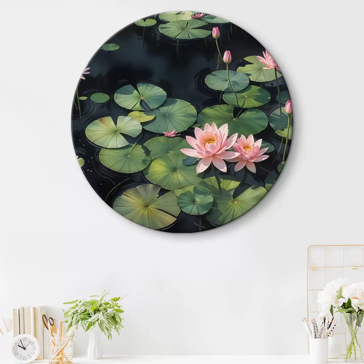 Obrázek Rybník s růžovými lekníny a zelenými okvětními lístky lilií plovoucími na hladině, obklopený tmavým pozadím Nr r40598