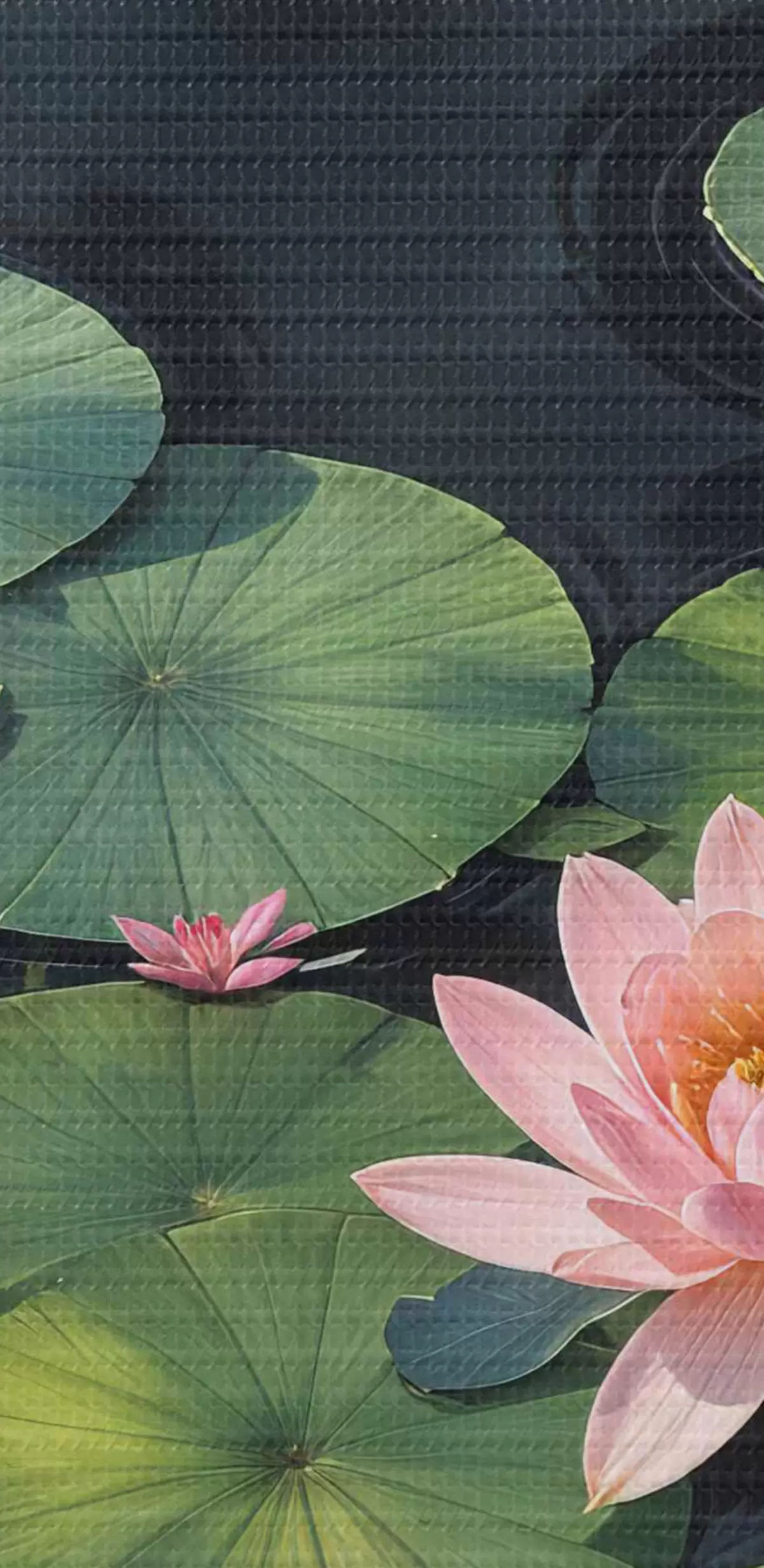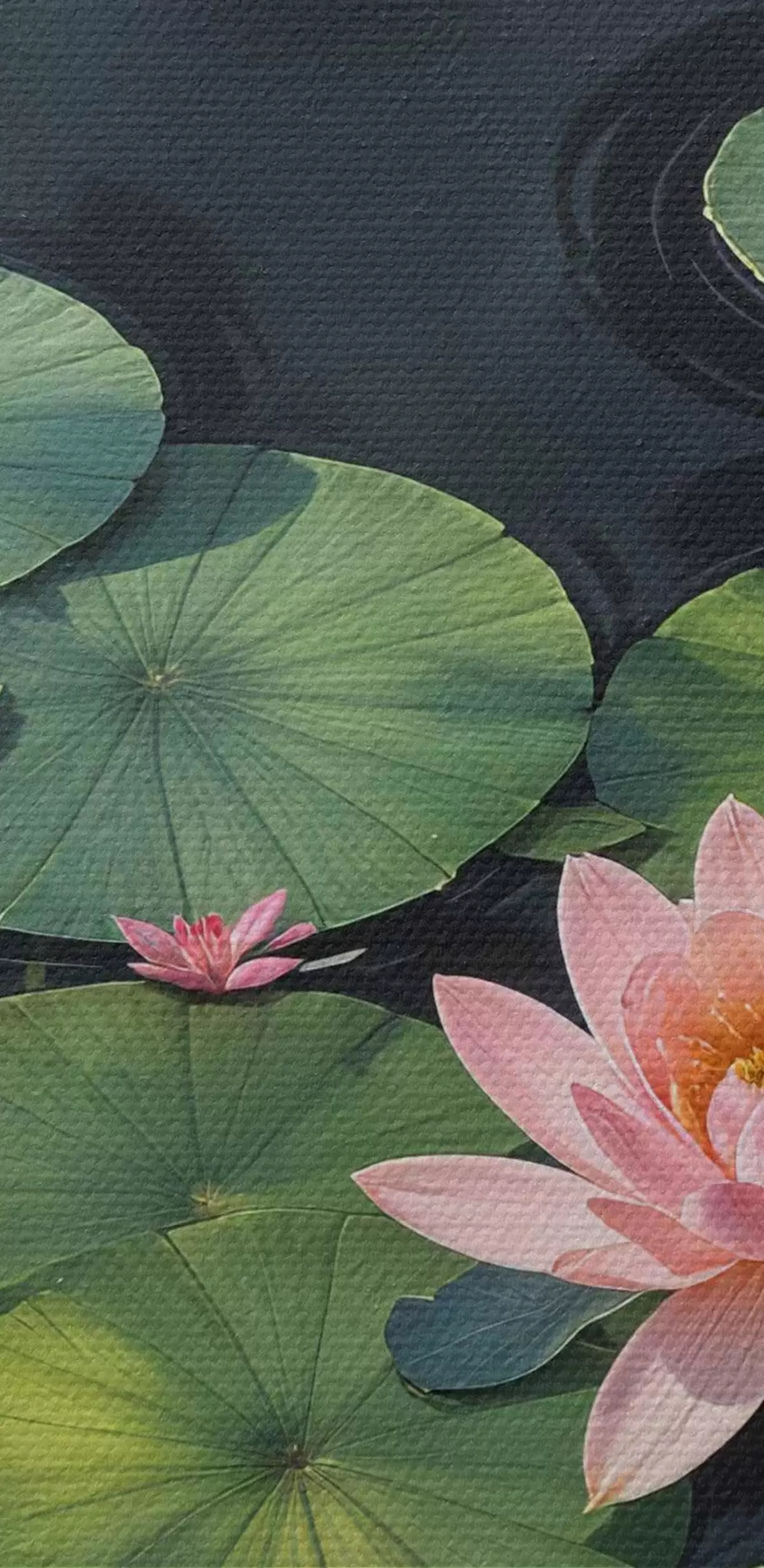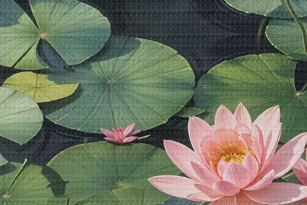 Obrázek Rybník s růžovými lekníny a zelenými okvětními lístky lilií plovoucími na hladině, obklopený tmavým pozadím Nr r40598