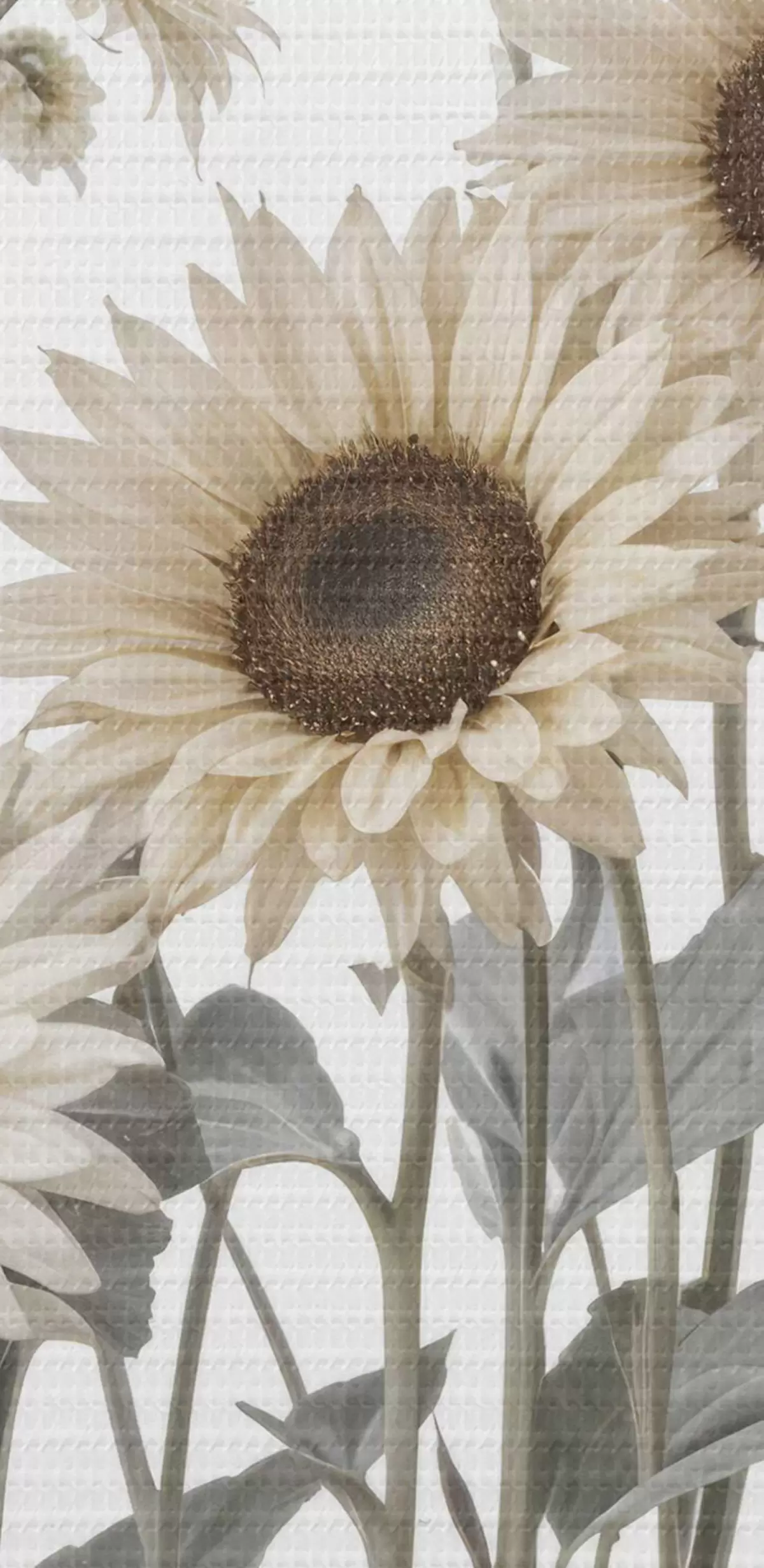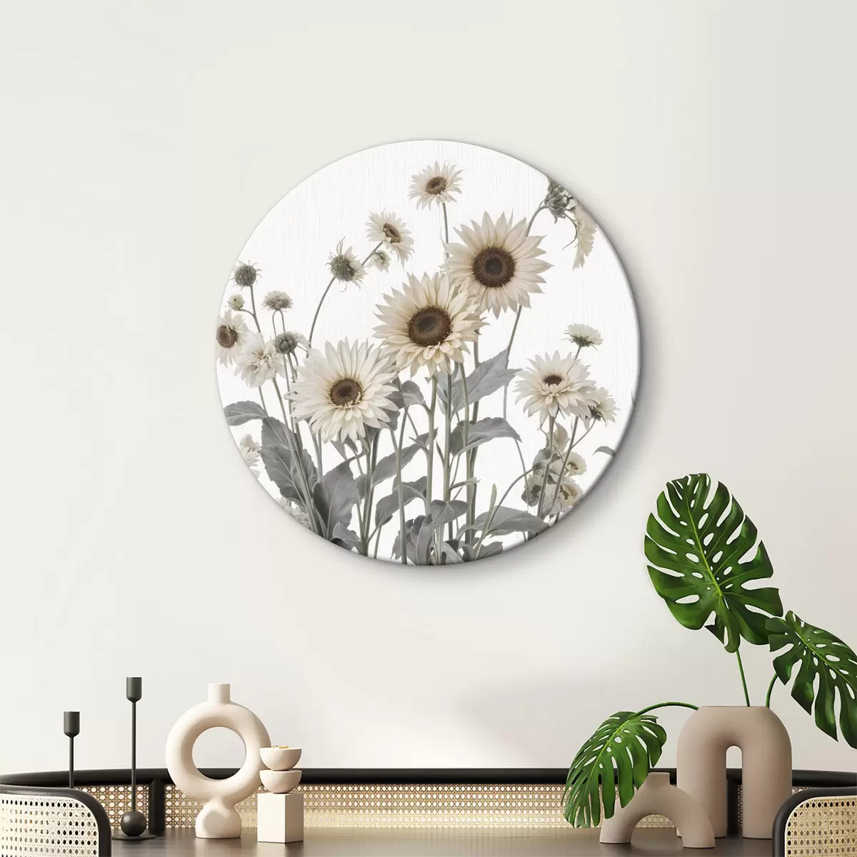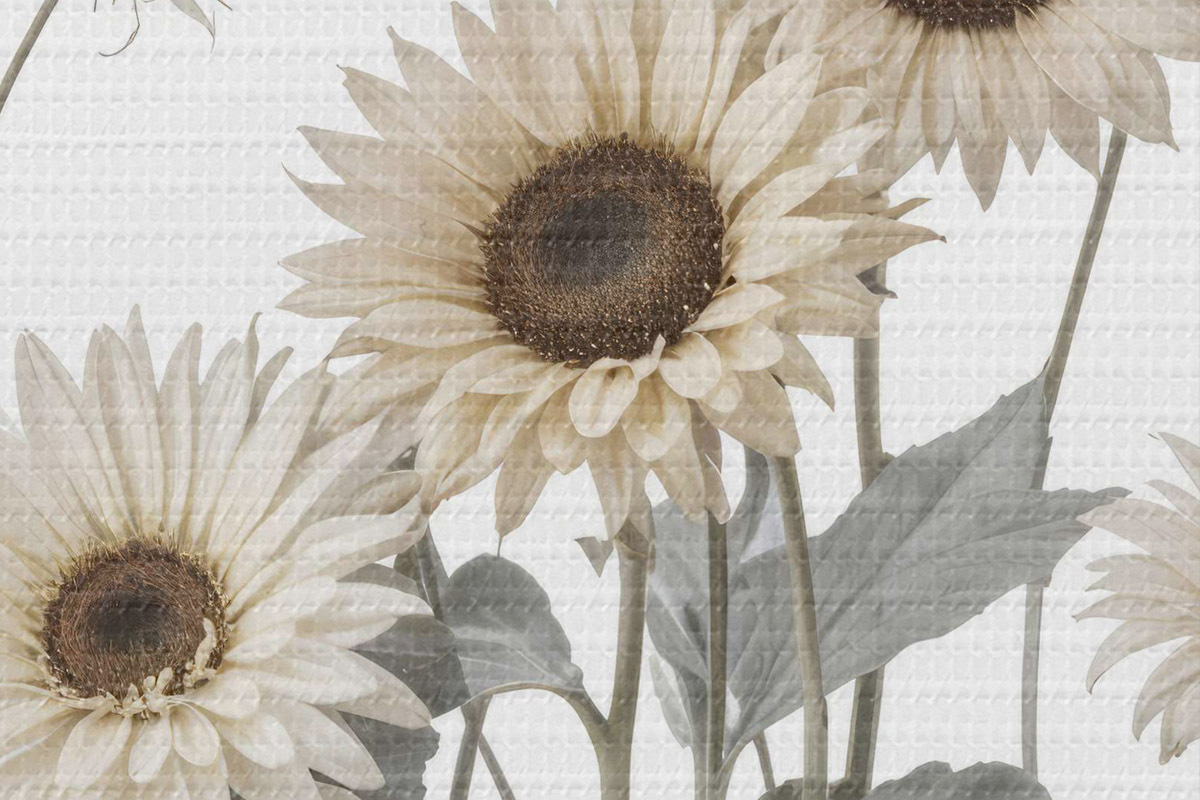 Obrázek Pole bílých květů sedmikrásek na bílém pozadí, v pozadí jsou vidět slunečnice Nr r40602