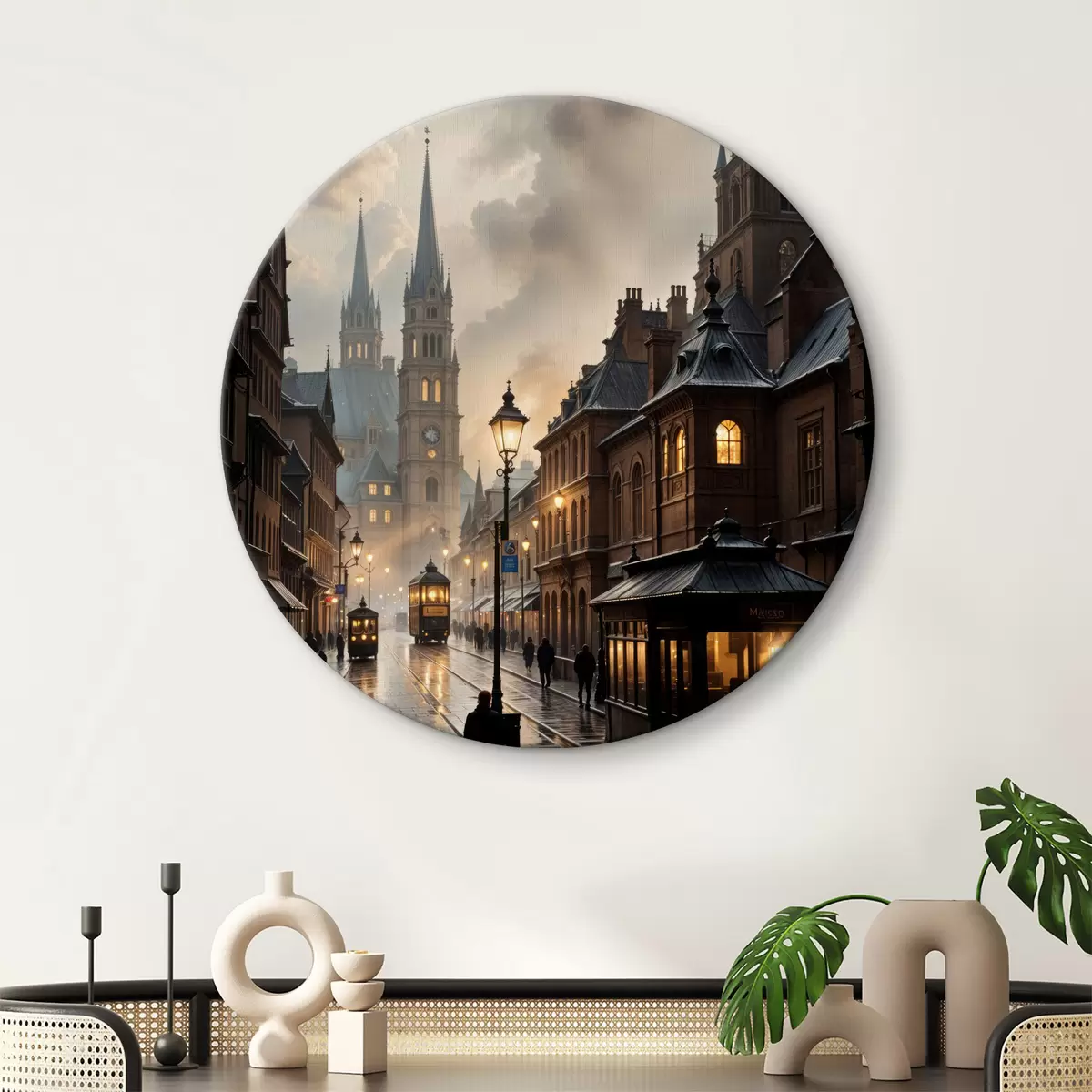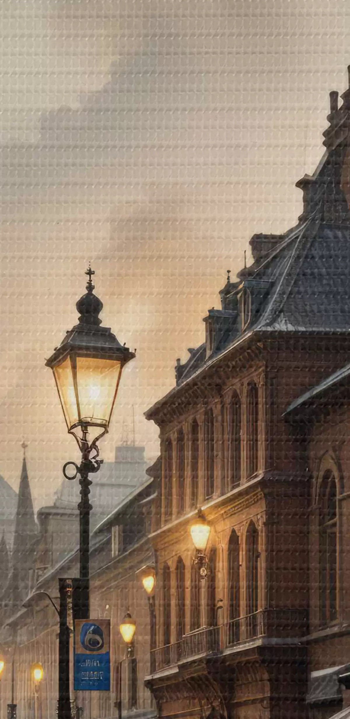 Obrázek Deštivý večer ve starém evropském městě s dlážděnými ulicemi, historickými budovami a projíždějící tramvají Nr r40604
