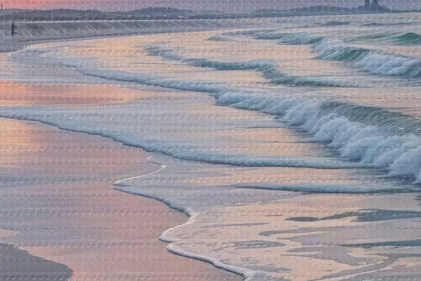 Obrázek Klidná scéna na pláži při západu slunce s jemnými vlnami šplouchajícími na písečném pobřeží Nr r40606