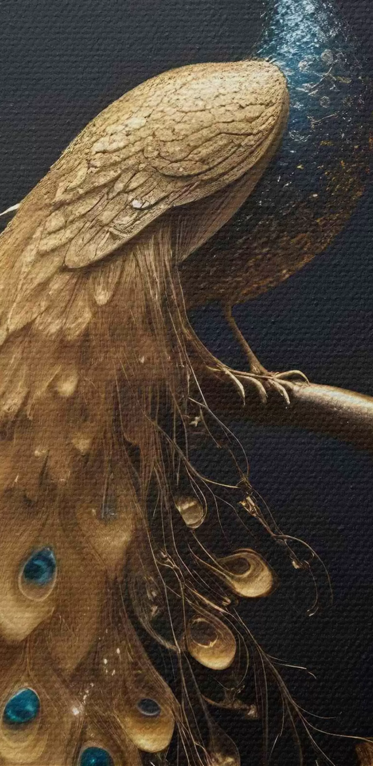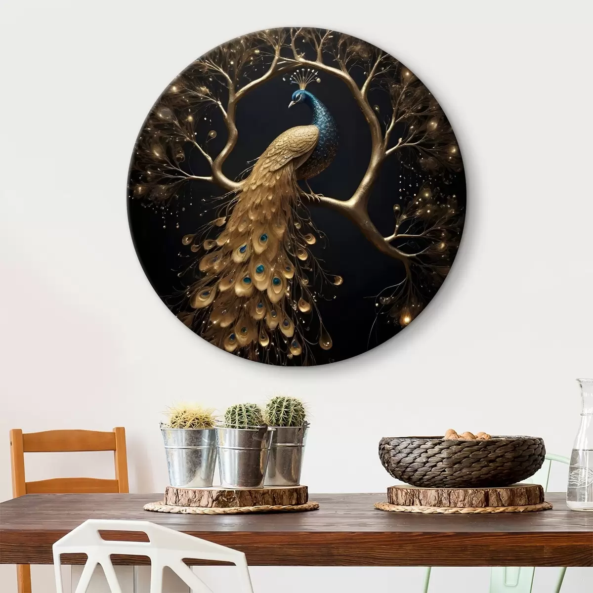 Obrázek Páv s pestrým peřím sedící na větvi na tmavém pozadí se zářícími stromy Nr r40612