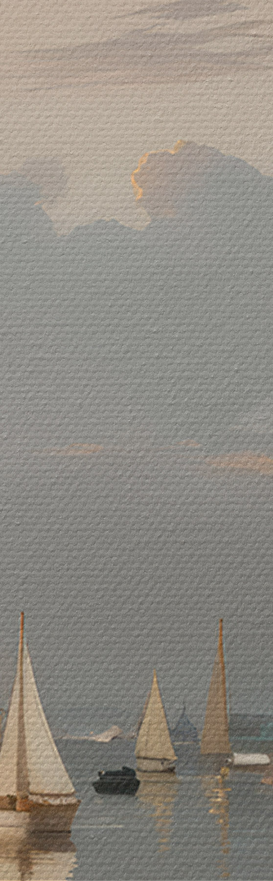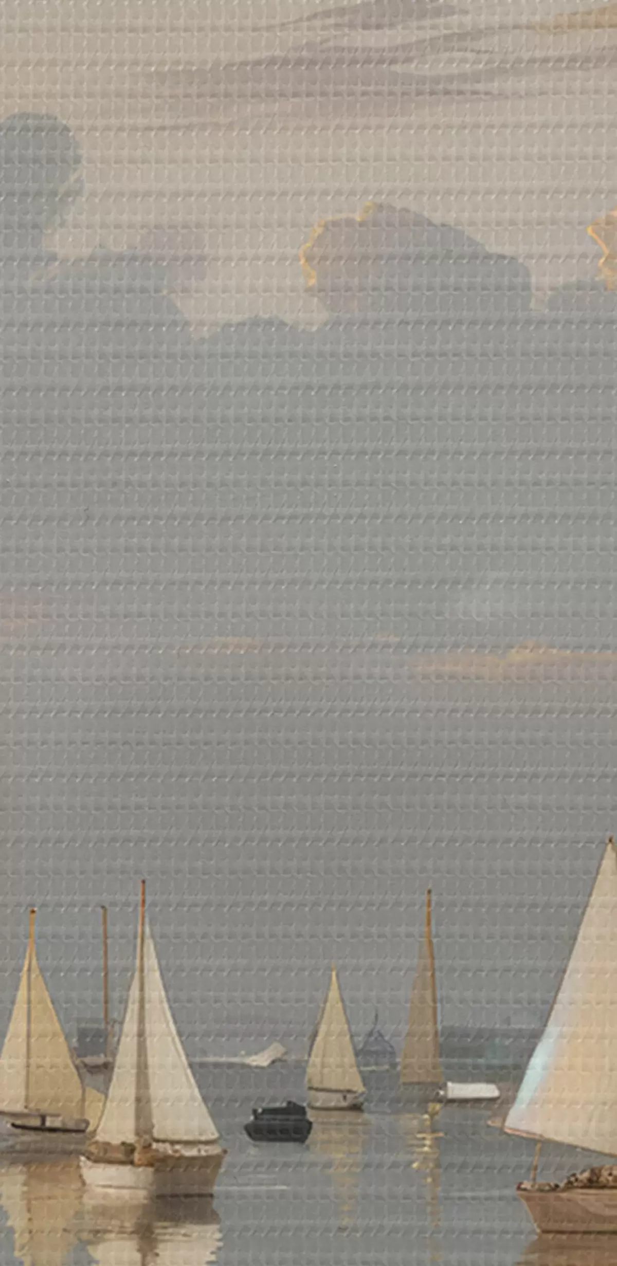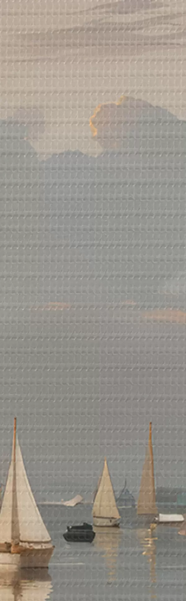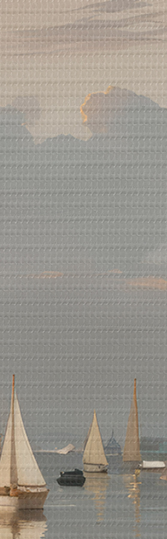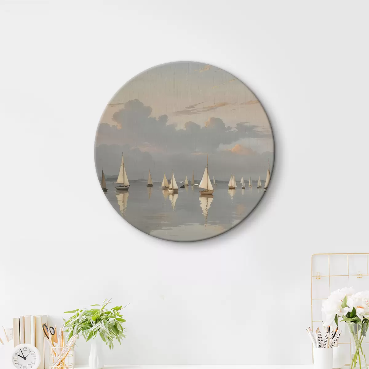 Obrázek Flotila bílých plachetnic na klidné vodní ploše, v níž se zrcadlí západ slunce, se zataženou oblohou v pozadí Nr r40615